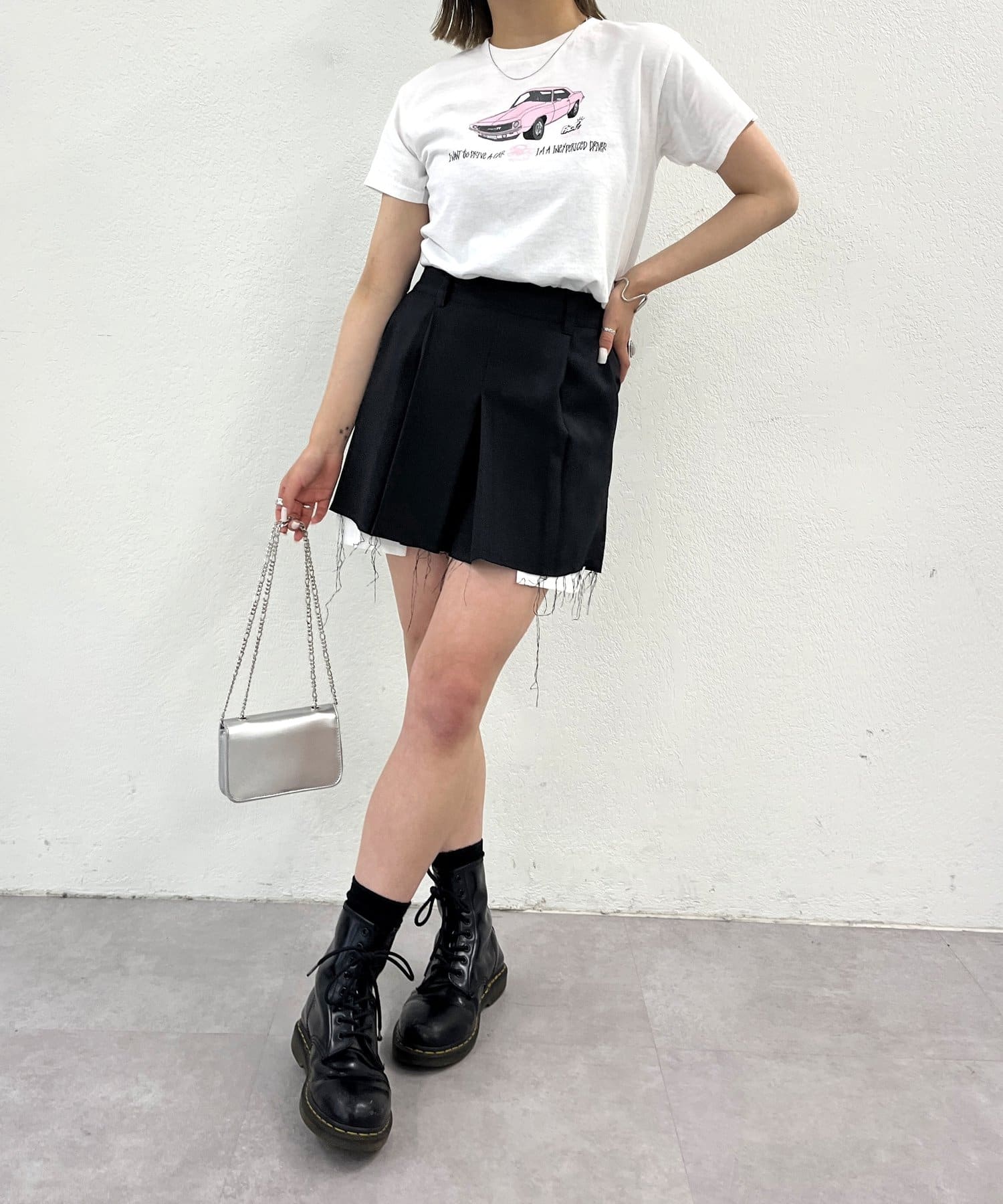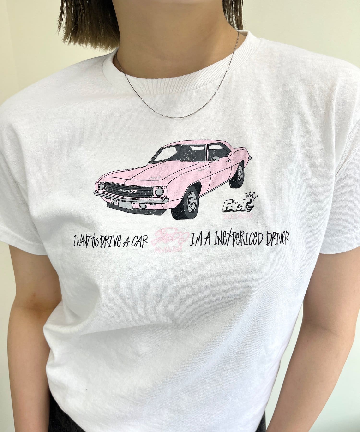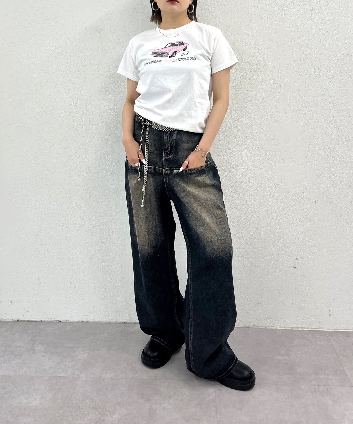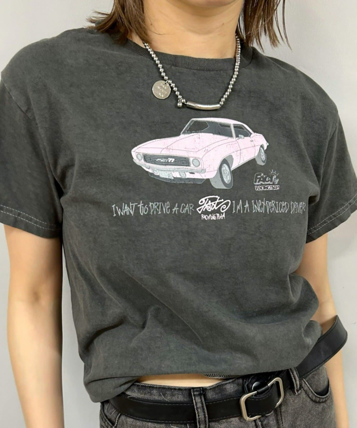 ・フロントの車のデザインがポイント。かすれたプリントで古着感をプラス。