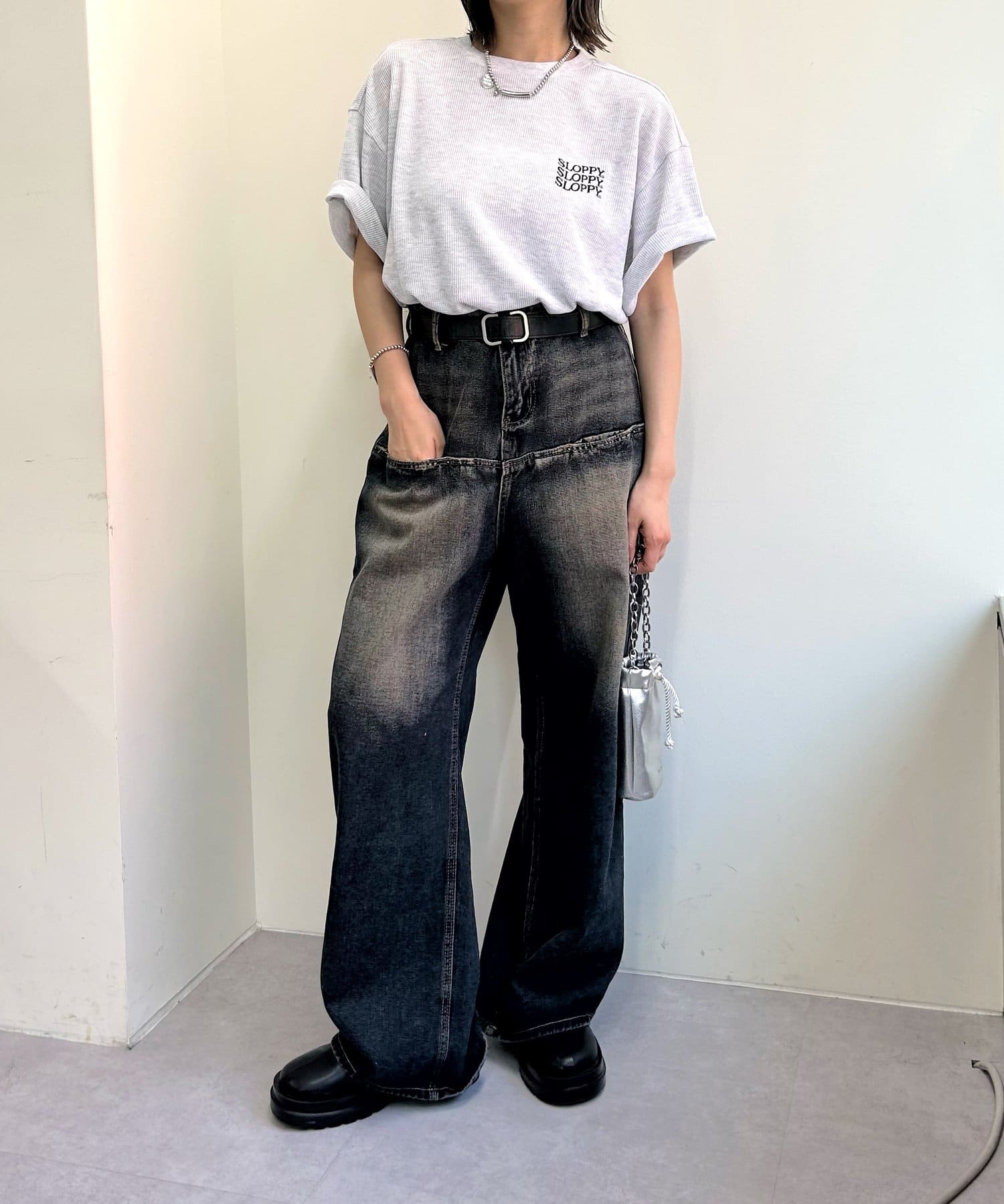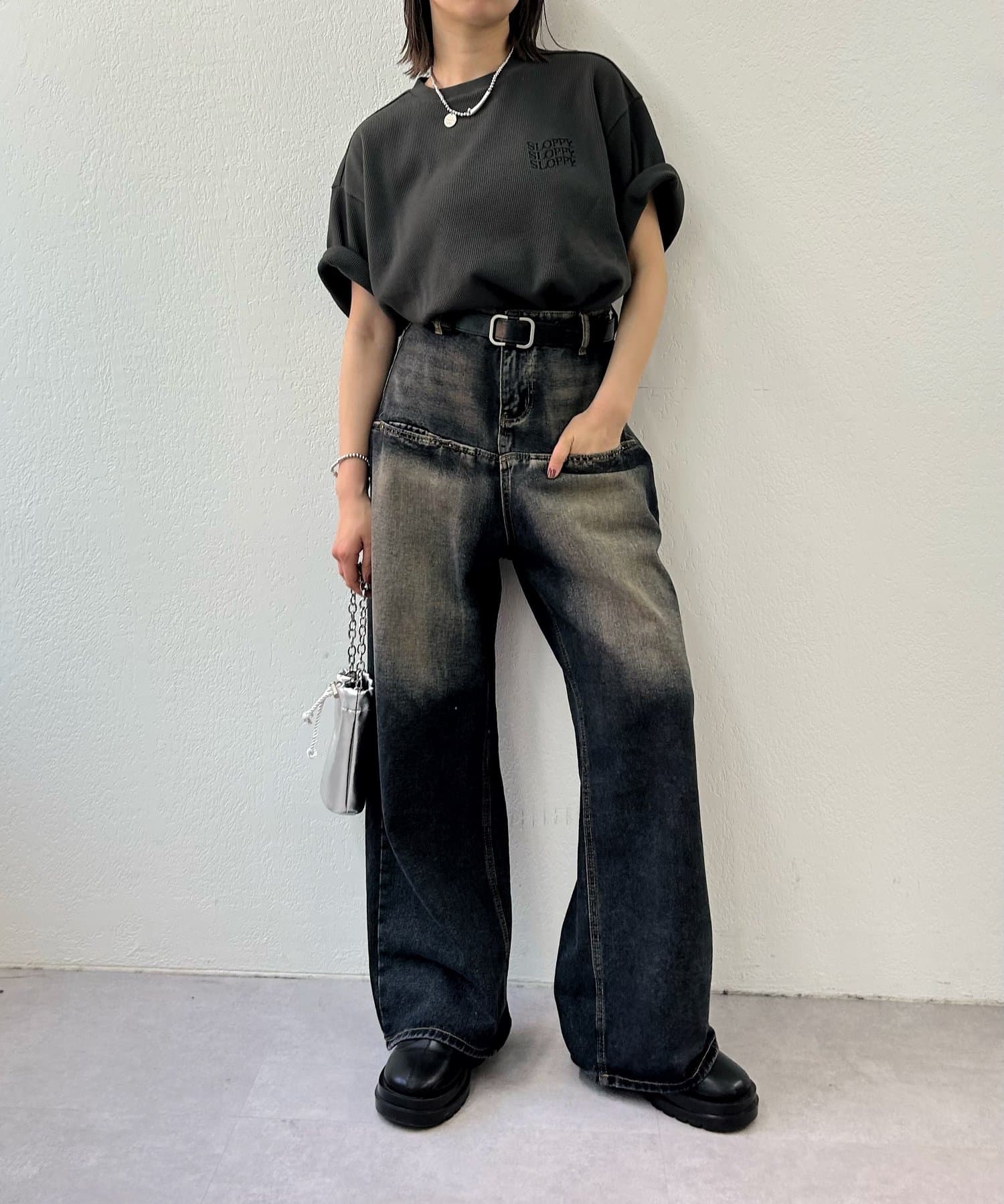 ・加工感のあるデニムと合わせてさらにトレンドスタイルに。
