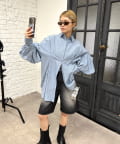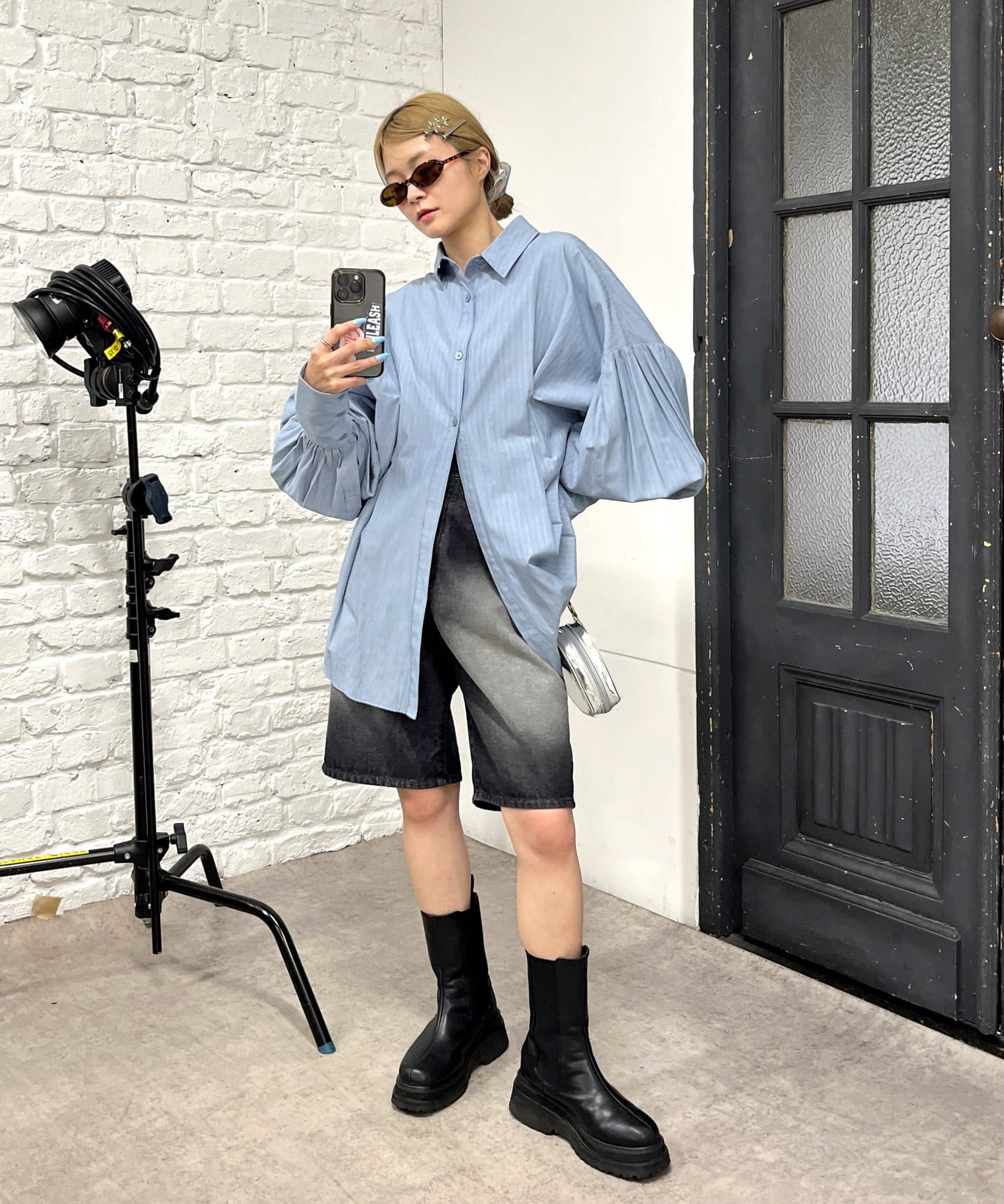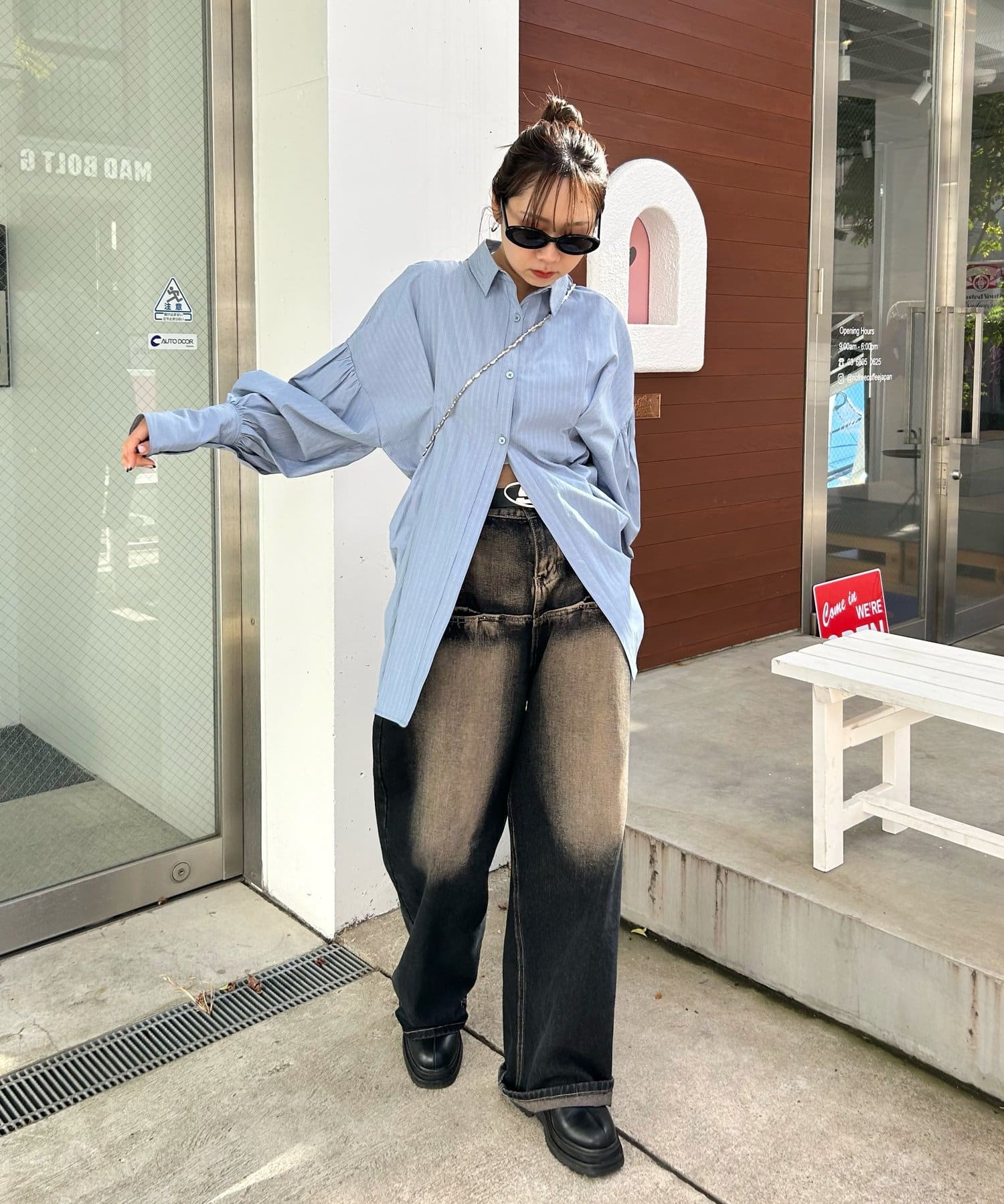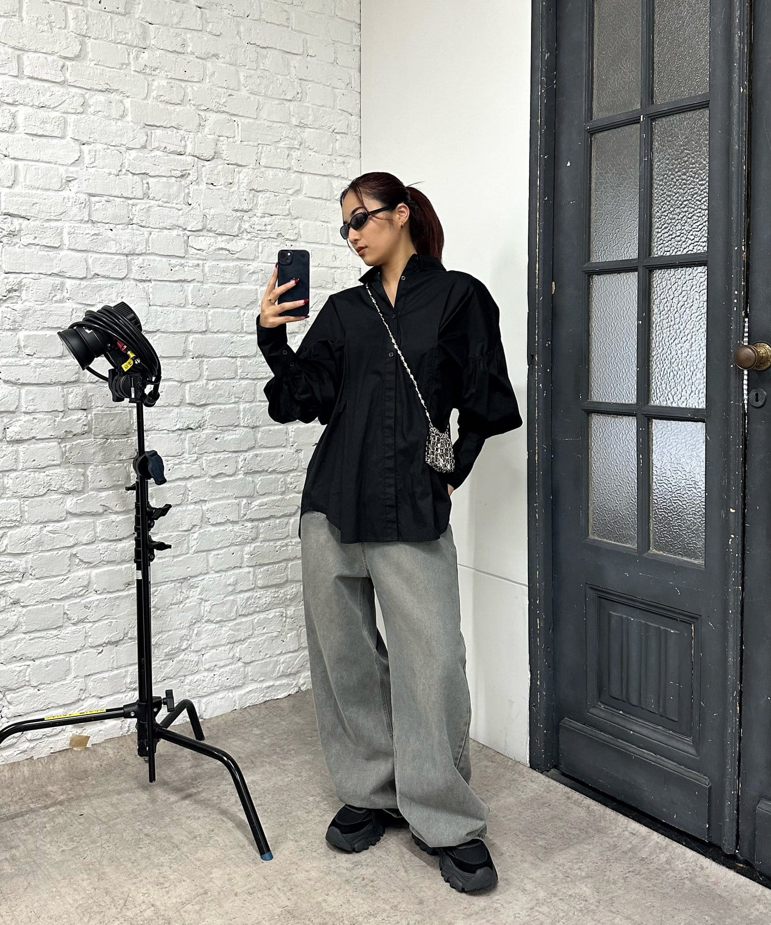①ギャザーを寄せずにノーマルなビッグシャツスタイル。