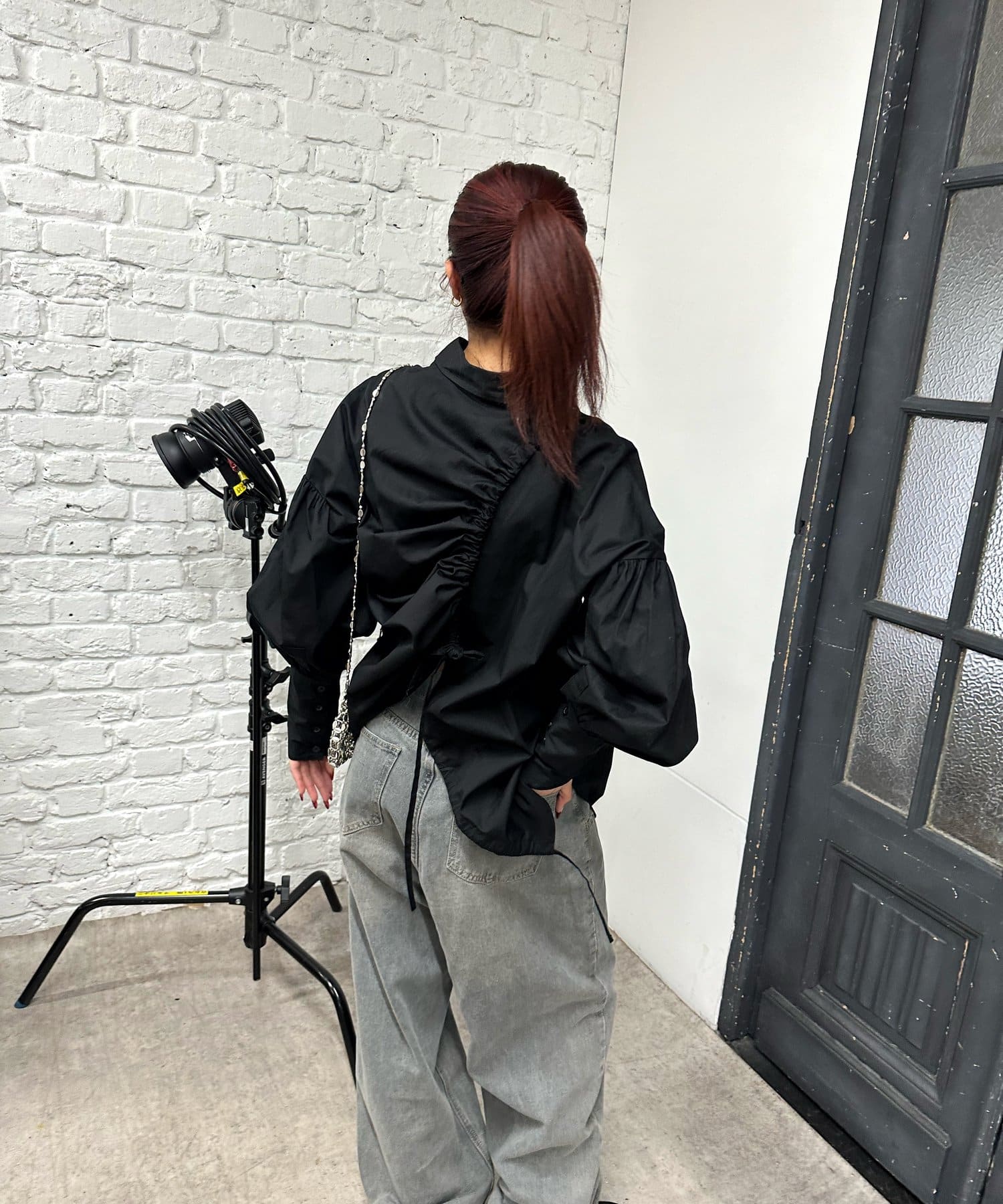 ②左側のギャザーのみ寄せて、アシンメトリーのデザインシャツに。