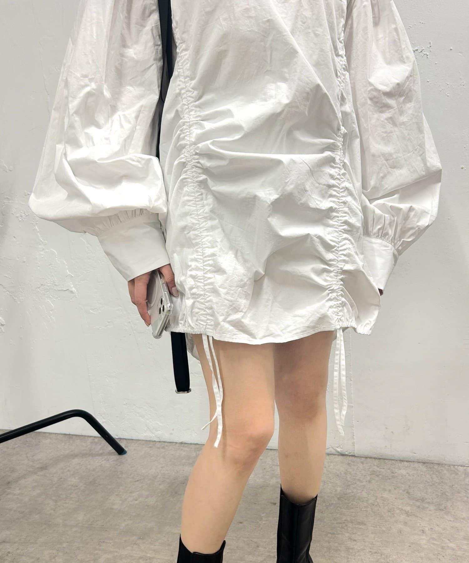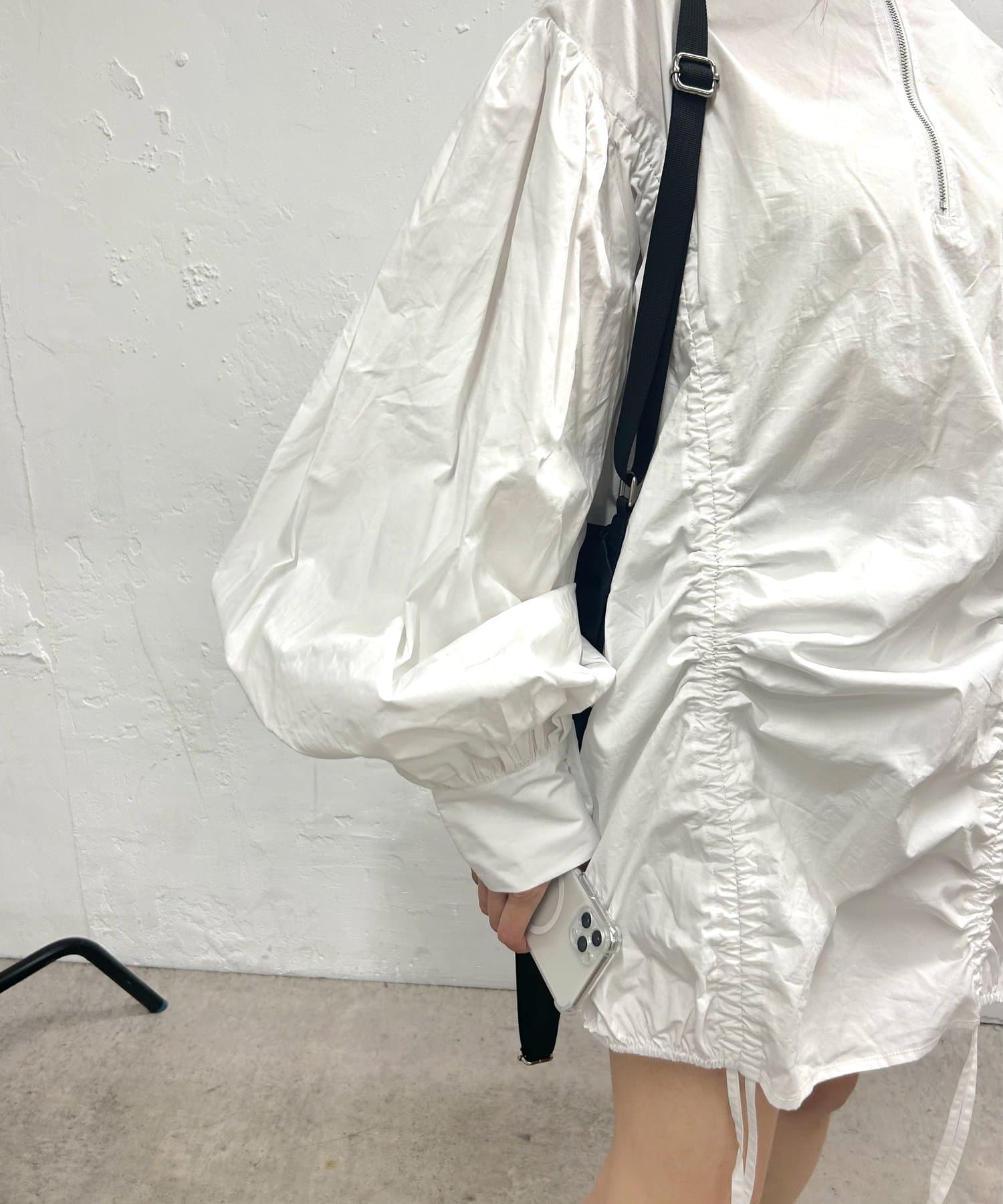 ・フロントのタックで丈感を調節可能。寄せた時のクシュっと感もオシャレ。