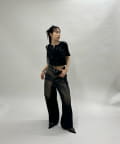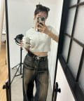 ハイウエストのパンツを合わせると安心してトレンドの着こなしを楽しむことができます。