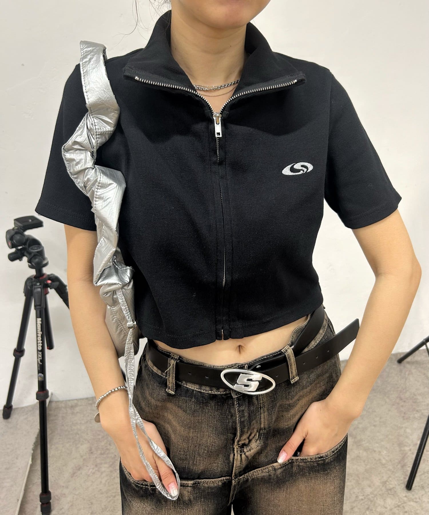 ・首元から裾まで伸びるファスナーは着脱衣しやすく、デザイン性も◎