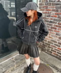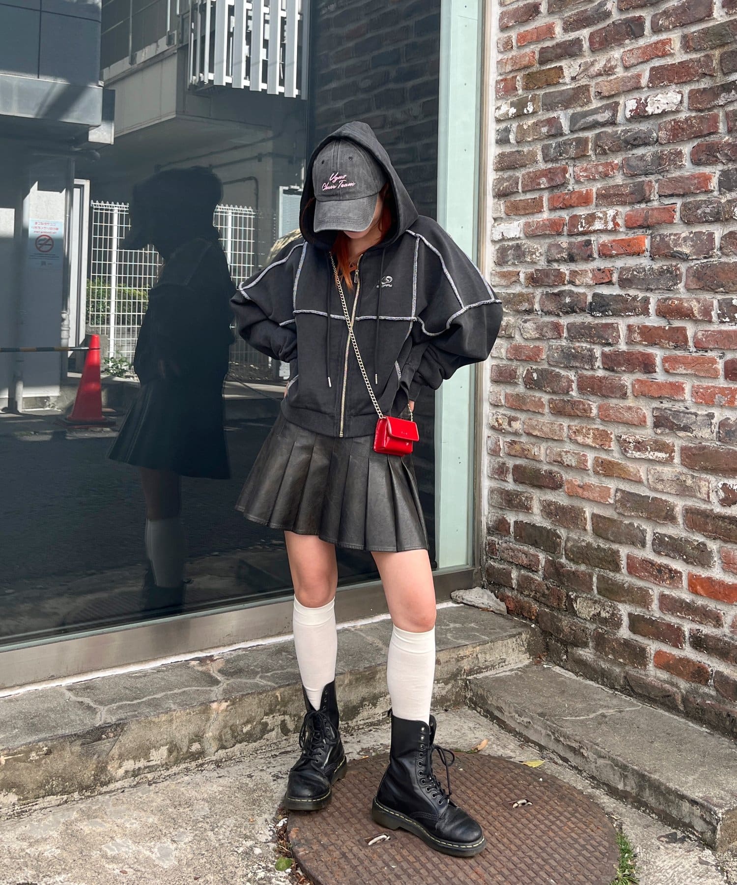 ・シンプルにミニスカートでの合わせも定番スタイリング。