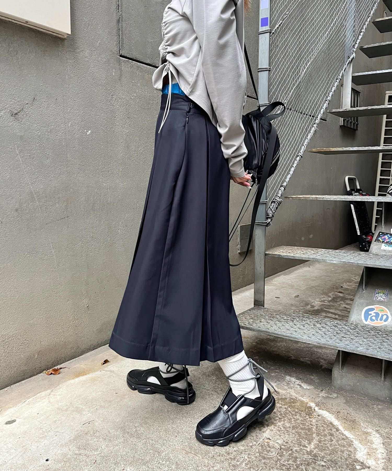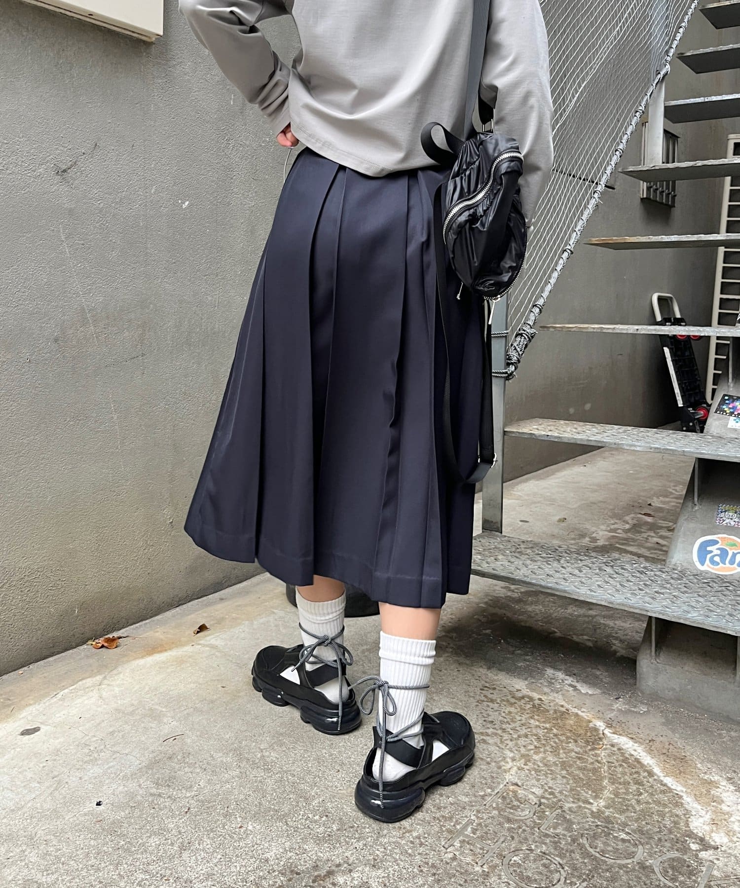 ・広がりすぎないシルエットでひざ下までの丈感が今っぽいプリーツスカート。