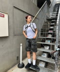・テック感のあるトップスとアメカジボトムスのミックススタイル。