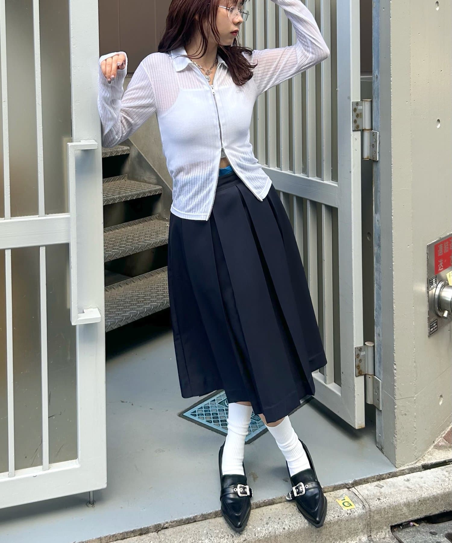 ・ダブルジップなので、下のジップをあけて少し肌見せしてあげるとスッキリとした印象に。