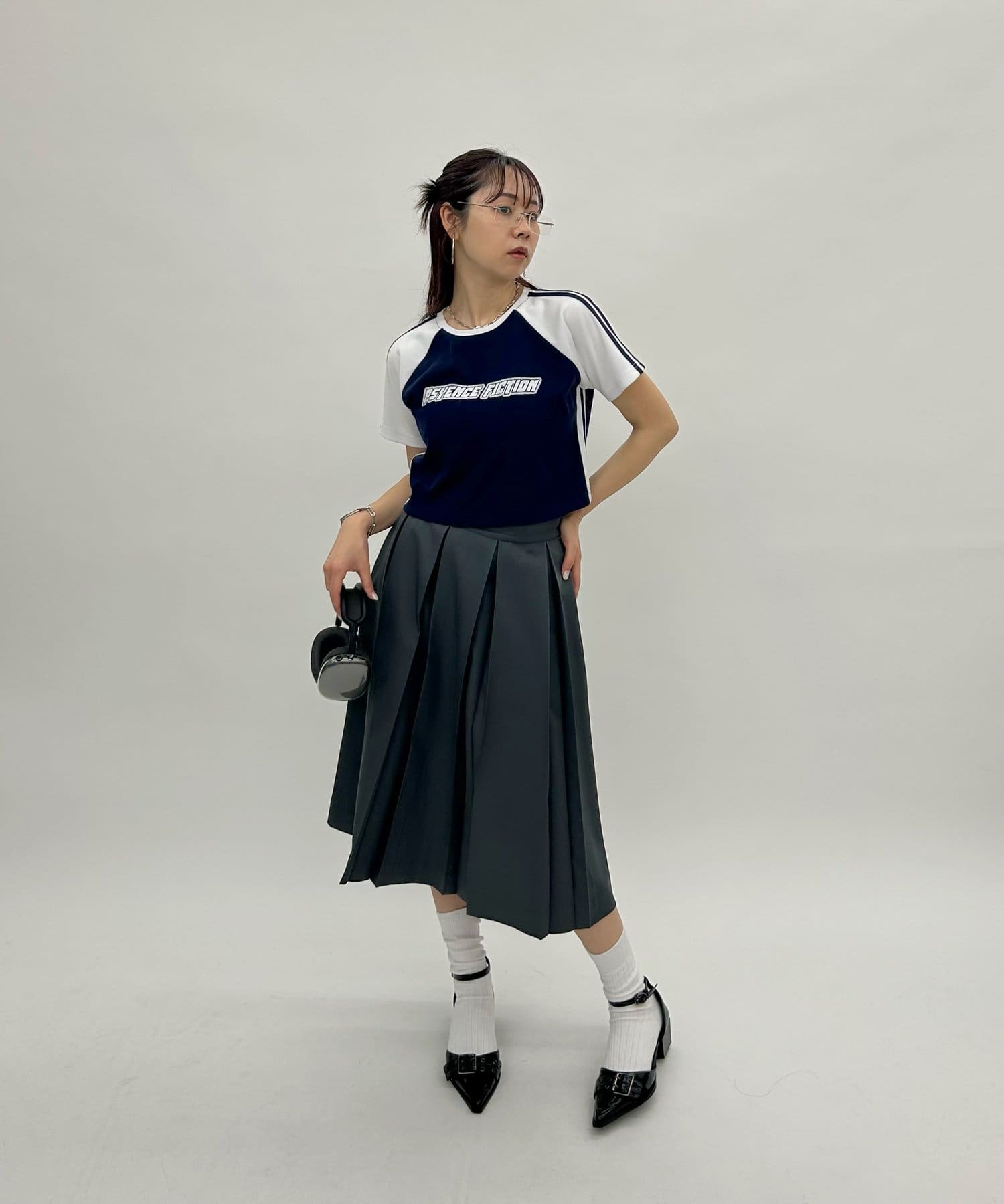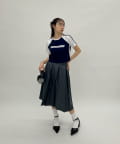 ・今季トレンドのミディ丈スカートでスクールライクにも。
