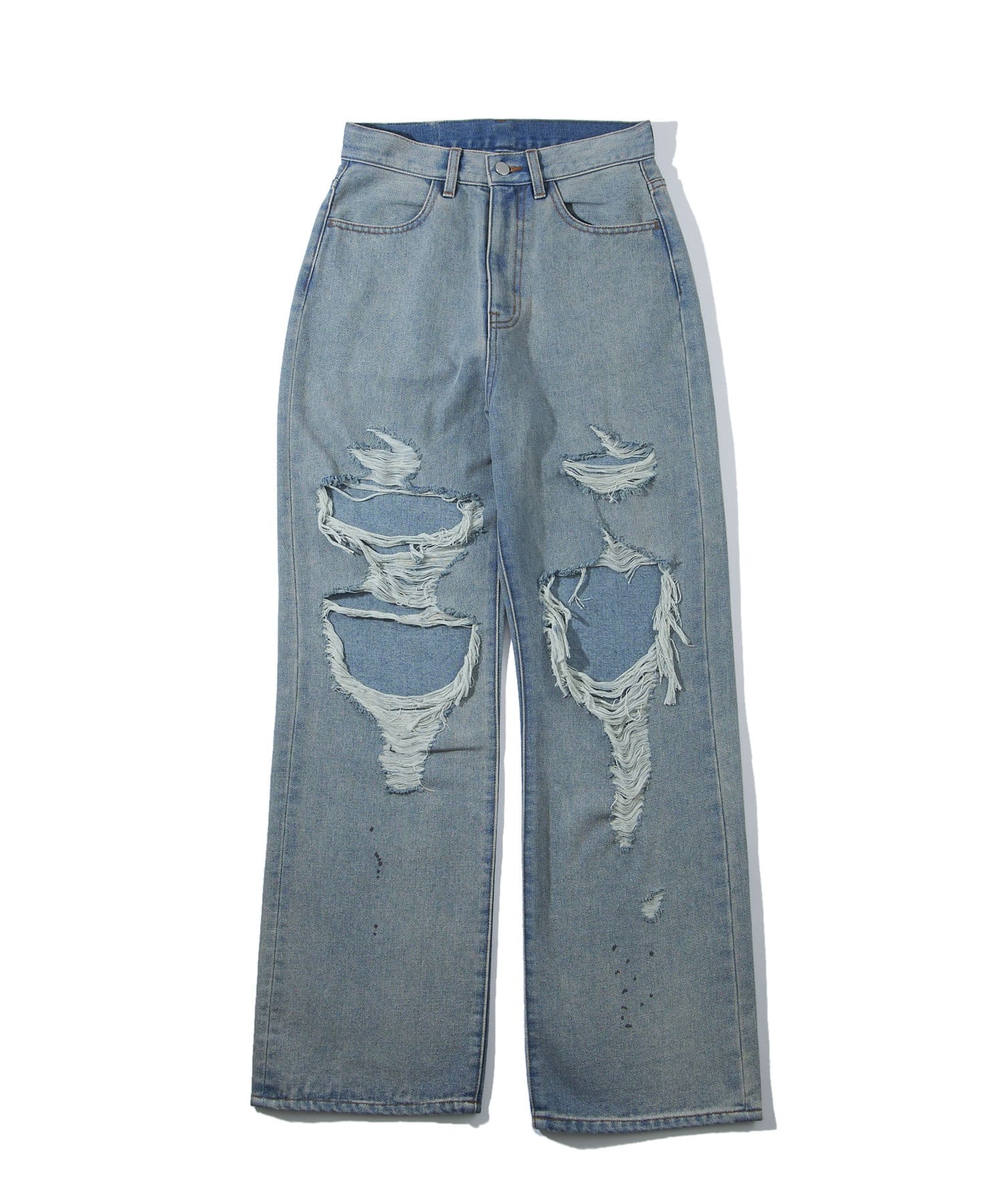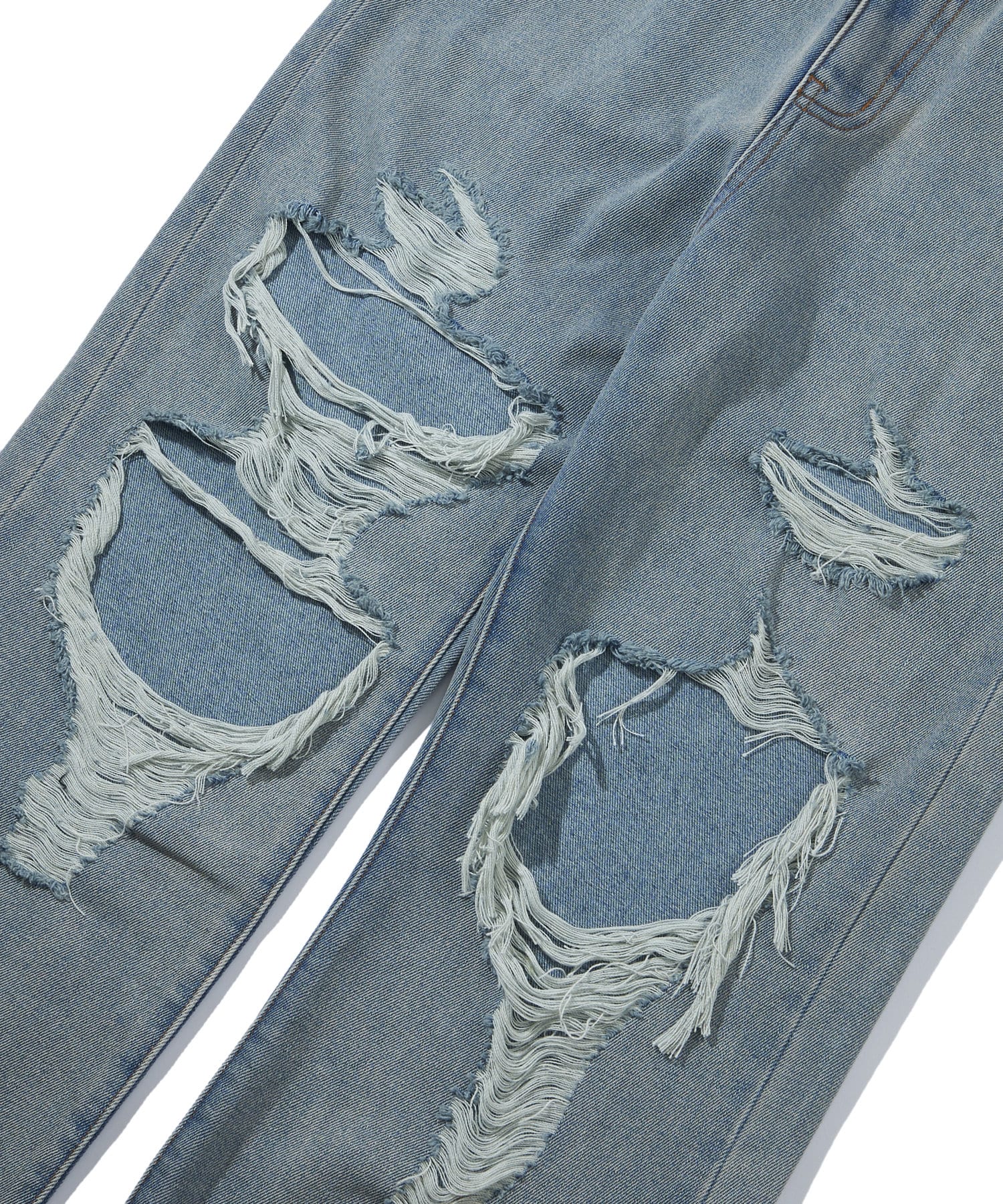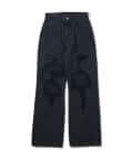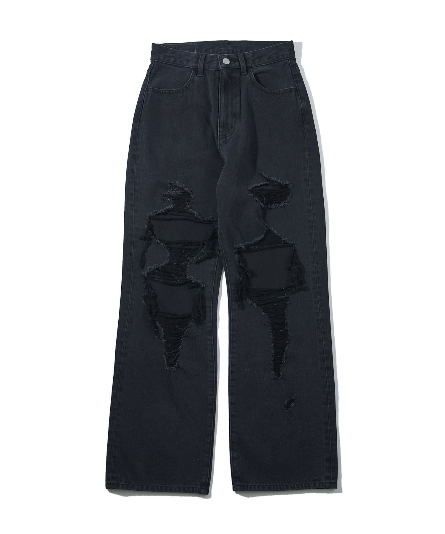 ・大胆なダメージ加工で裾付近のシミ加工がヴィンテージ溢れる一本。