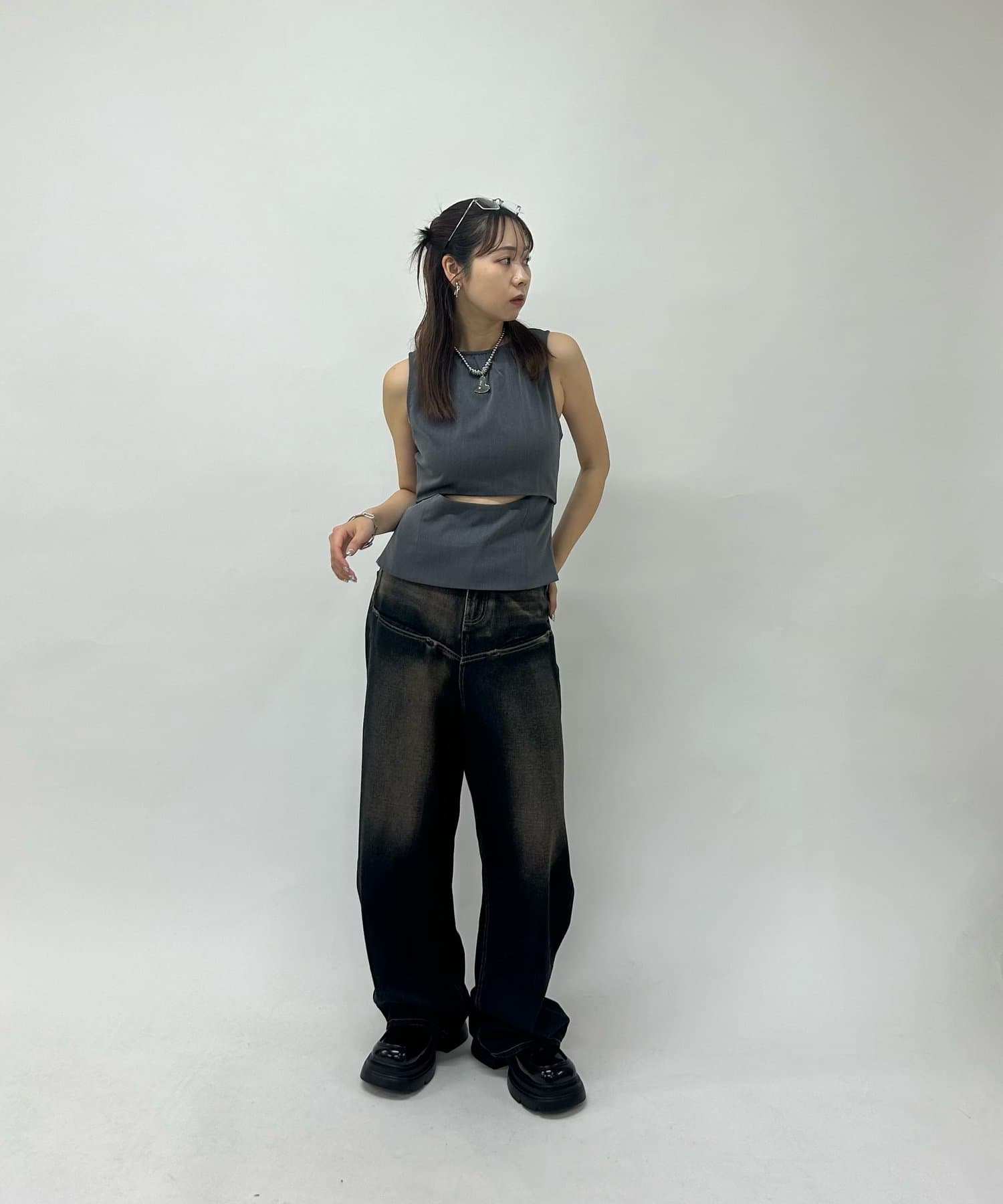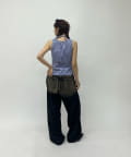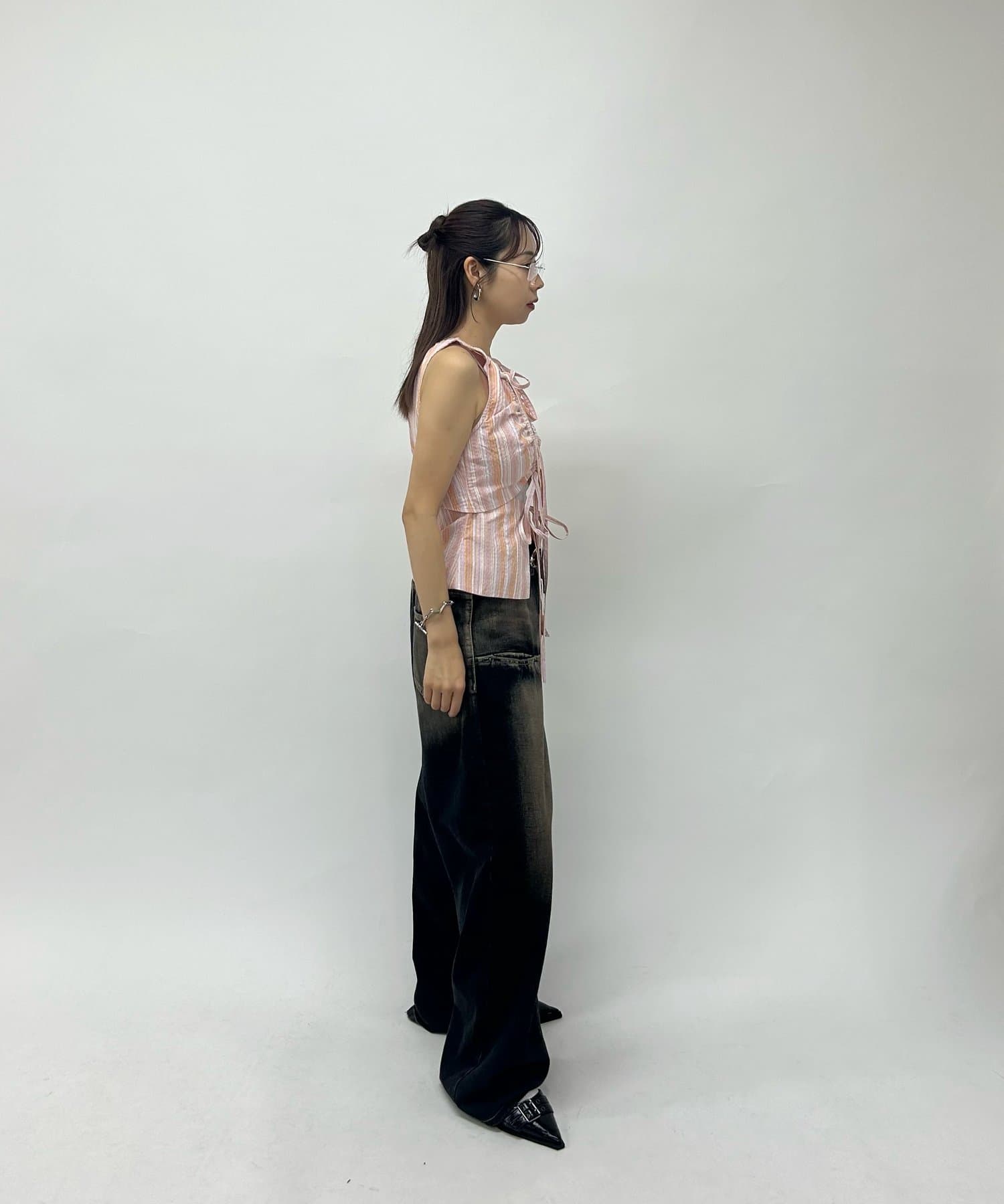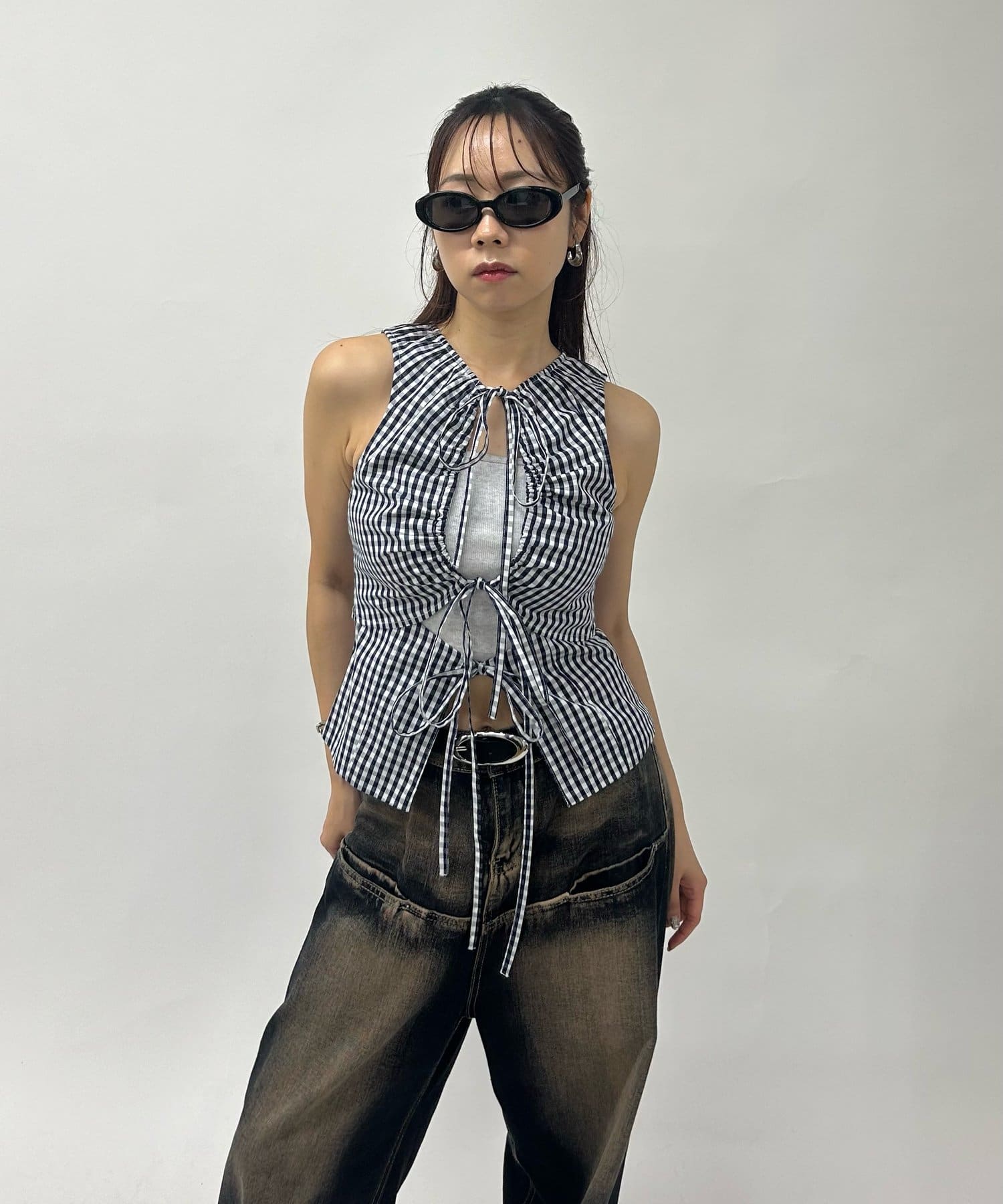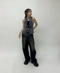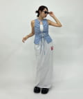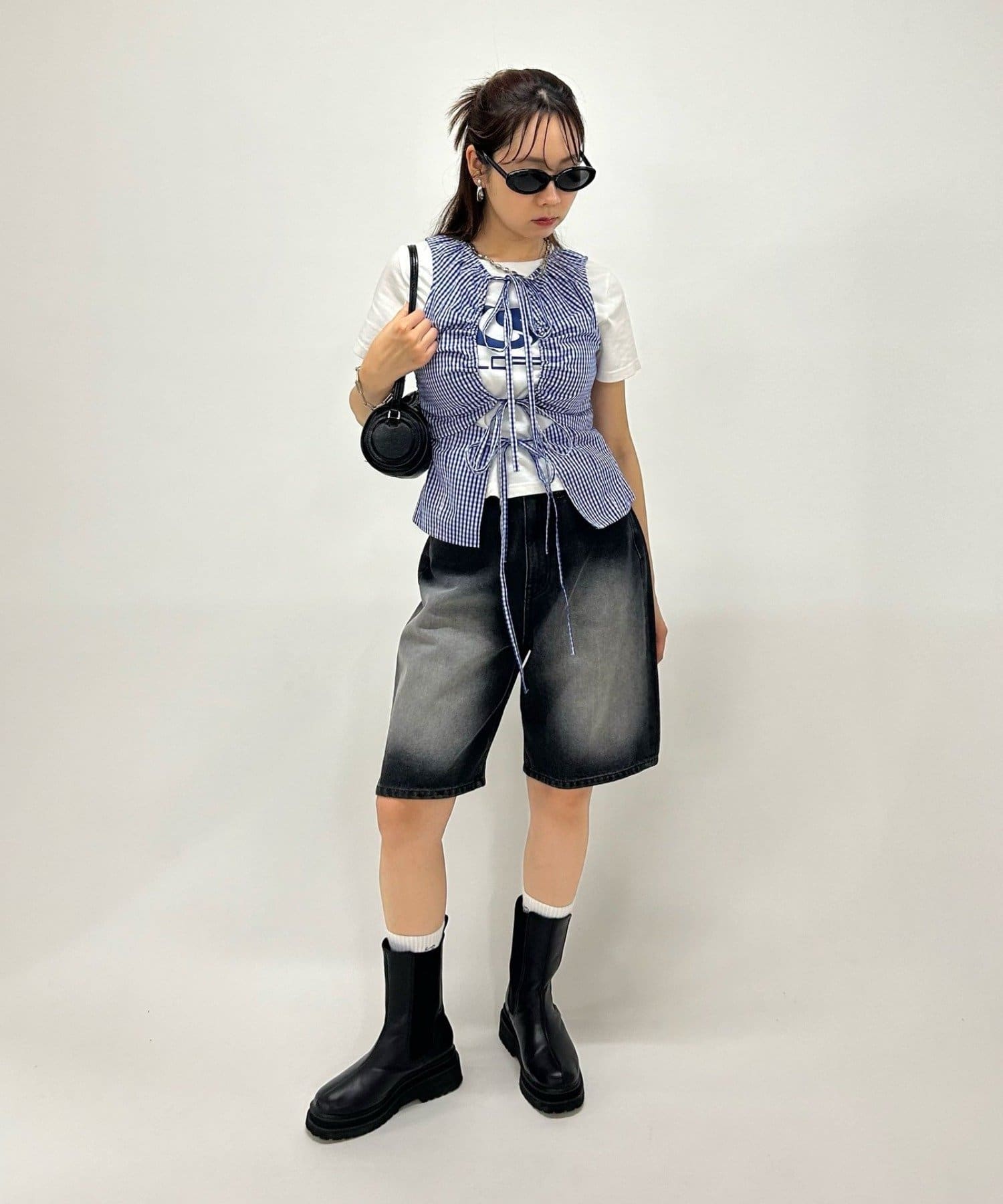 ・ガーリーなベストにはハーフデニムで甘辛ミックスコーデ。