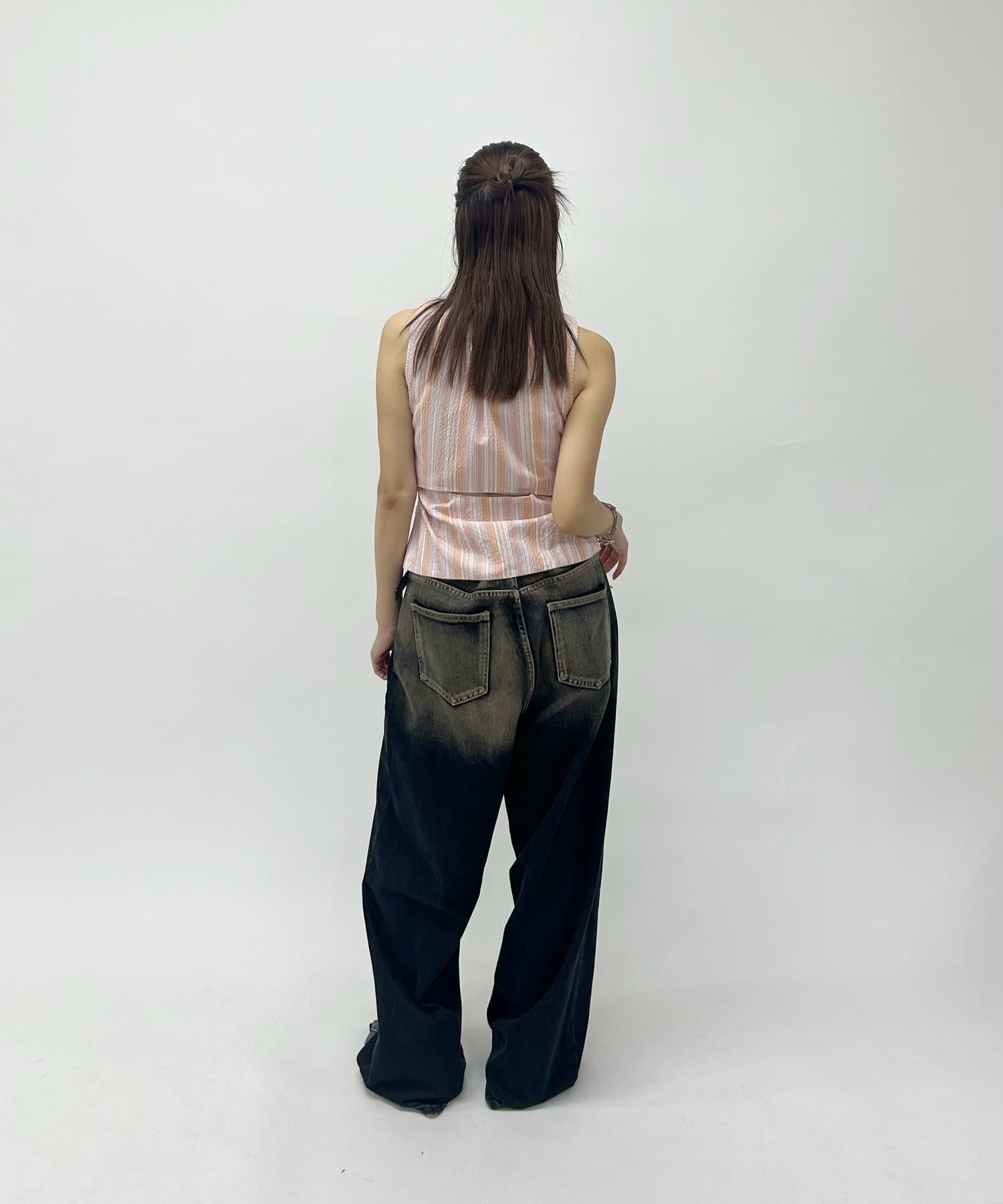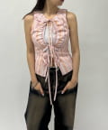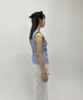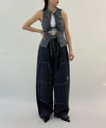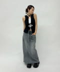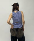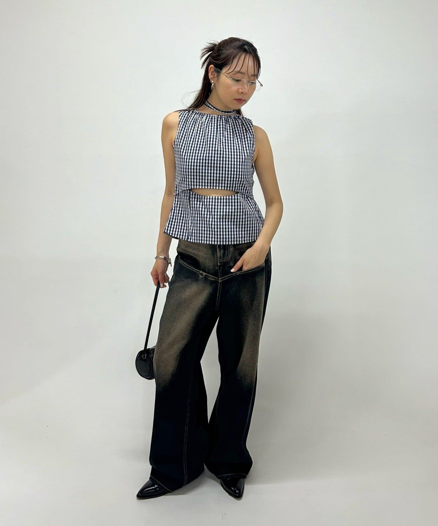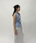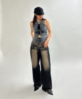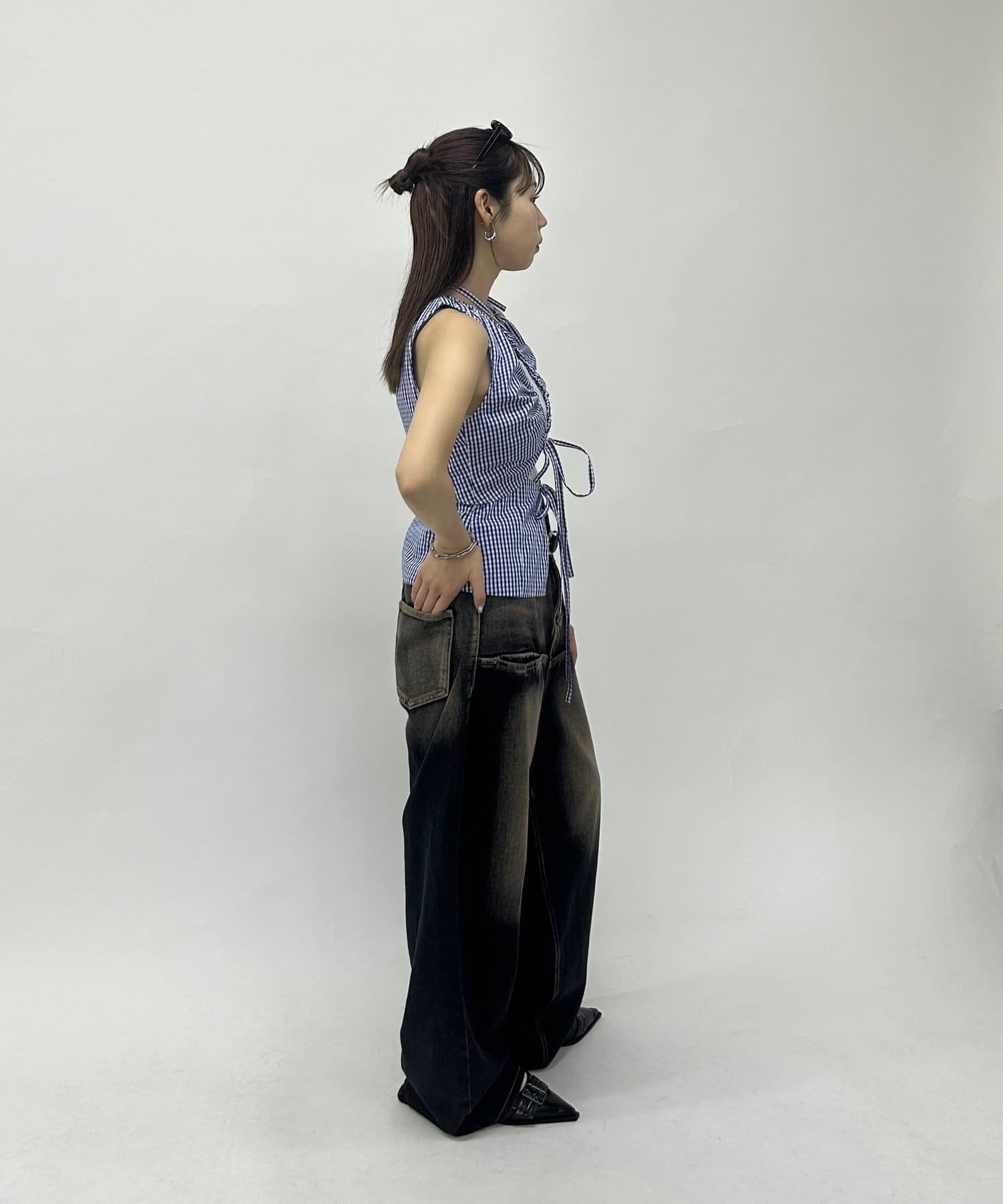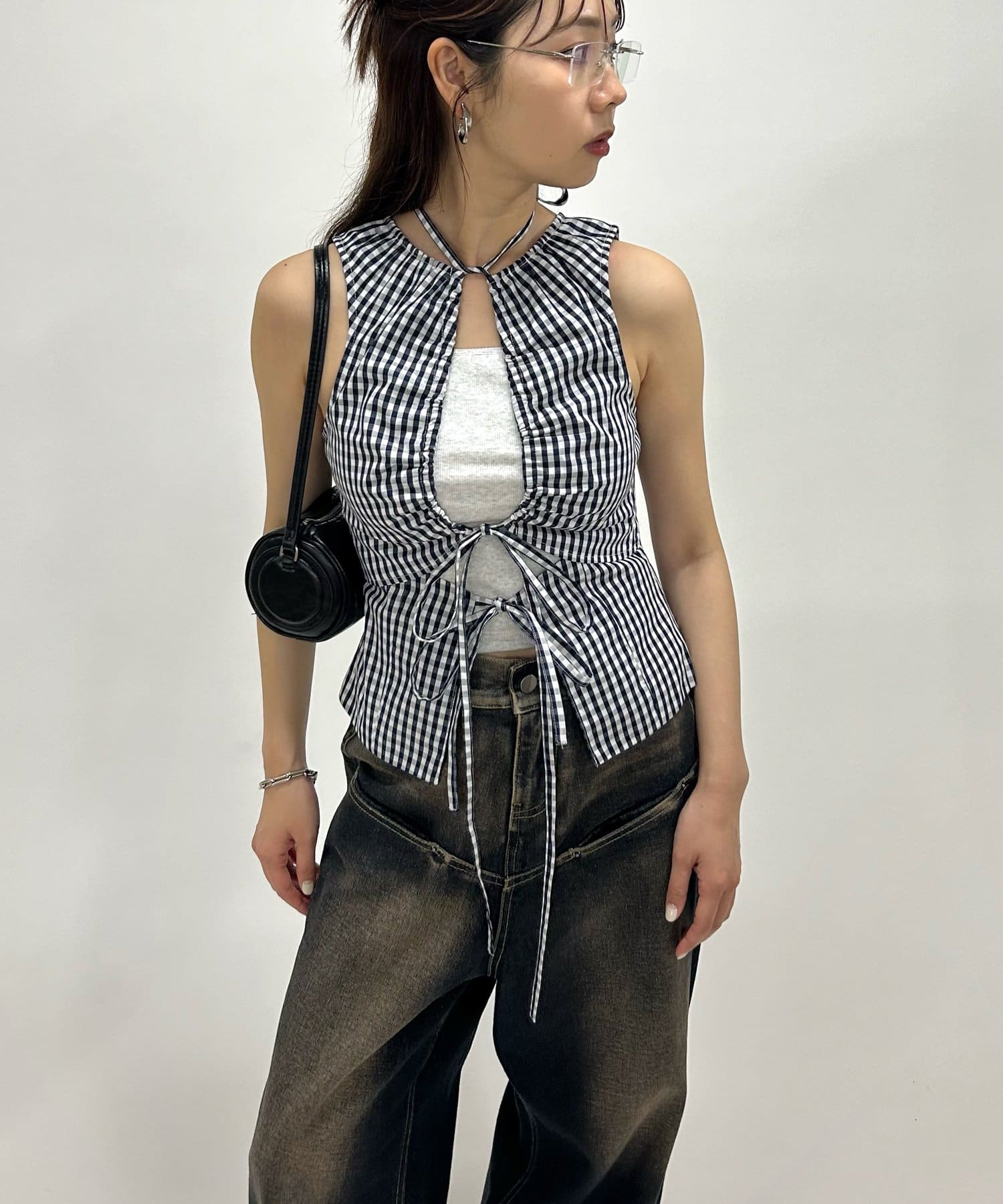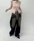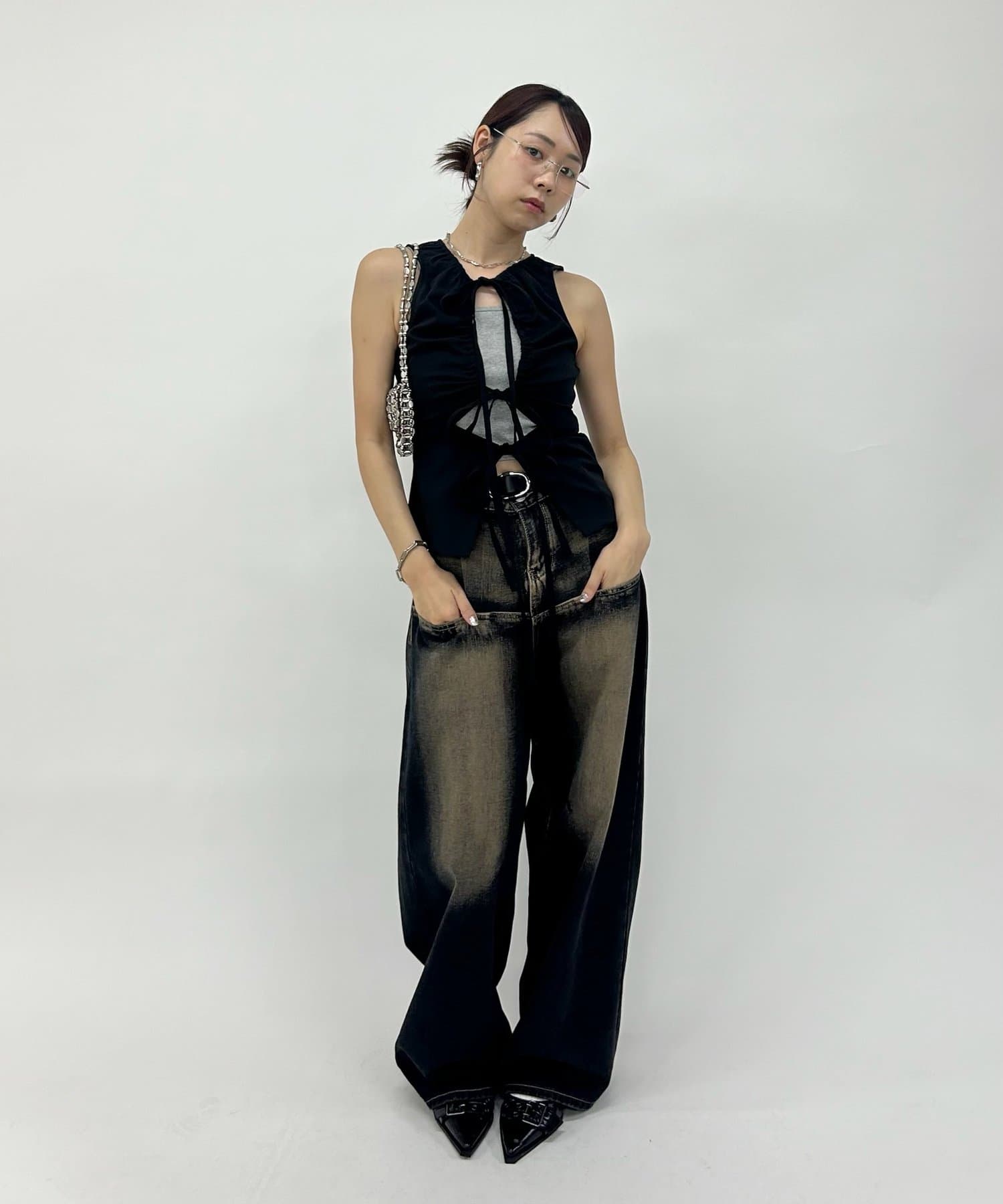 ・ガーリーなベストにはハーフデニムで甘辛ミックスコーデ。