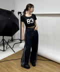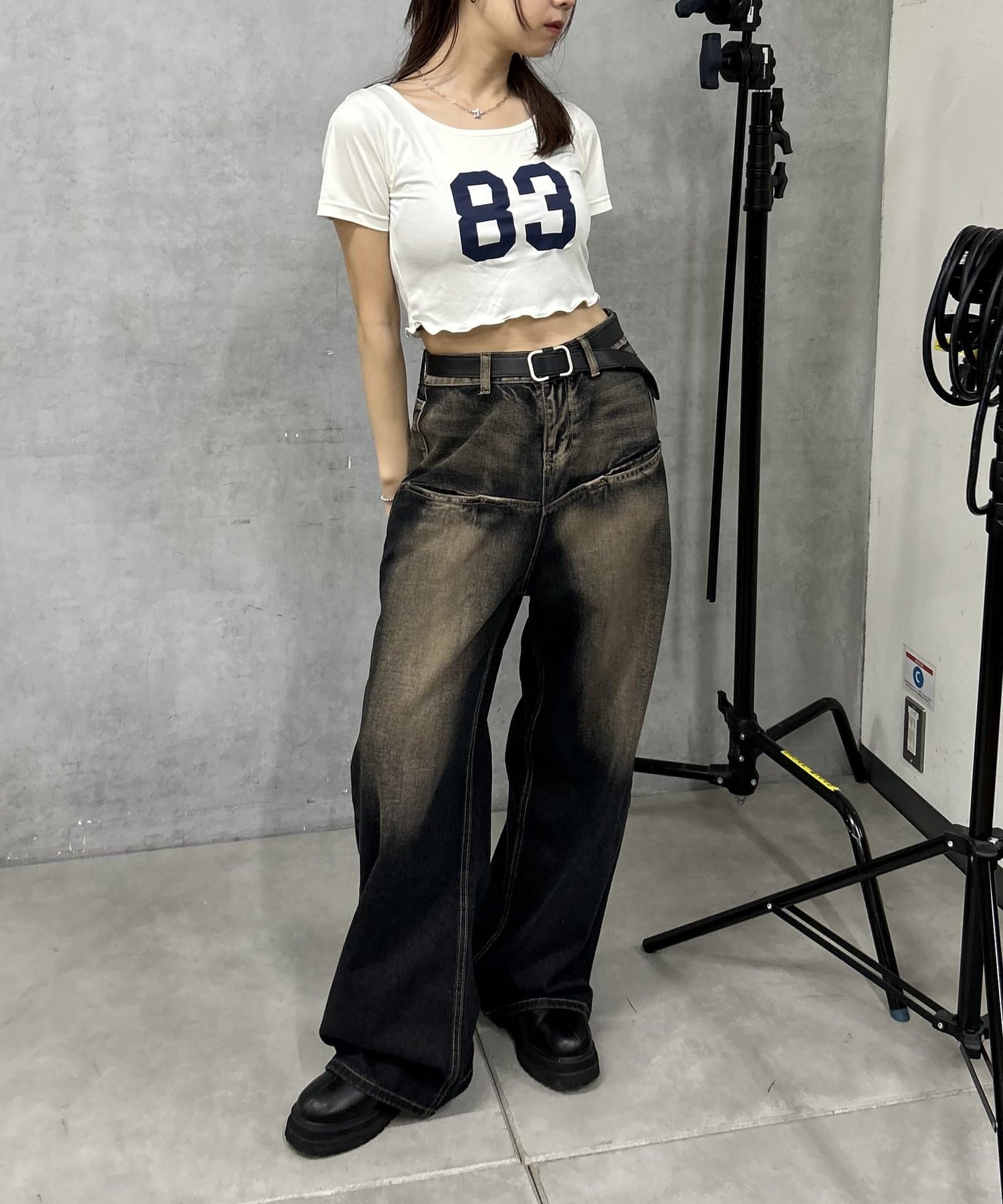・コンパクトトップスにはワイドデニムでバランス良く。