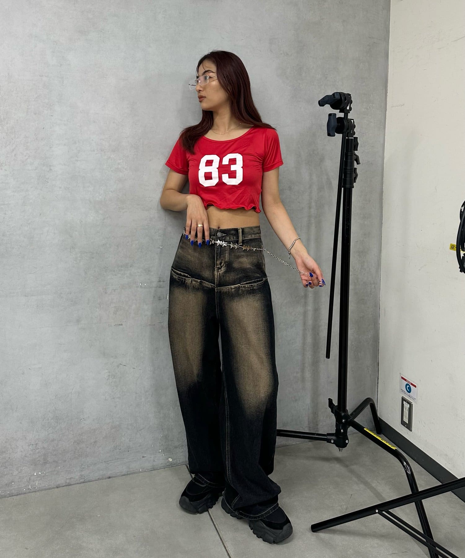 ・コンパクトトップスにはワイドデニムでバランス良く。