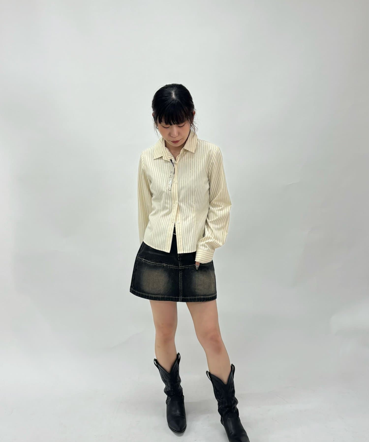 コンパクトなシャツでスクールライクで韓国っぽい雰囲気に。