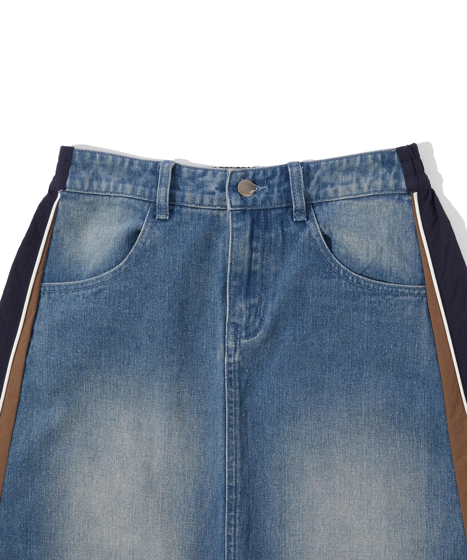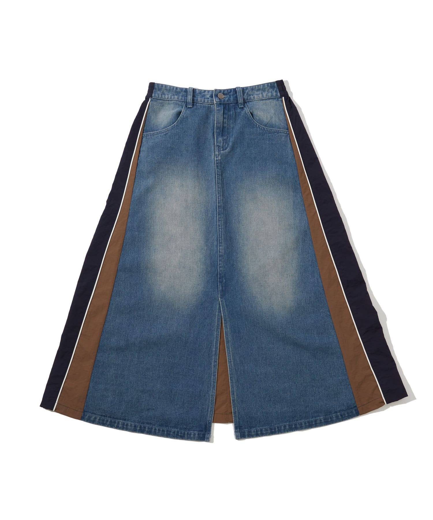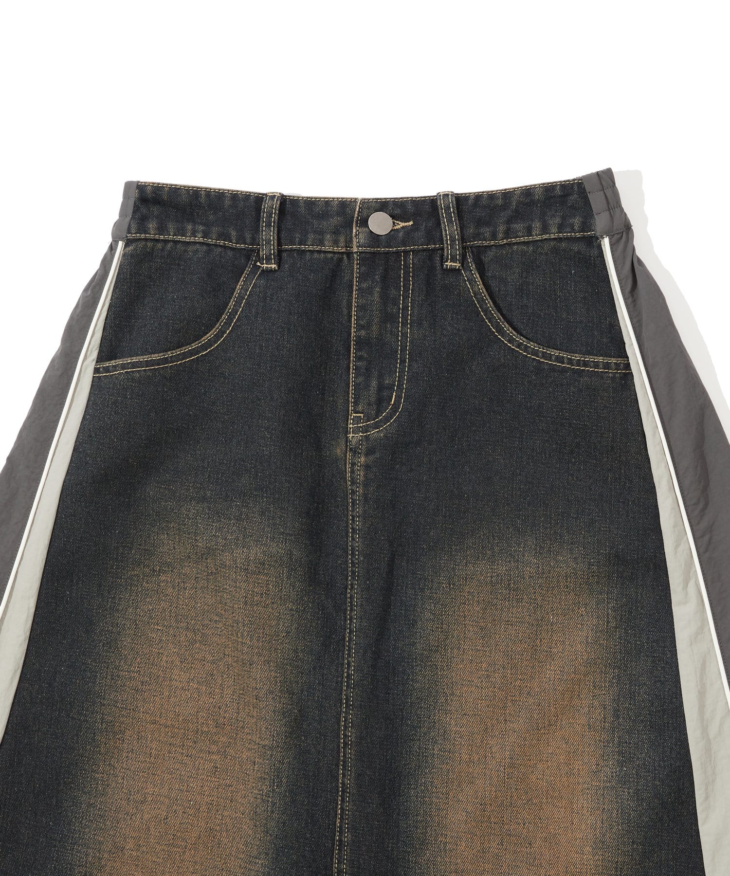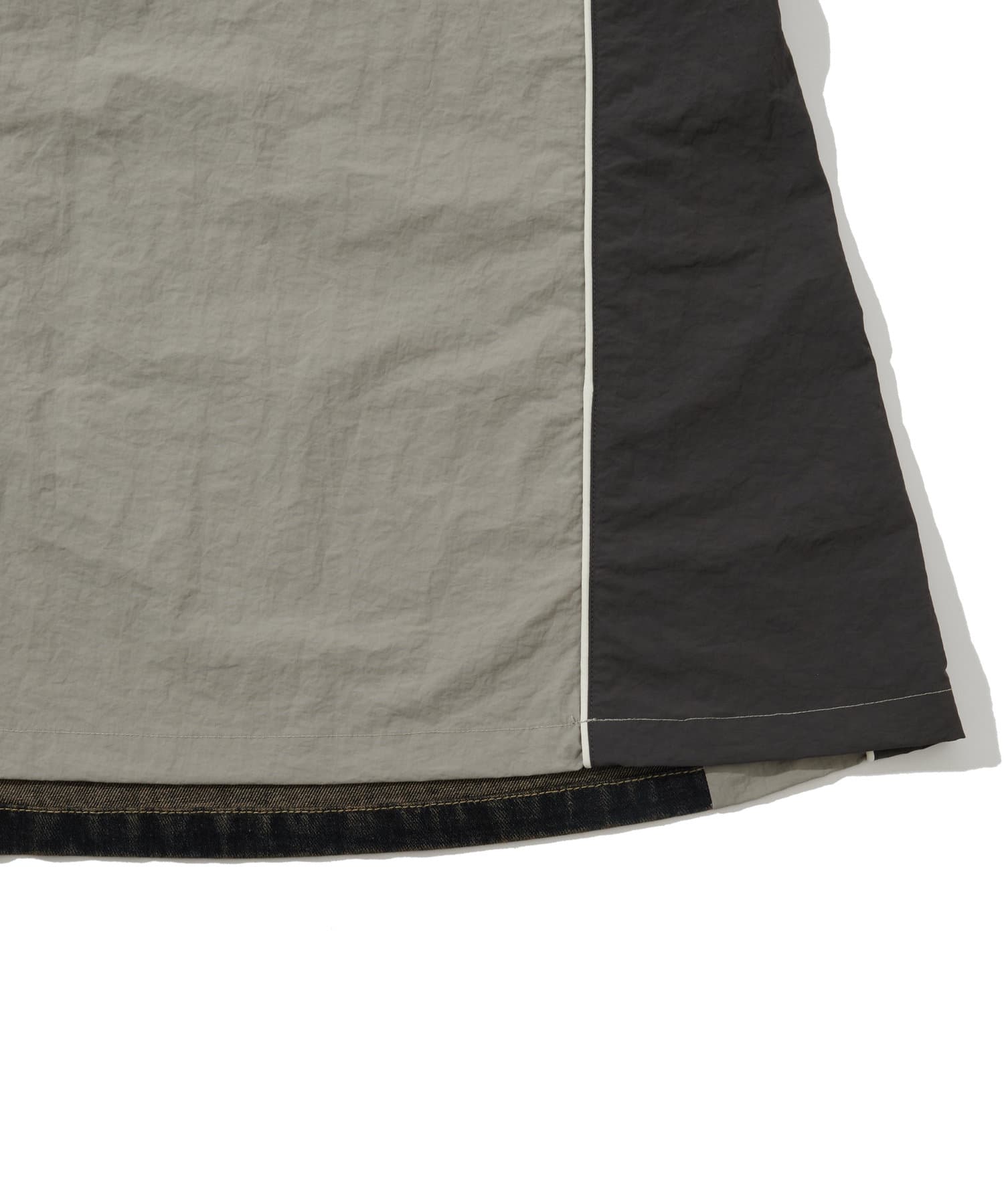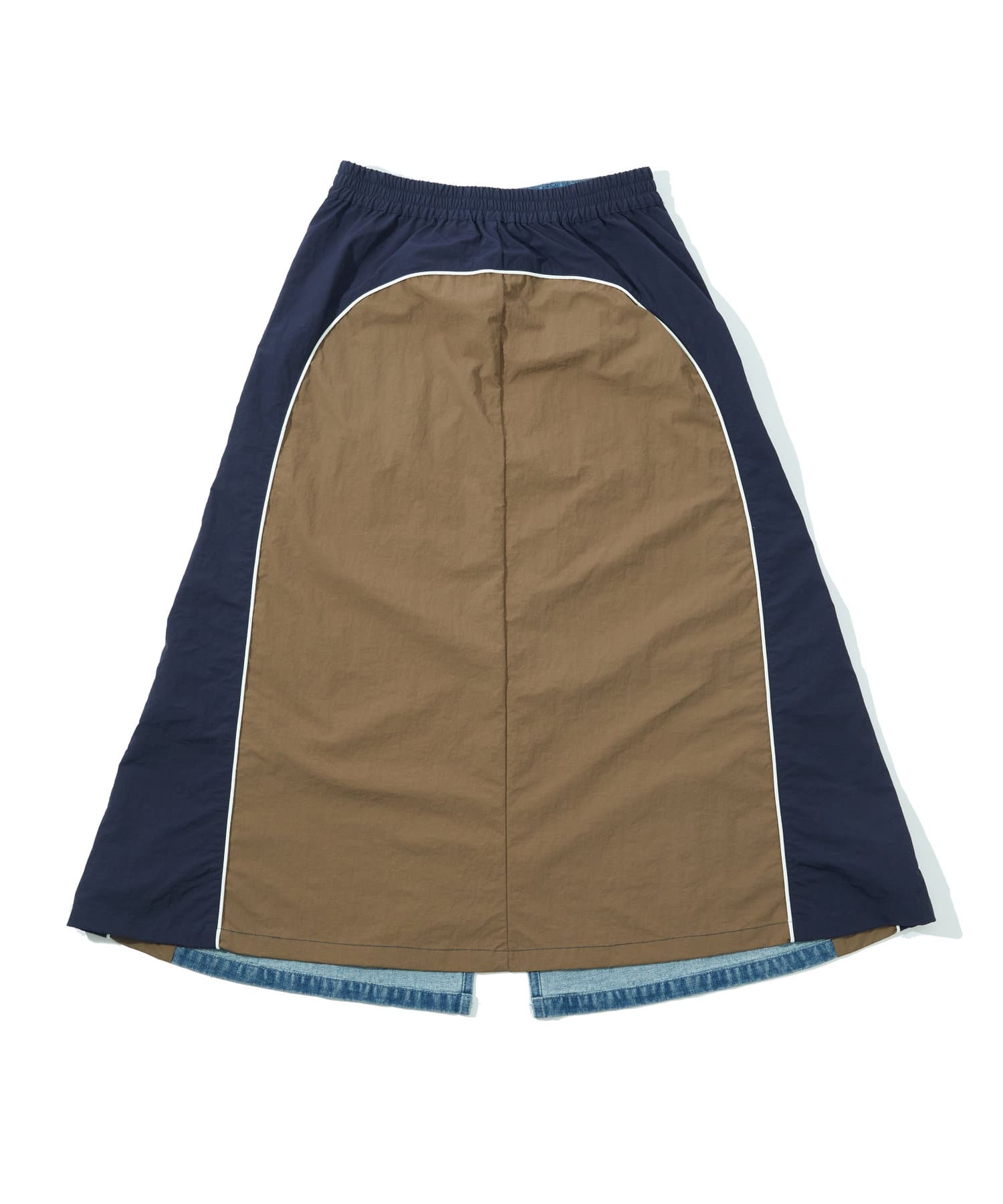 ・前がデニムで後ろがナイロンで切り替わっているデザインスカート。