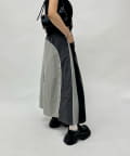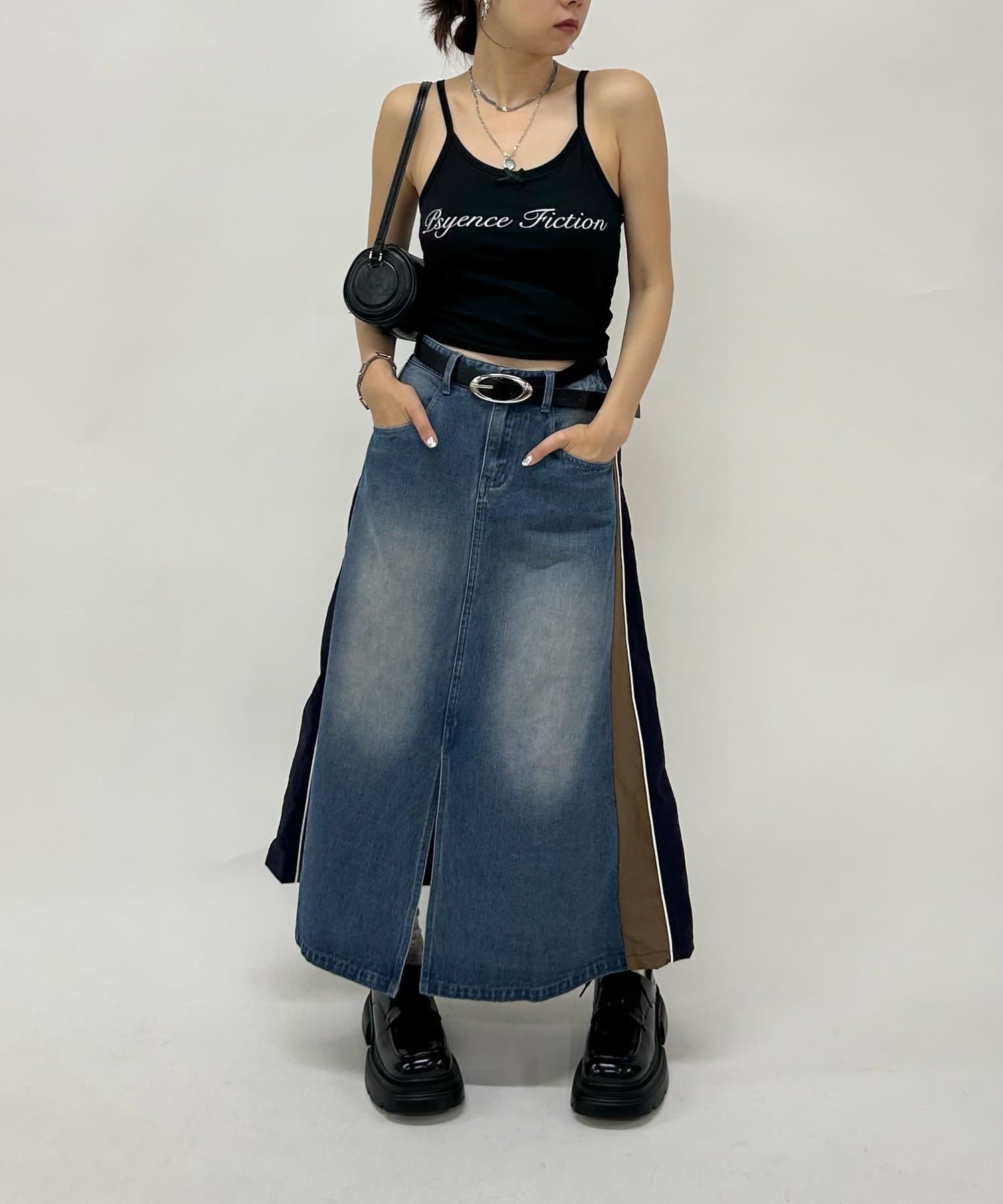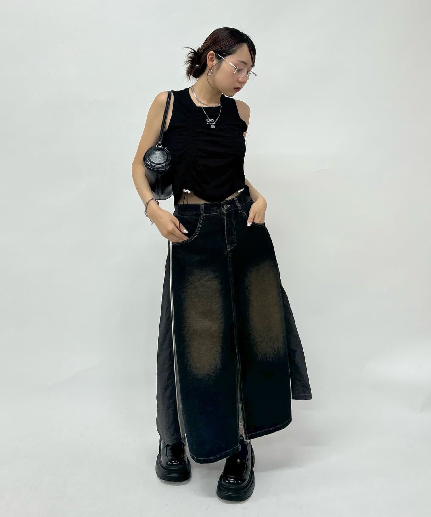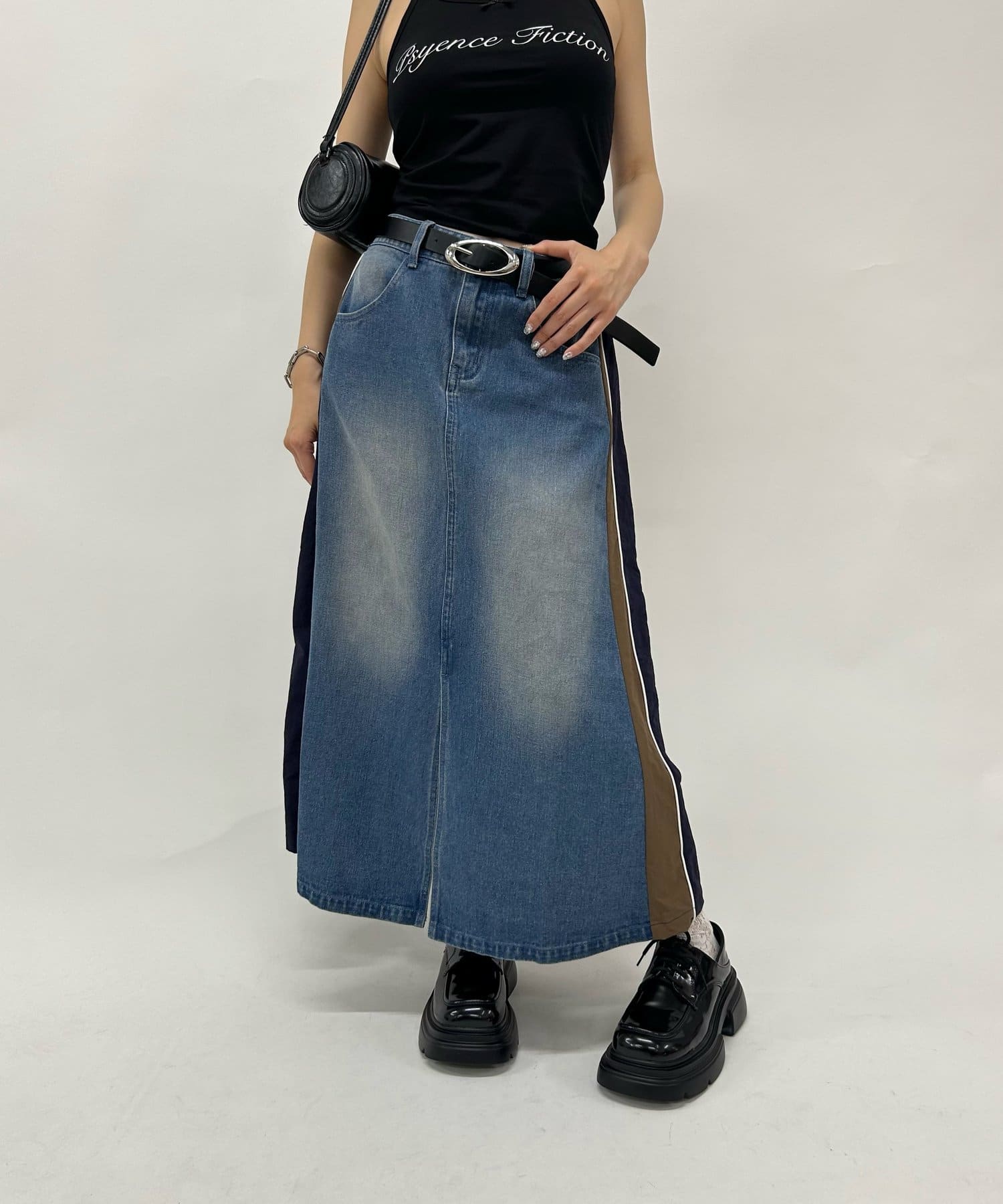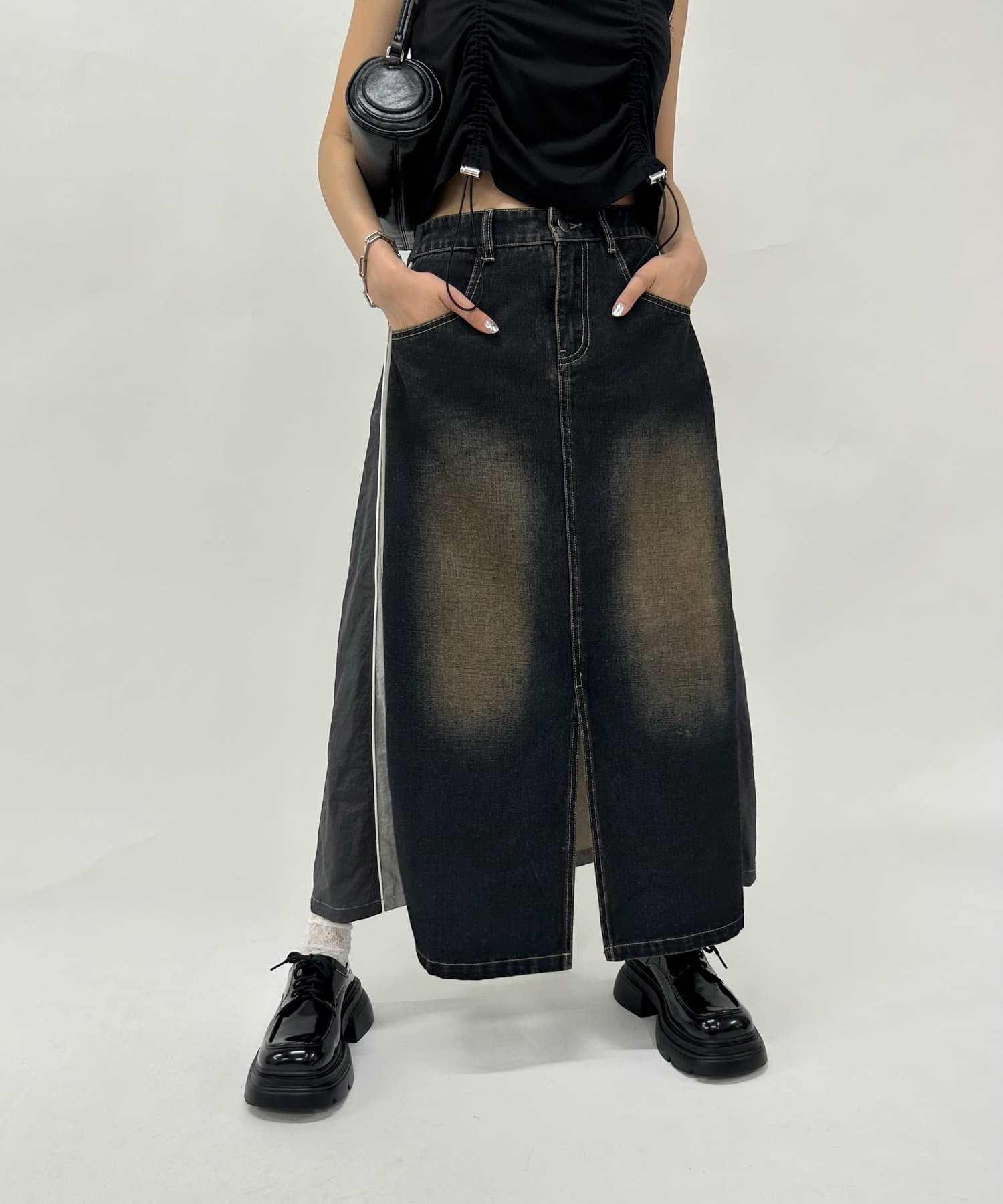 ・前がデニムで後ろがナイロンで切り替わっているデザインスカート。