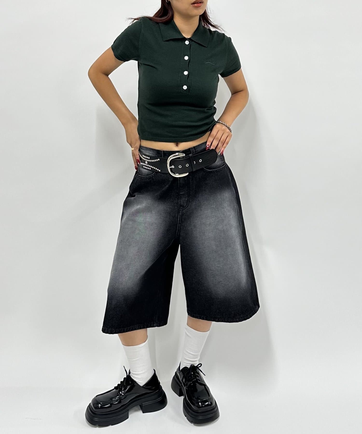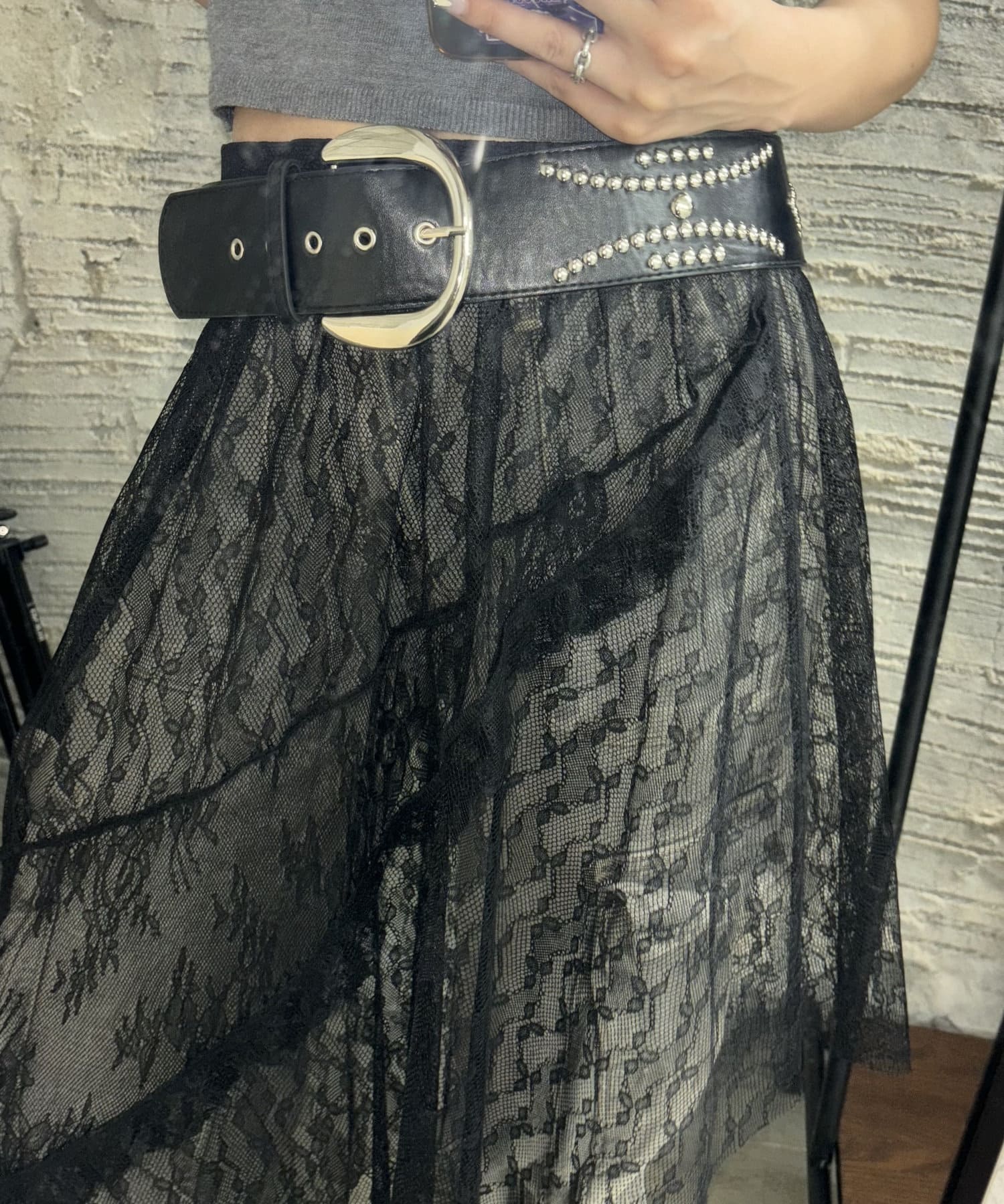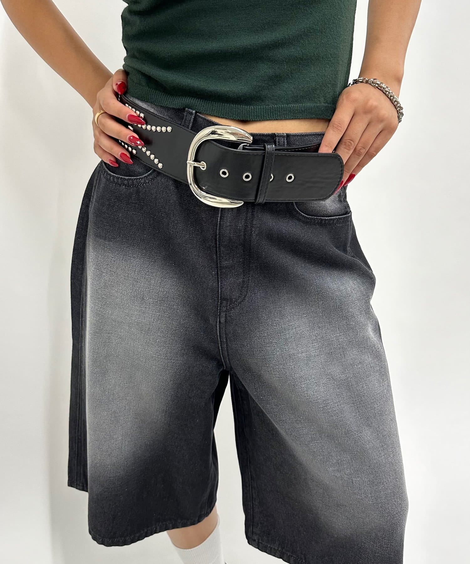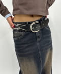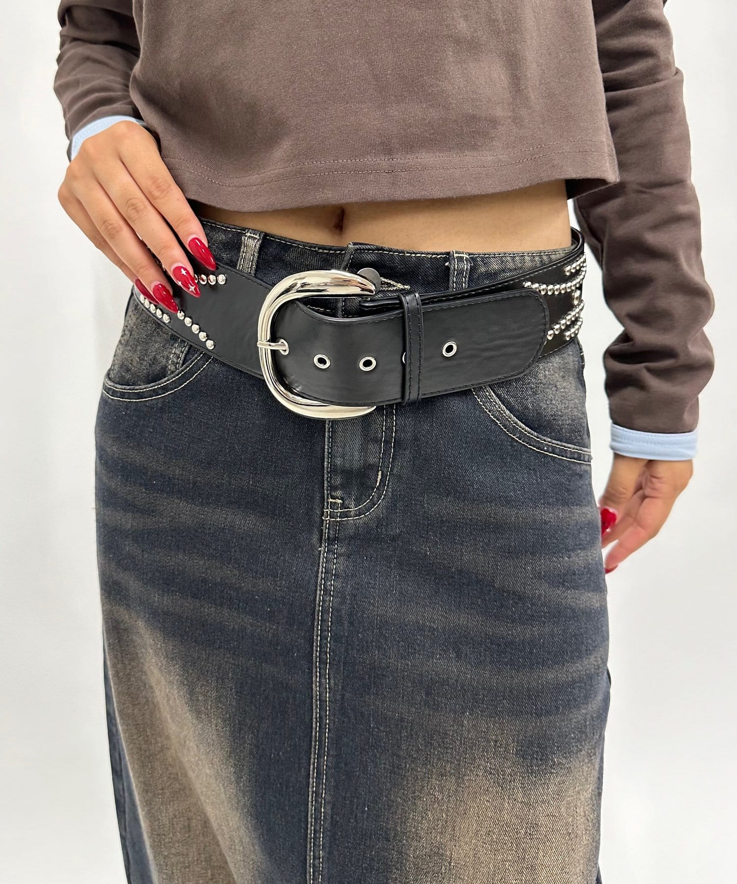 ・ごつめのウエスタンベルトが今っぽいトレンディーな雰囲気に。