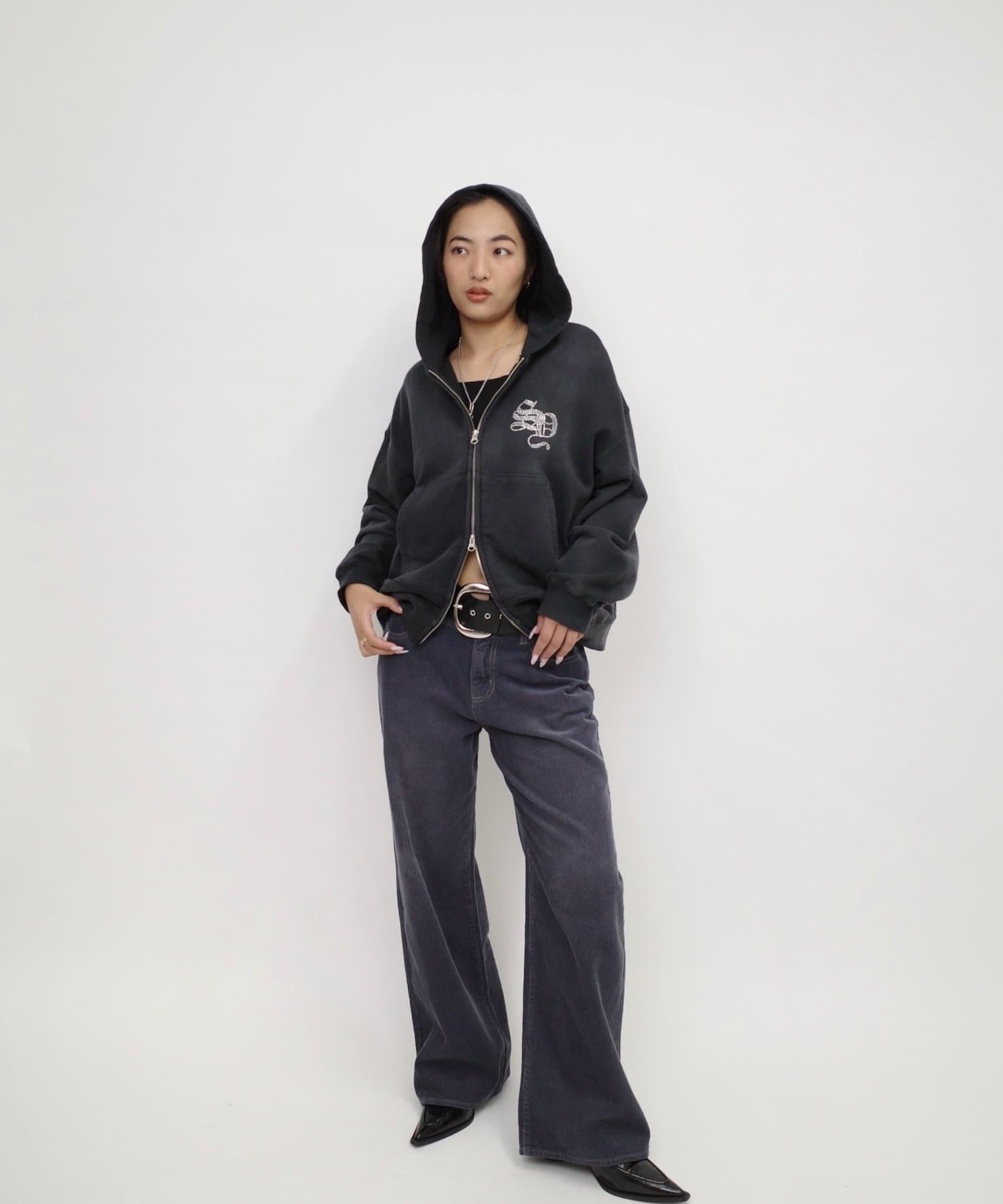 今季トレンドのジップパーカーを合わせると今年らしいスタイルにアップデート。