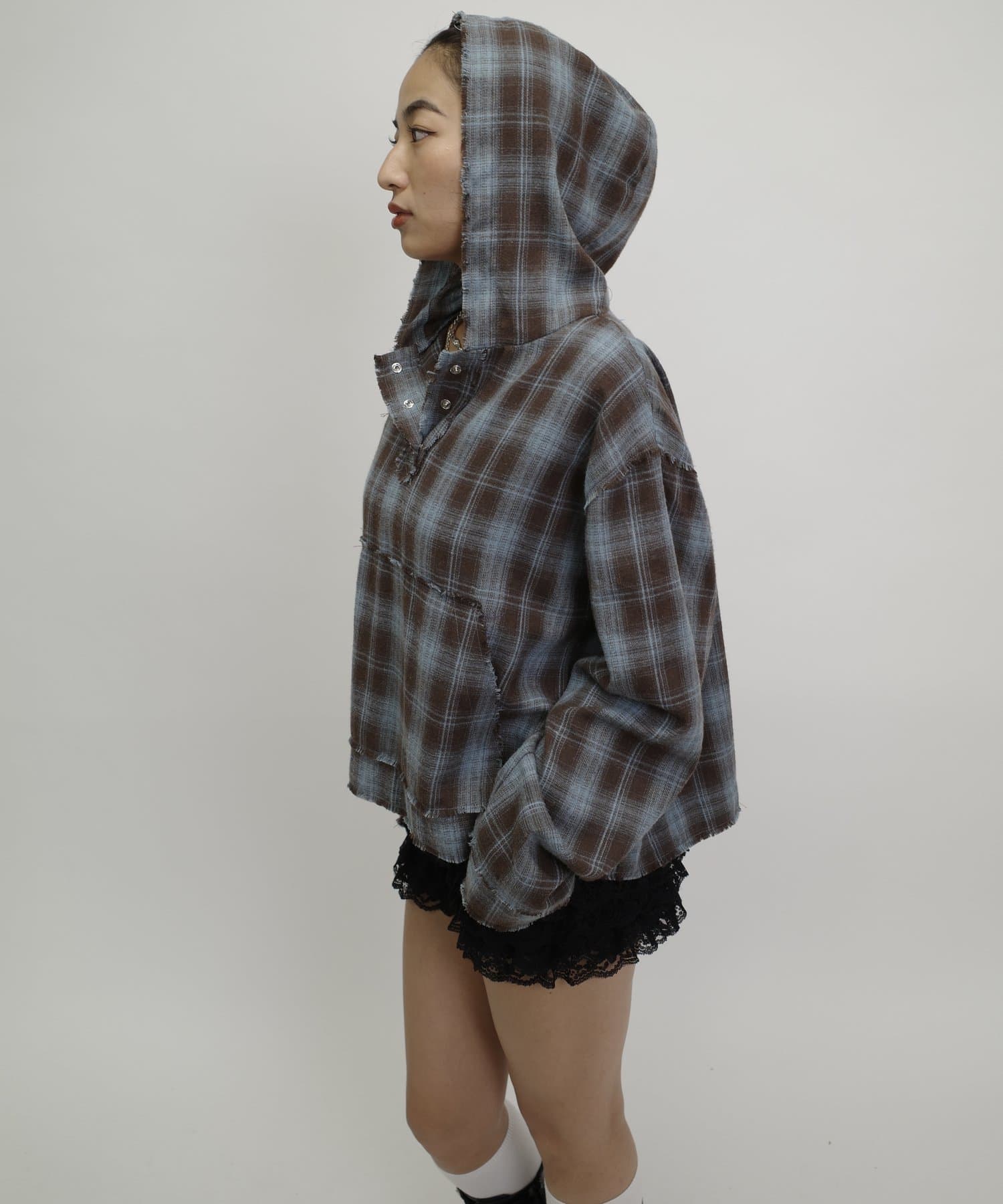 切りっぱなしのようなデザインのチェックシャツ