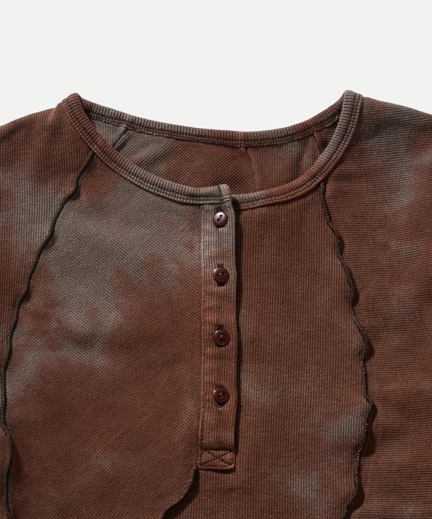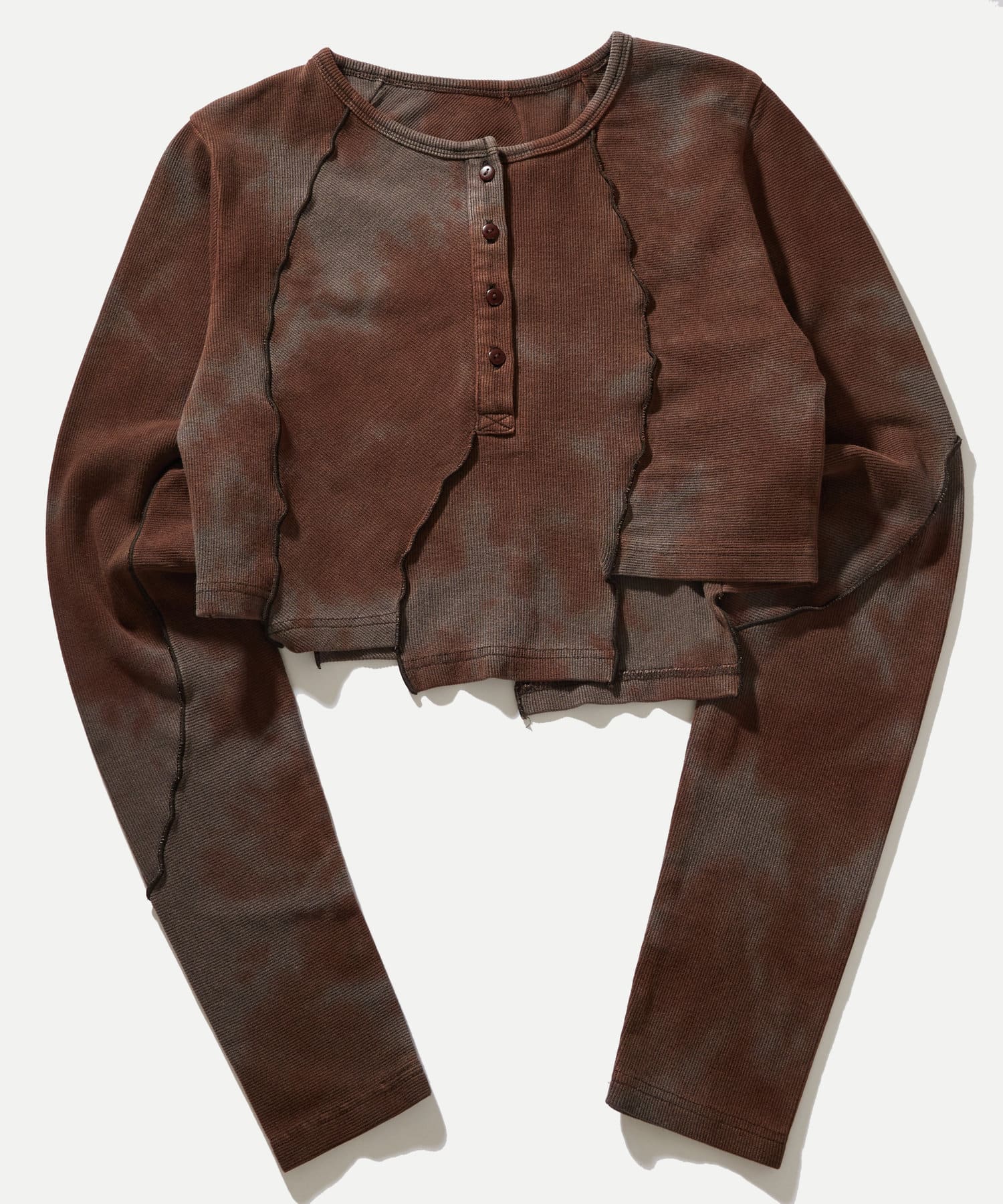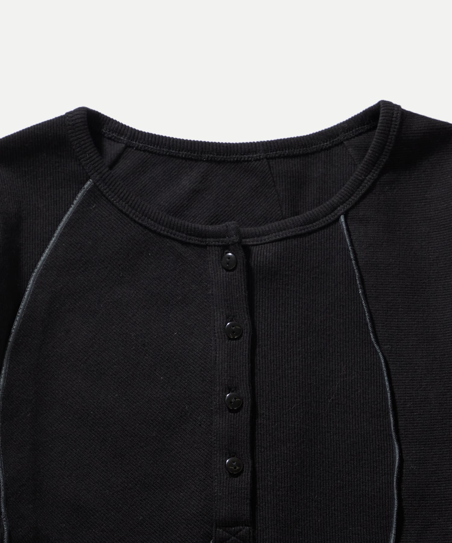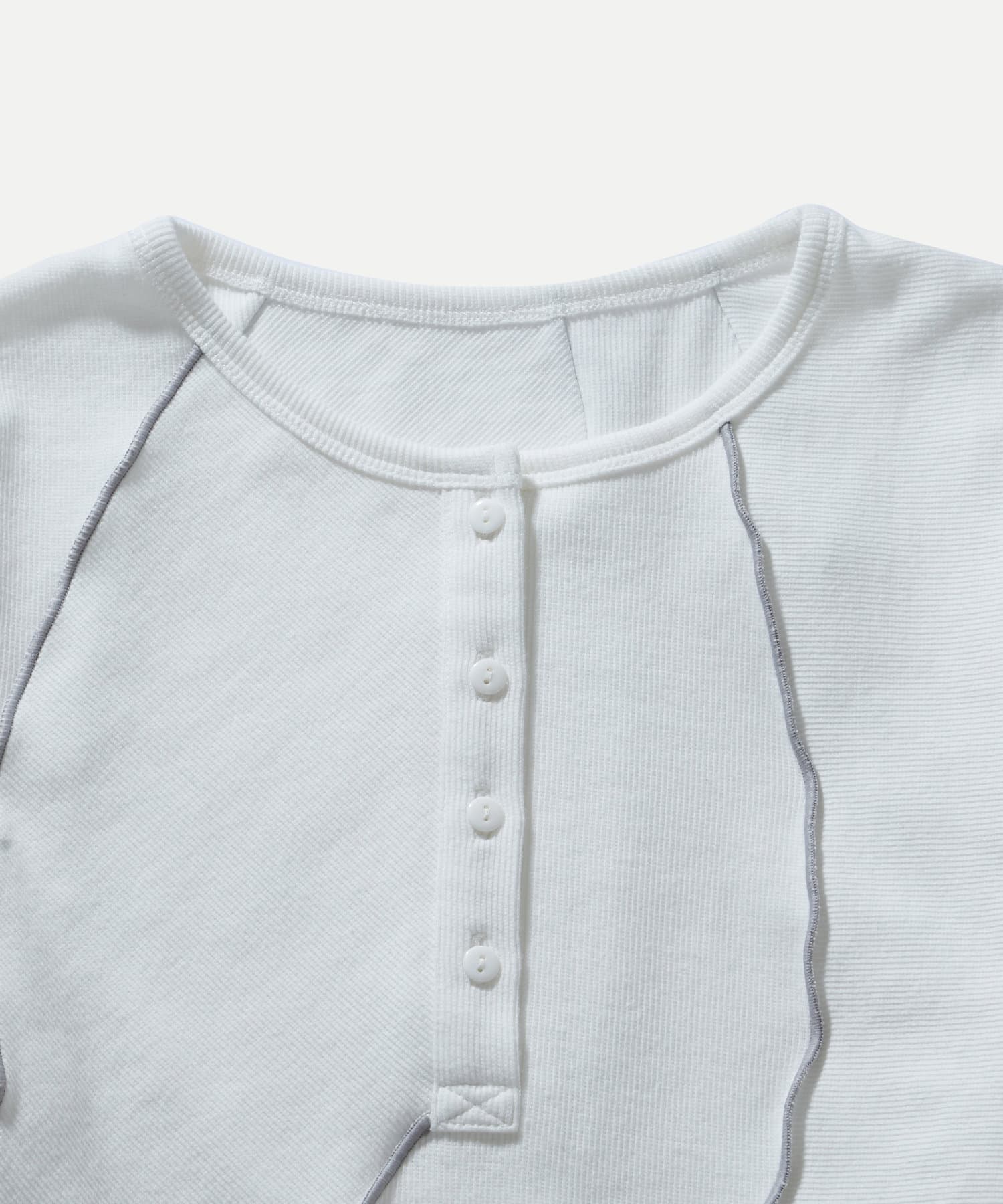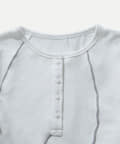 ・裾のデザインが特徴的なヘンリーネックトップス。