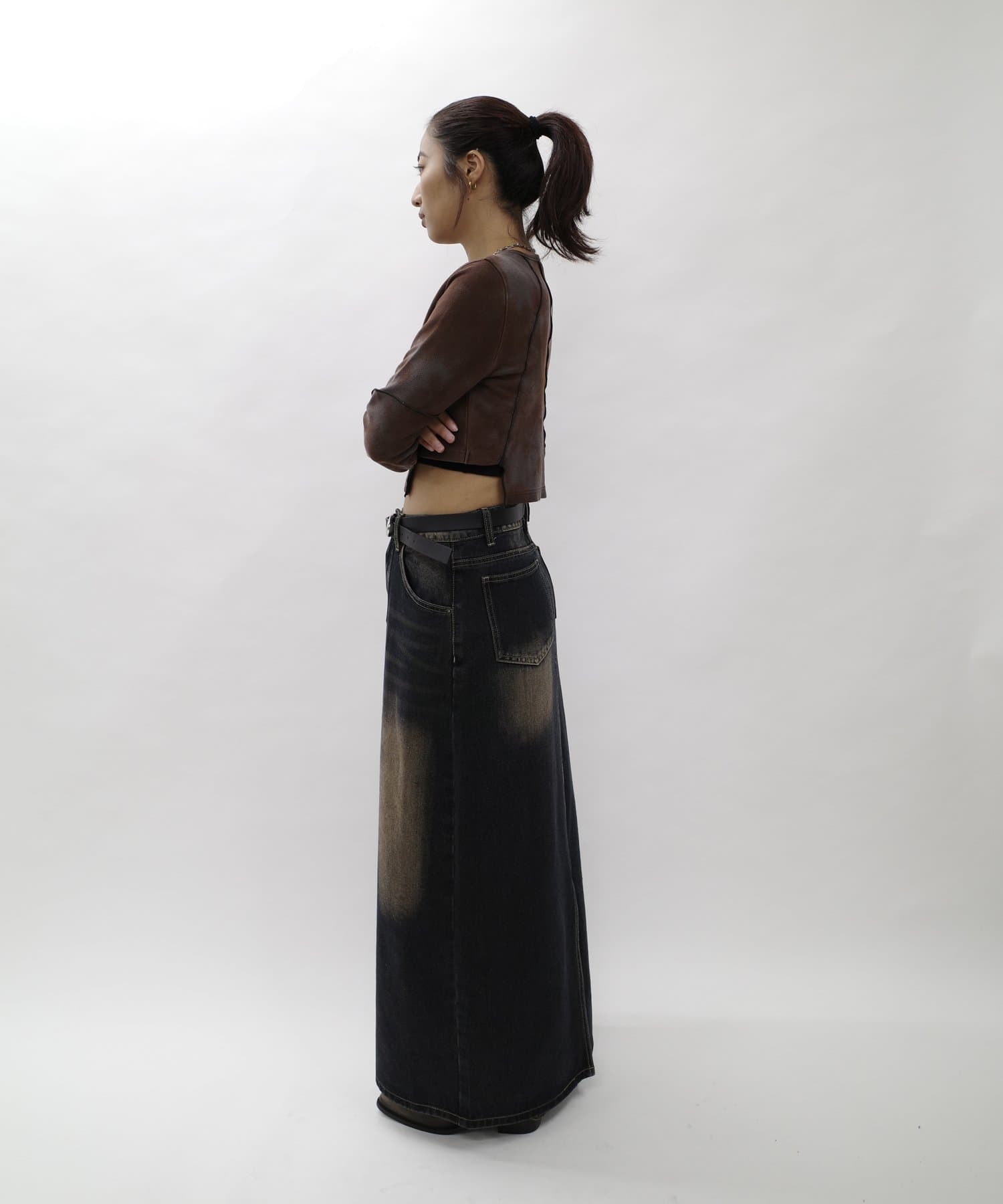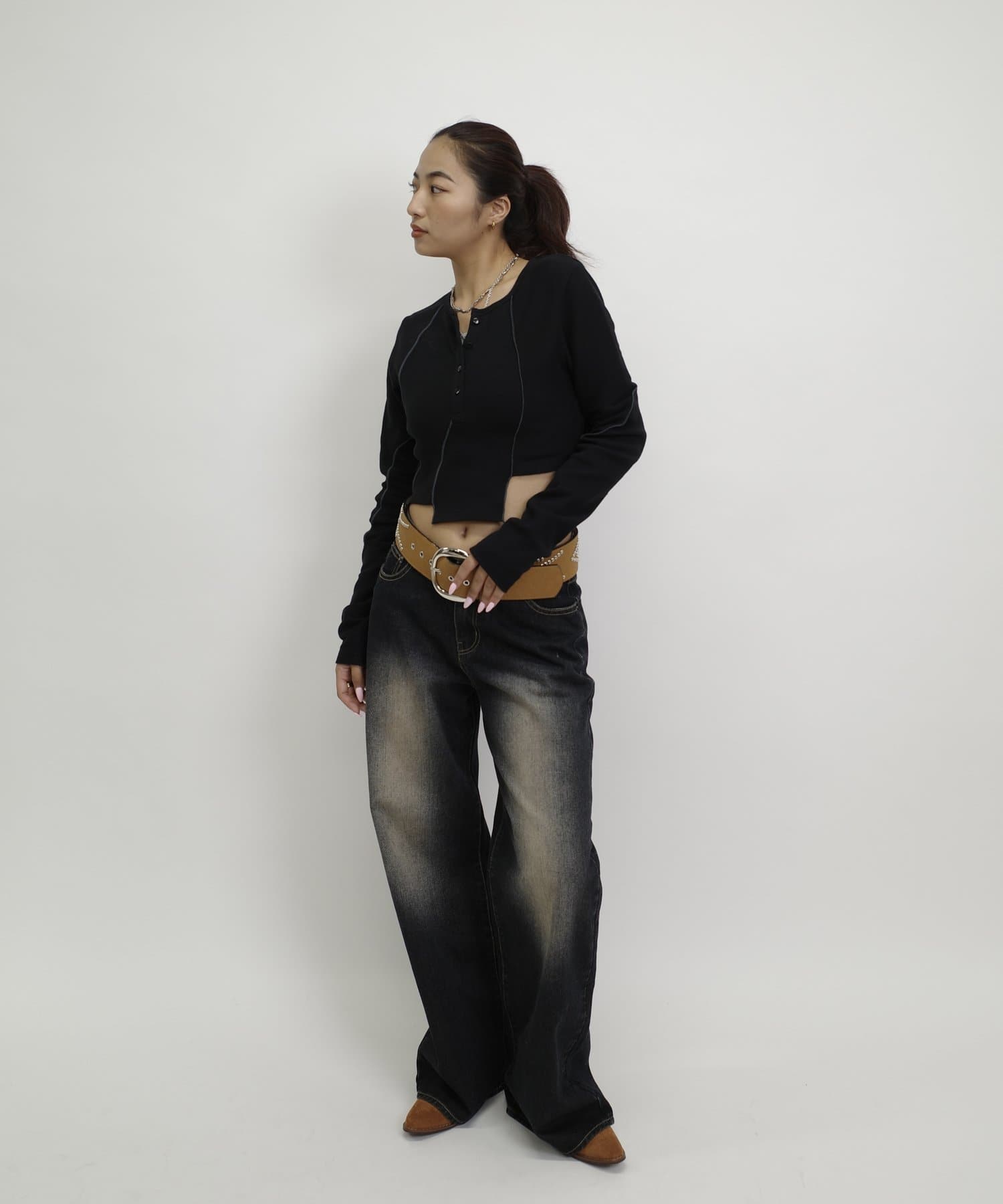 コンパクトなトップスには、トレンドのワイドデニムでスタイルアップが叶います。