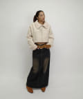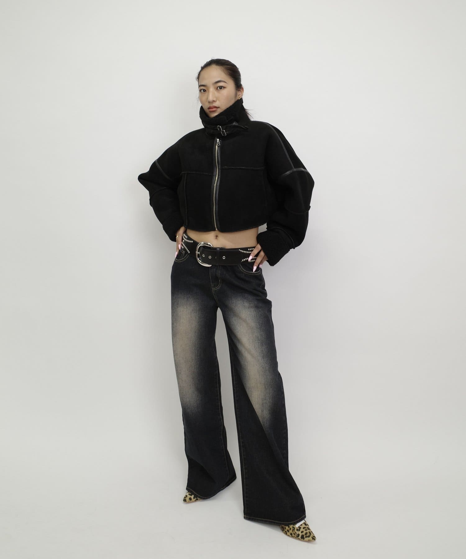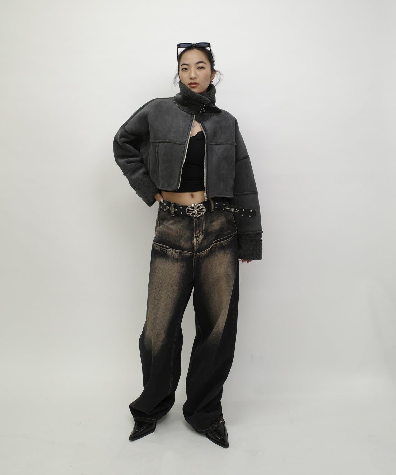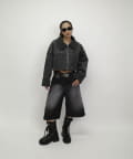 ショート丈なので、ワイドシルエットのパンツでスタイルアップに。