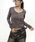 ・レオパード柄とフロントのメッセージプリントが特徴的なトップス。