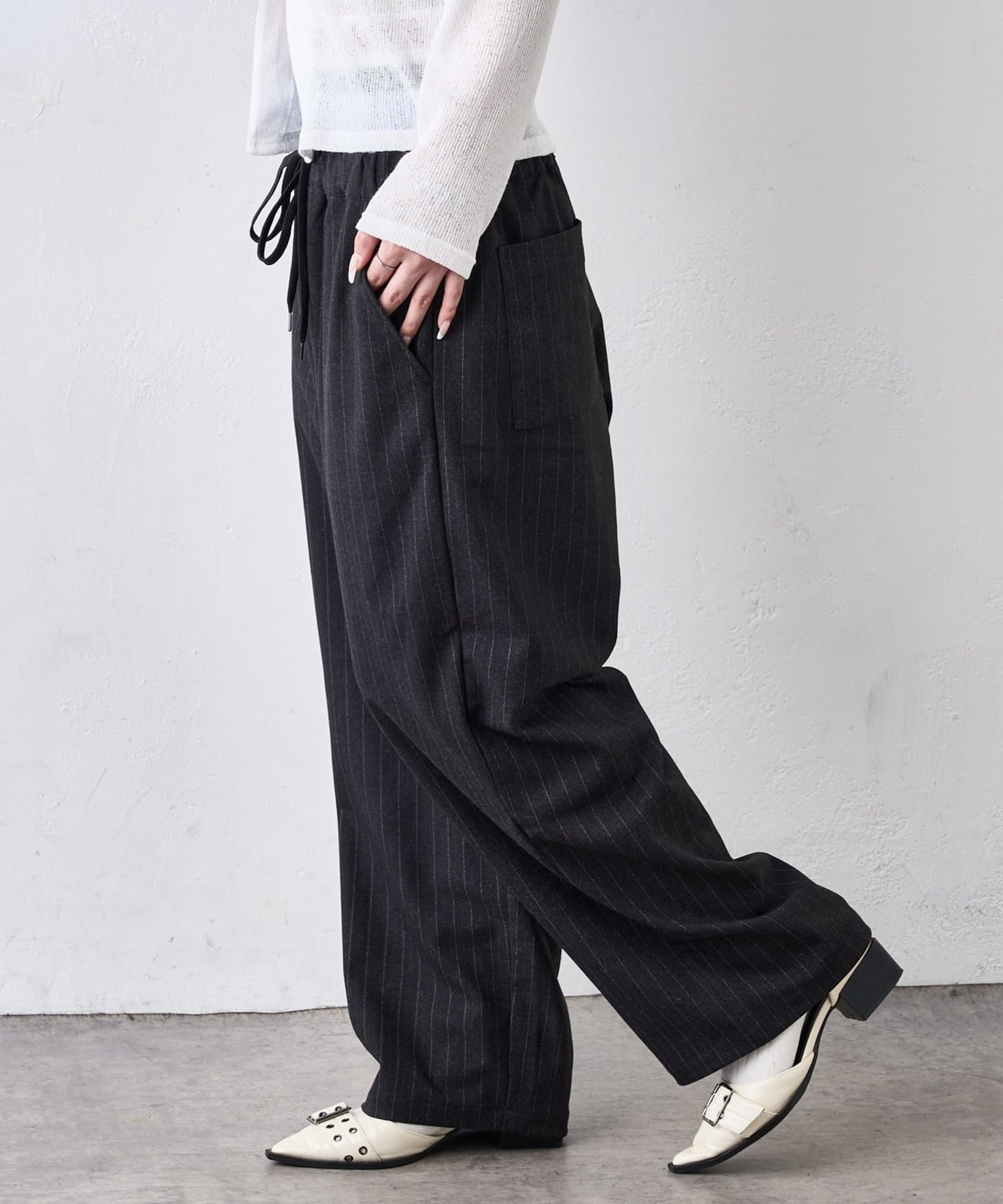 ・ストライプのスラックスとスウェットパンツの2種類で、モード~カジュアルまで幅広く着て頂けます。