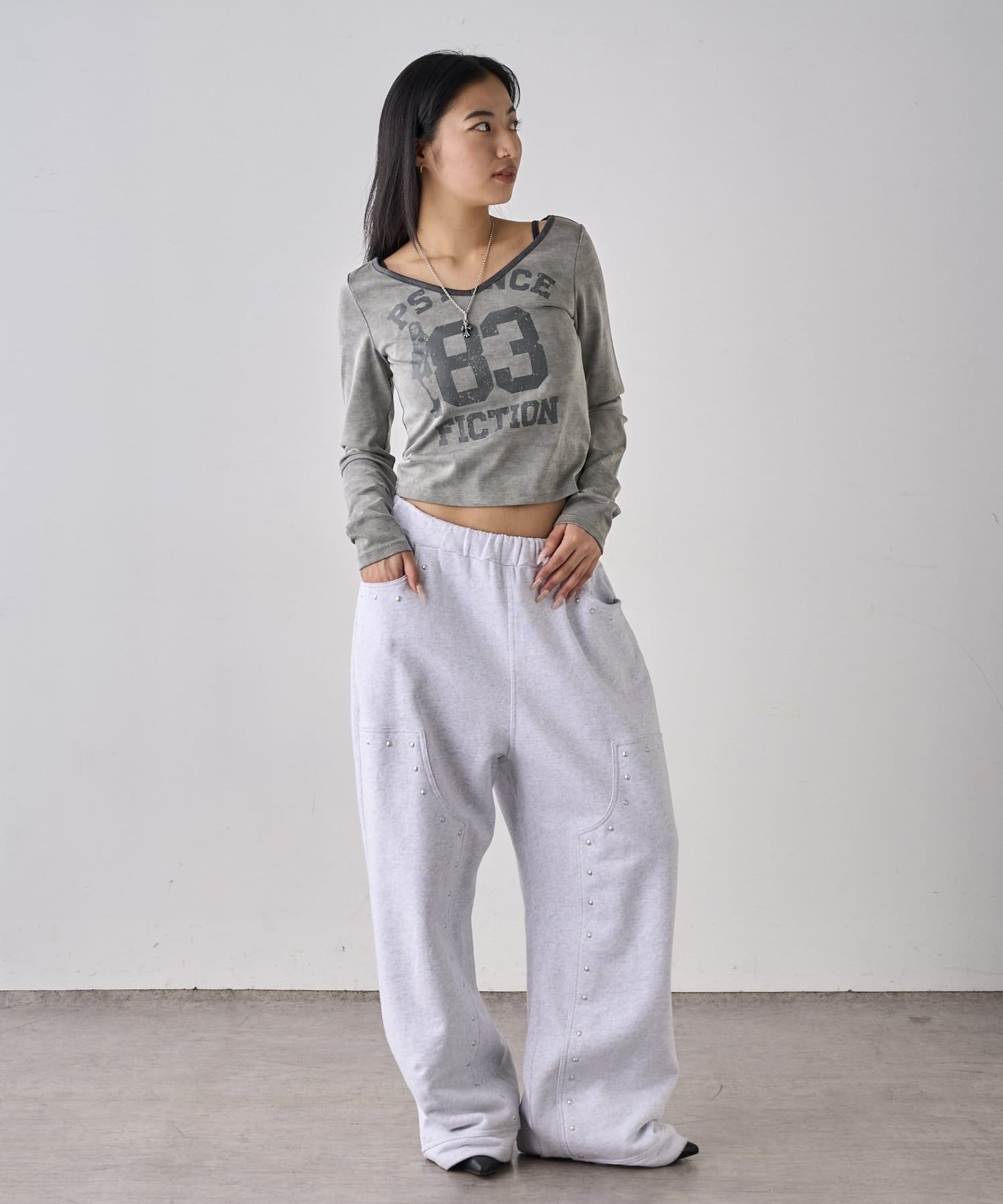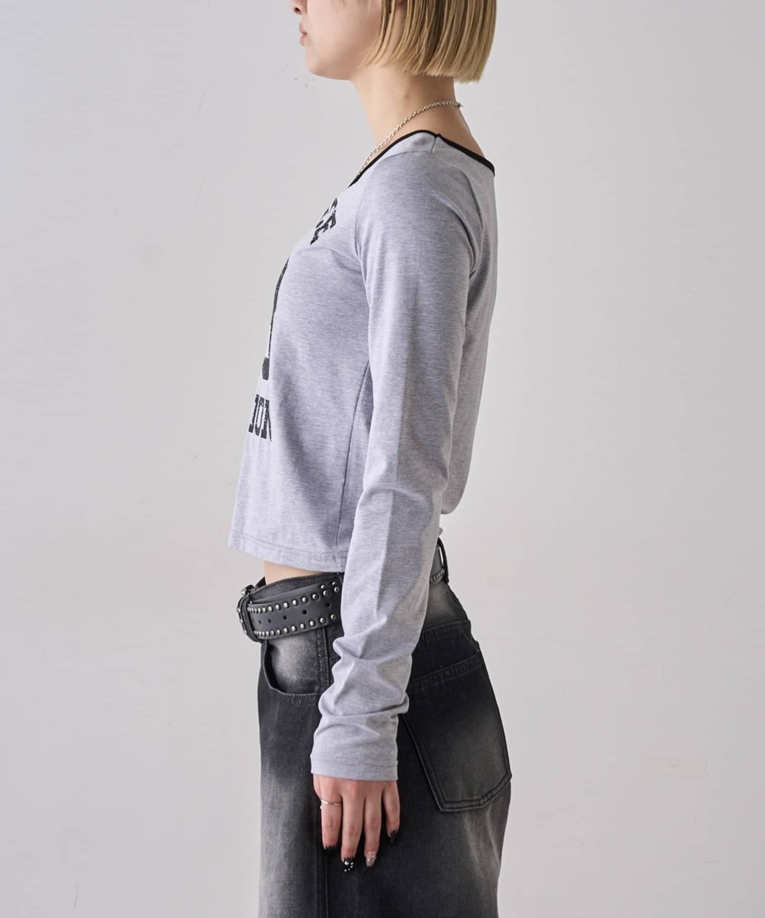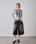 →少しずつ流行りだしているハーフデニム、ワイドなシルエットなのでロンTとも相性抜群。