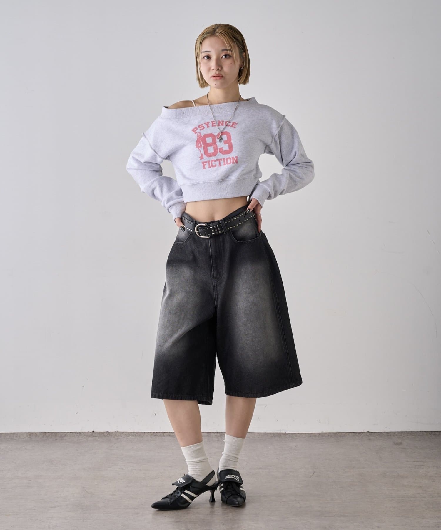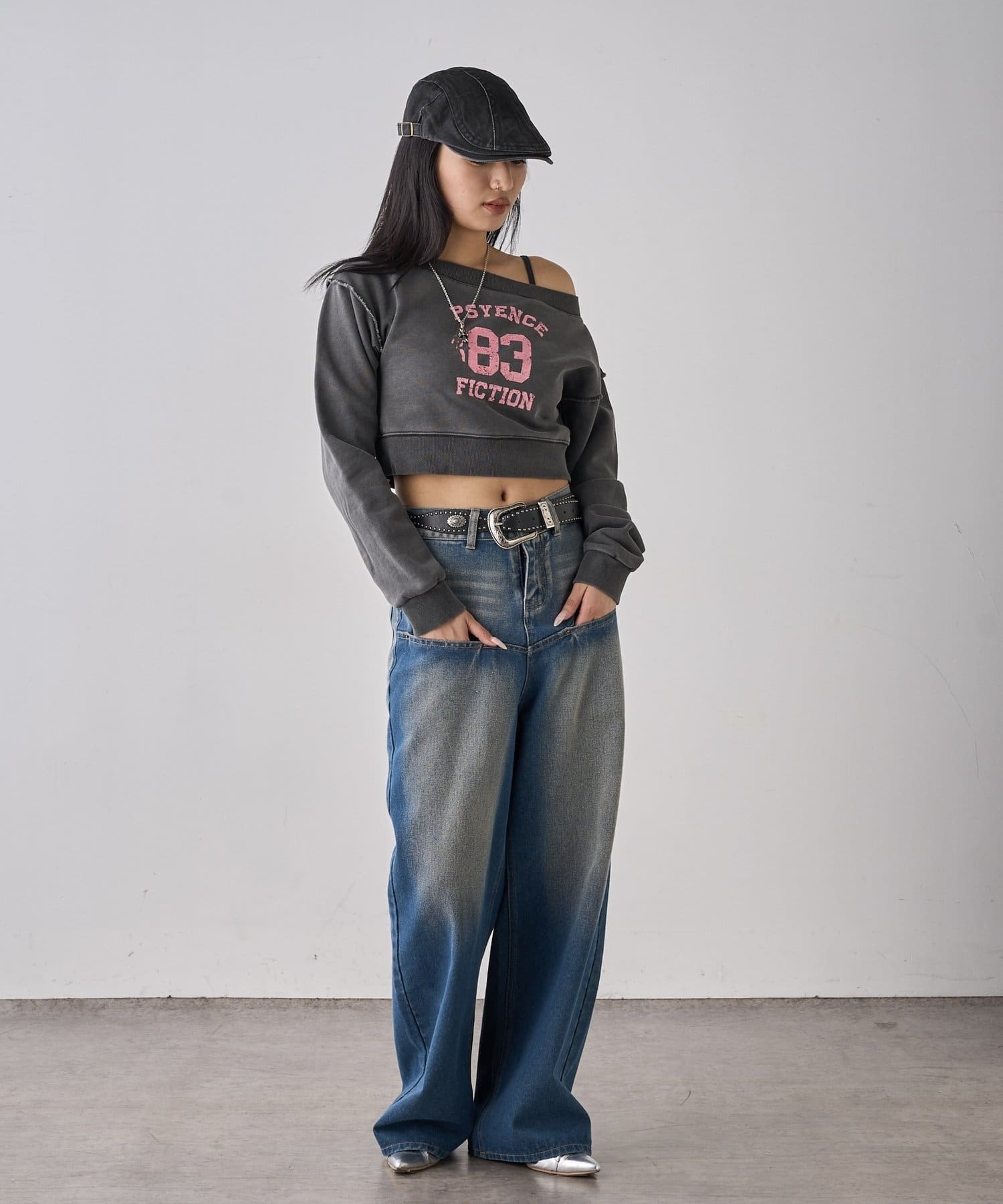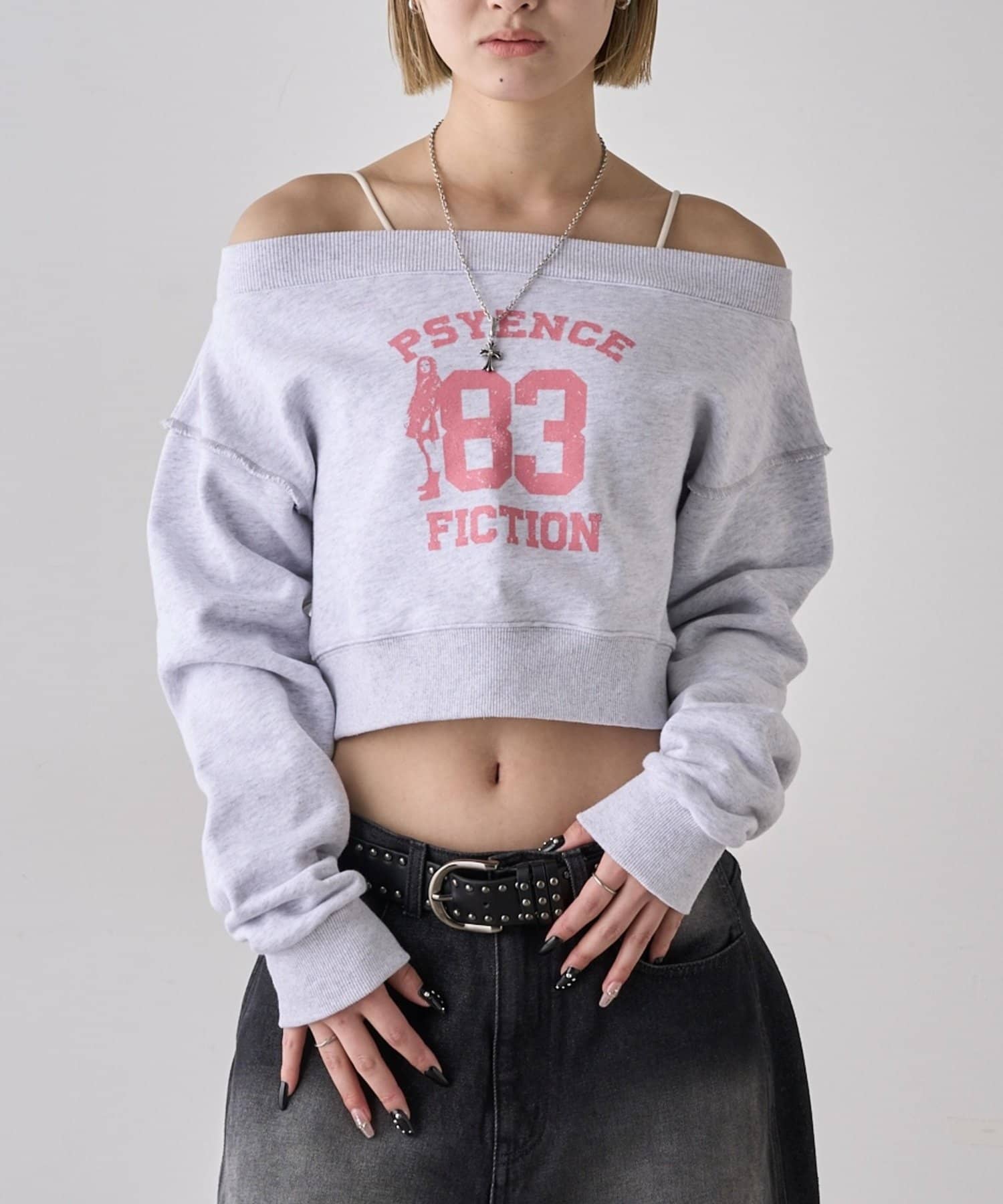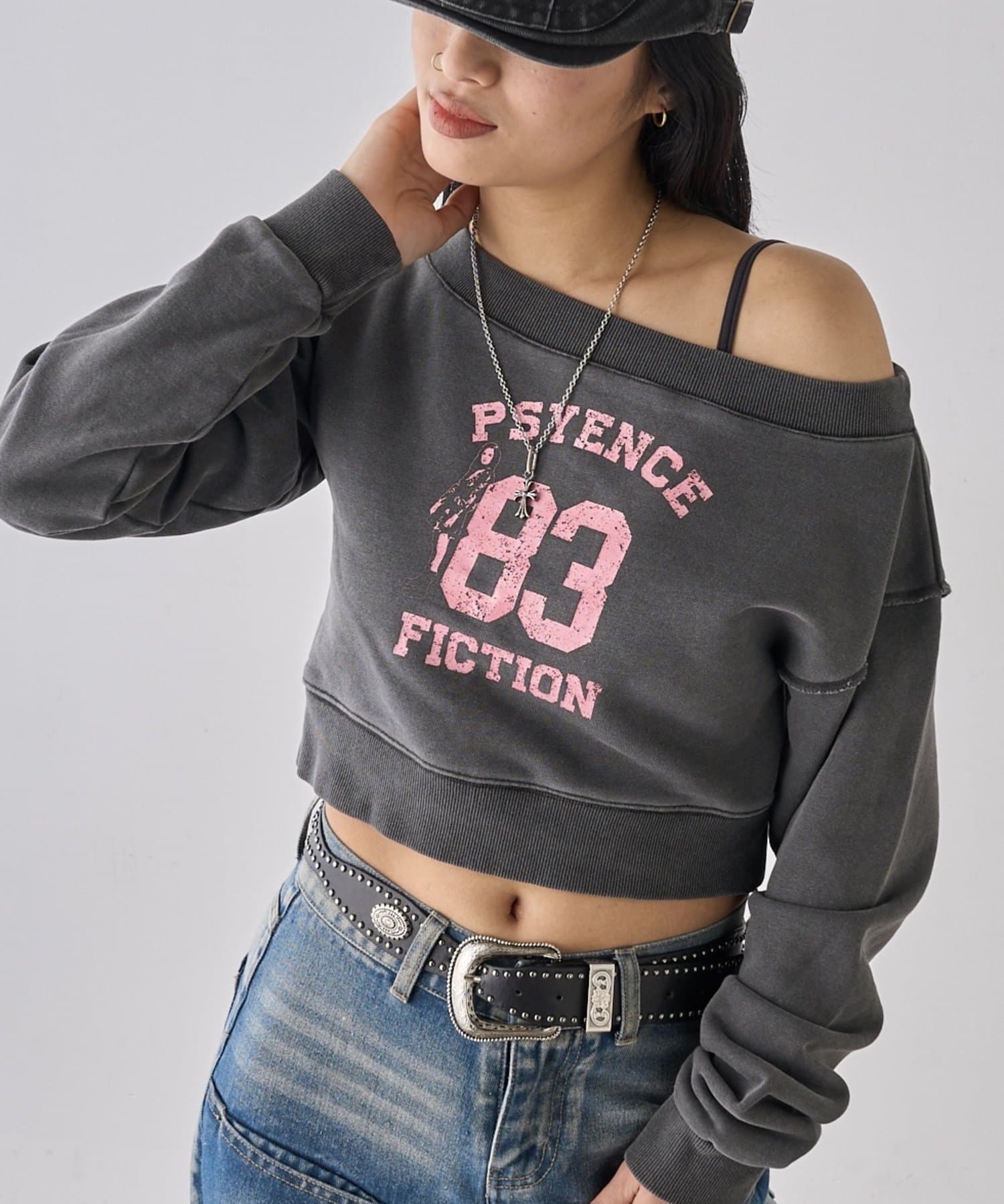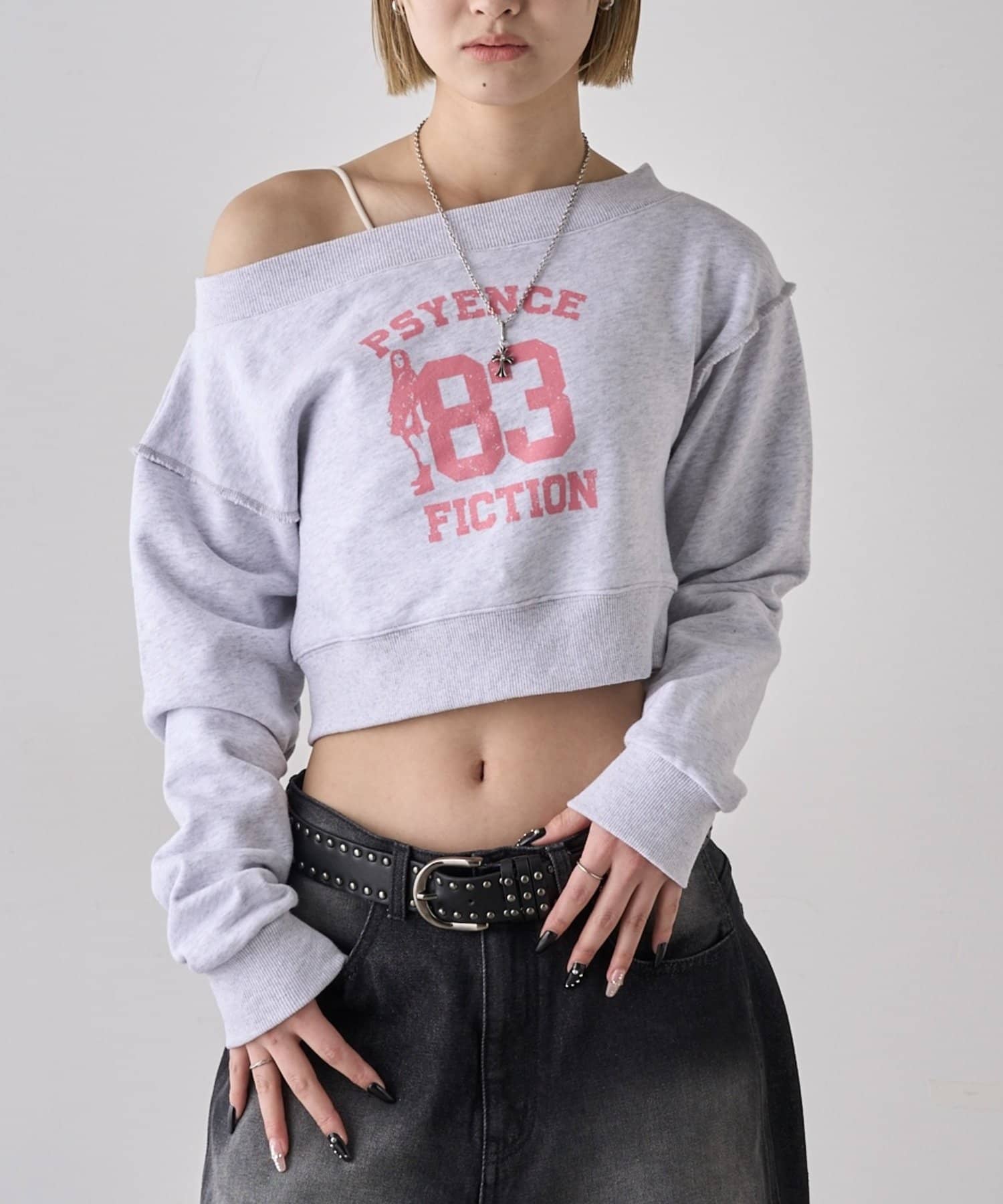 ・カジュアルなスウェットをワンショルダーにすることによって、女性らしさもプラスされるトップス。