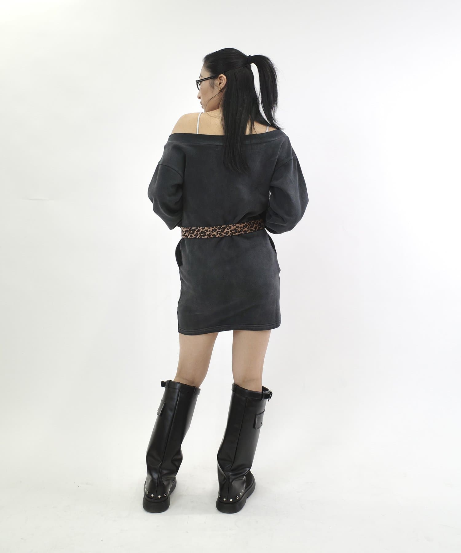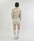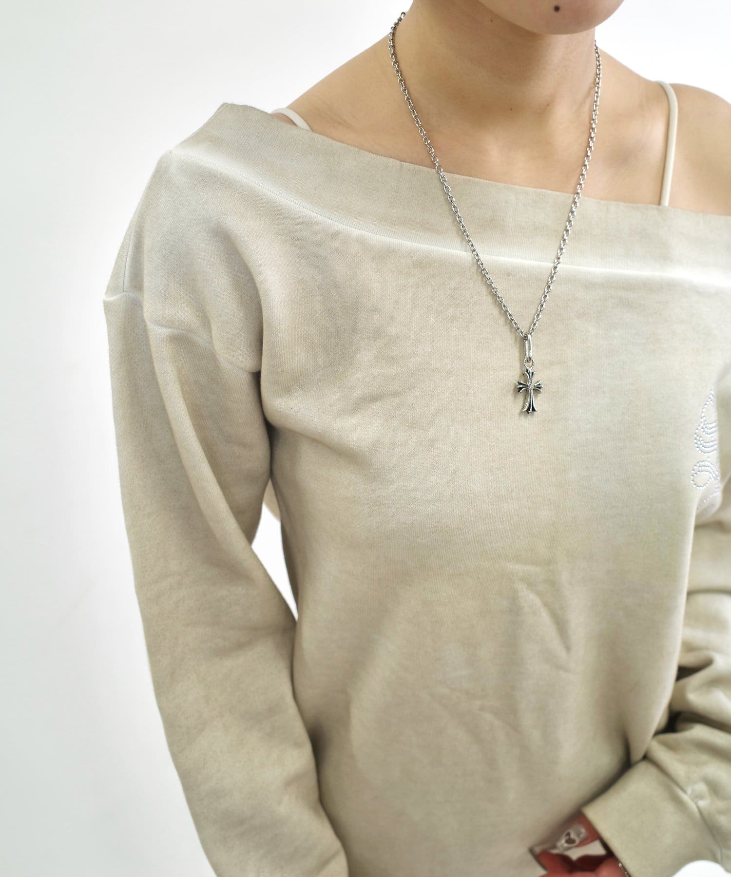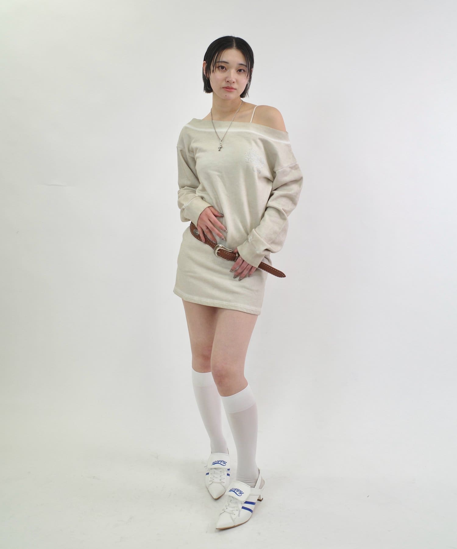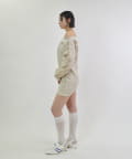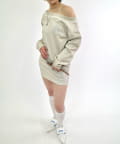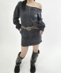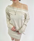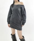 ・スウェットでカジュアルに見えますが、ワンショルダーで肩を見せることで、デコルテを綺麗に見せ、華奢な女性らしさを引き立ててくれます。