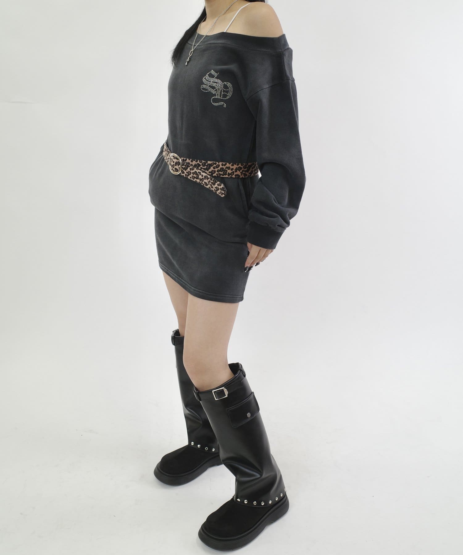 オフショルでも普通に着ても、しっかりと前からラインストーンが見えるように、こだわっています。