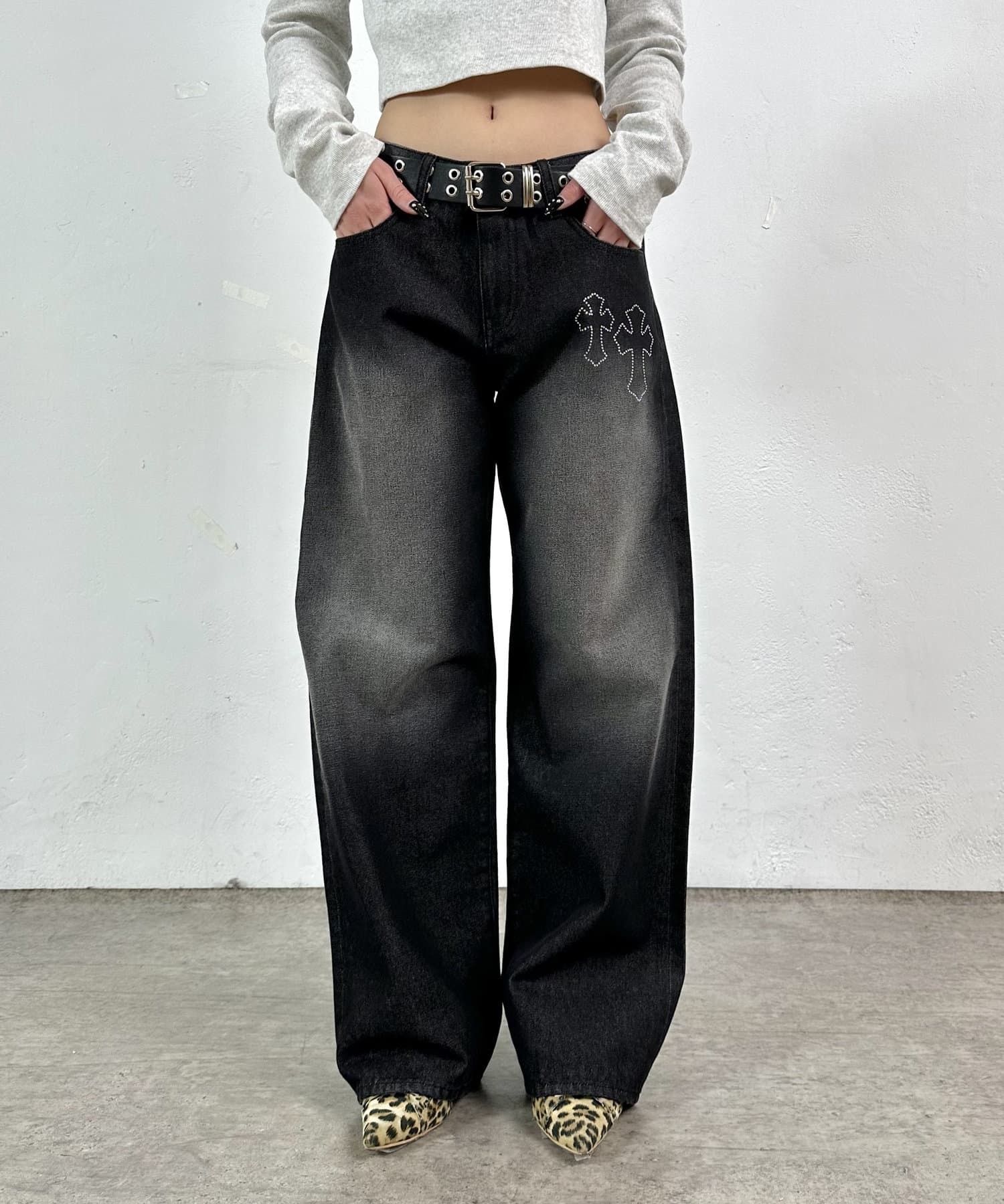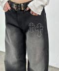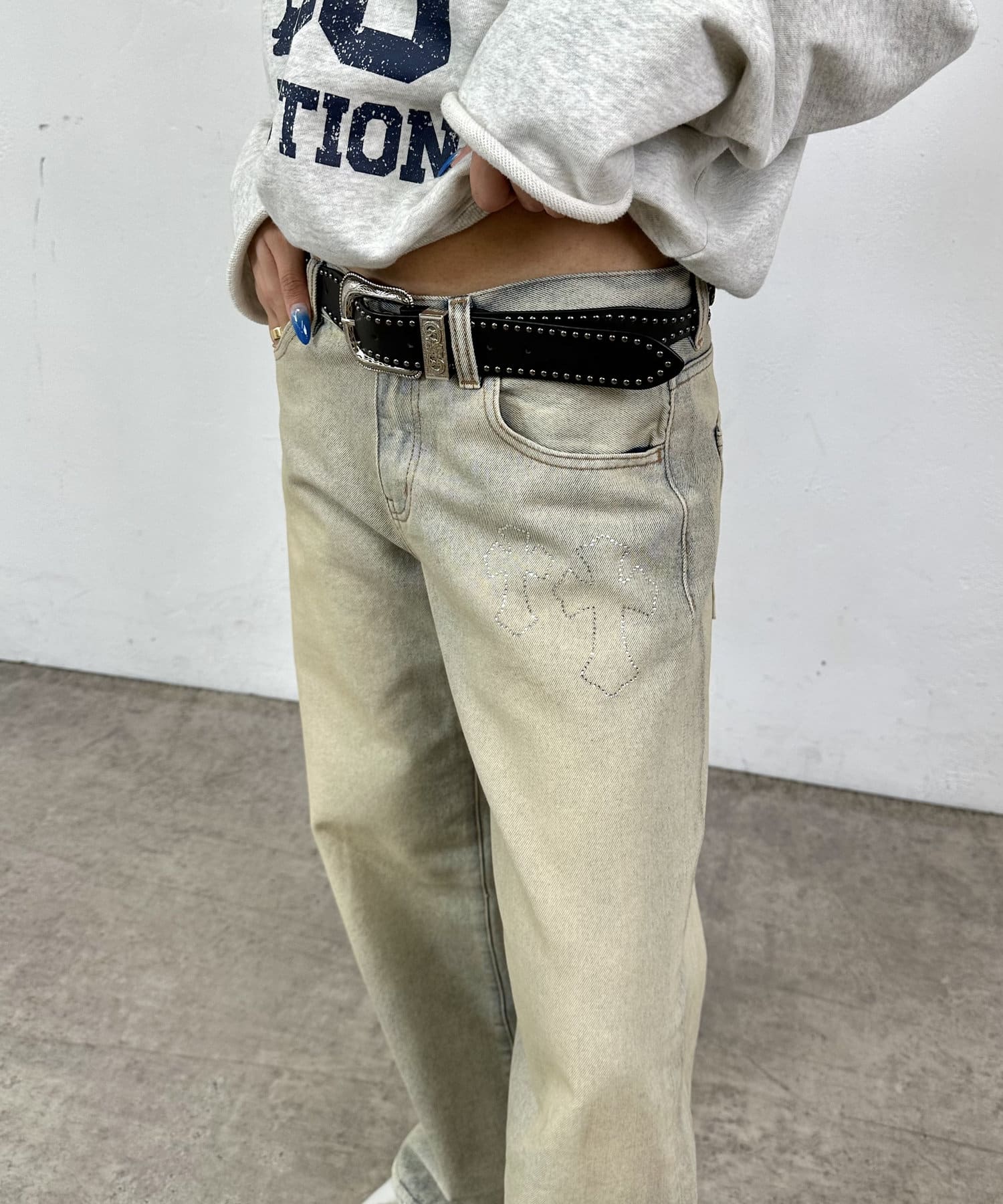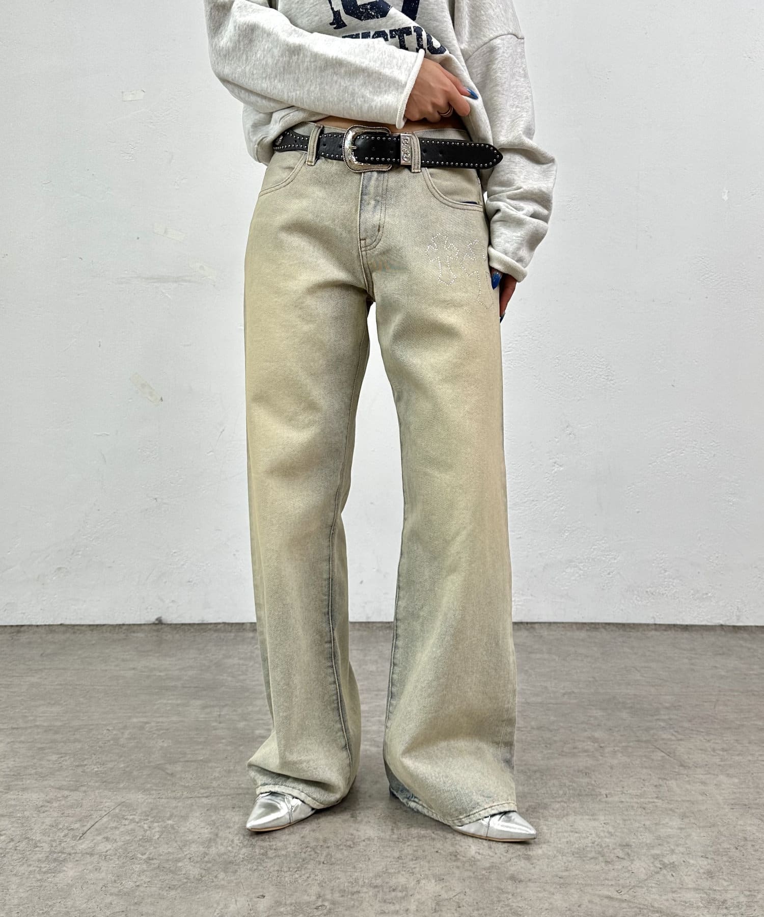 ラインストーンが特徴的なデニム。