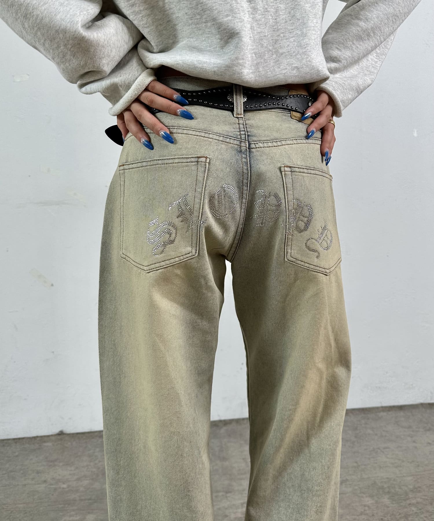 ・前と後ろにラインストーンが施されており、ギャル感溢れるデニム。