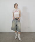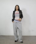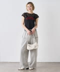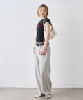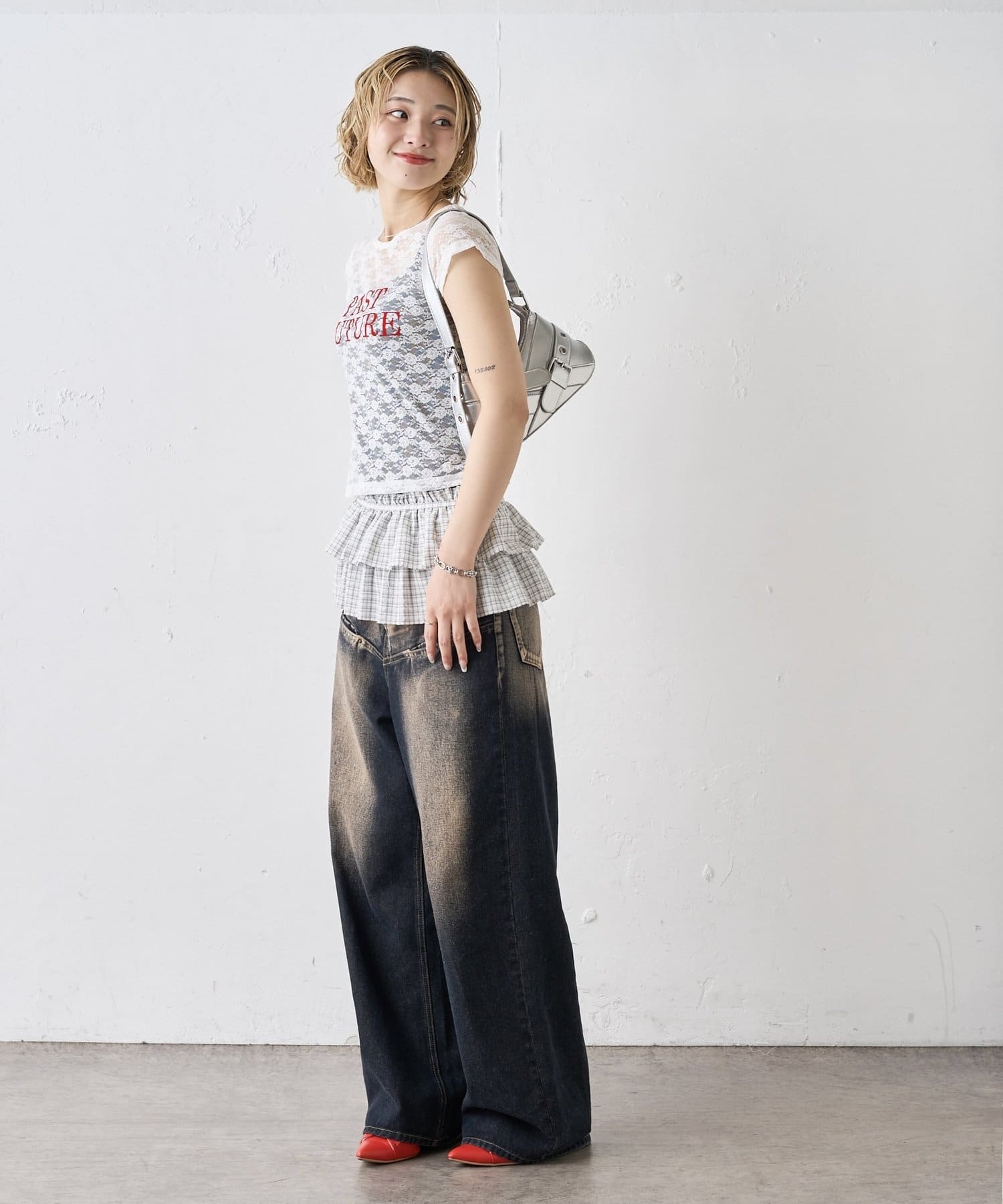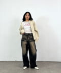 →ワイドデニムとコンパクトトップスで、スタイルアップにも期待できます。