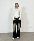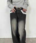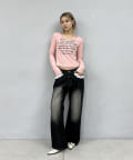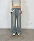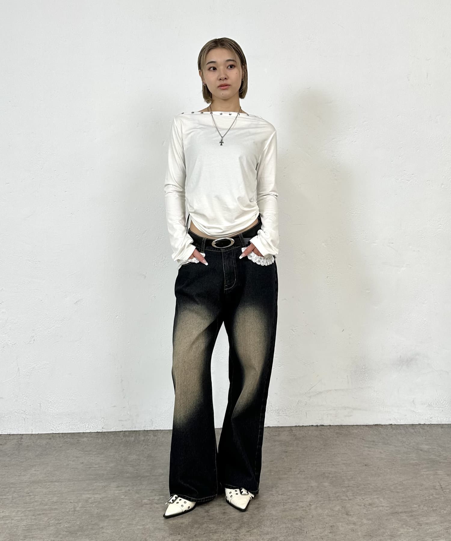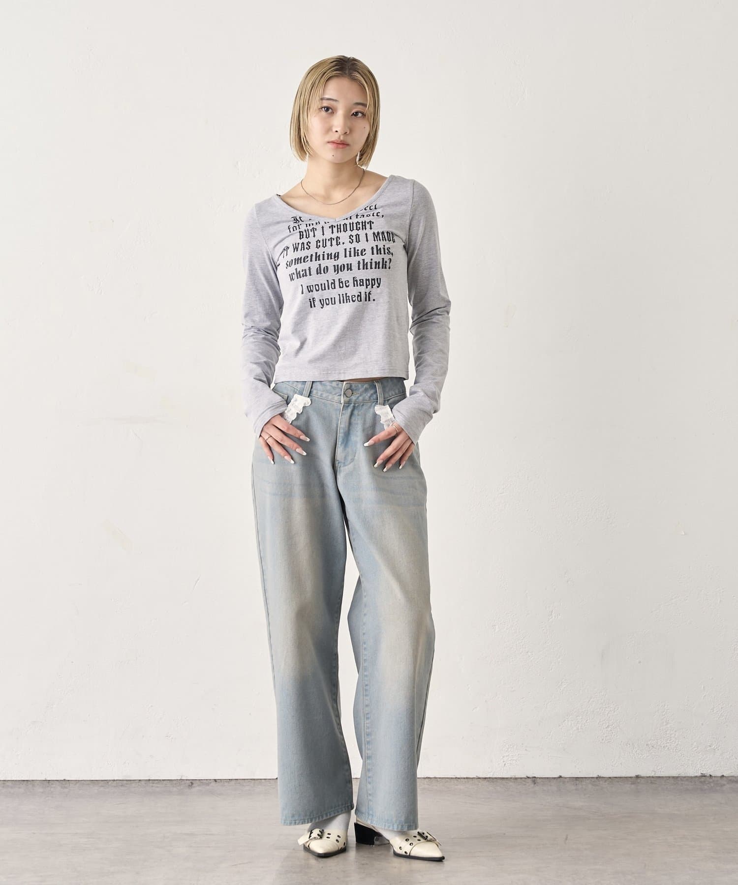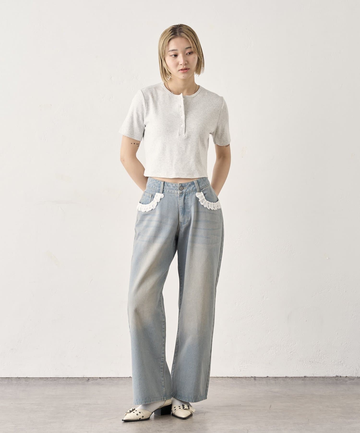 →デニムにレースがポイントで付いているので、シンプルなトップスで合わせてもオシャレに見えます。