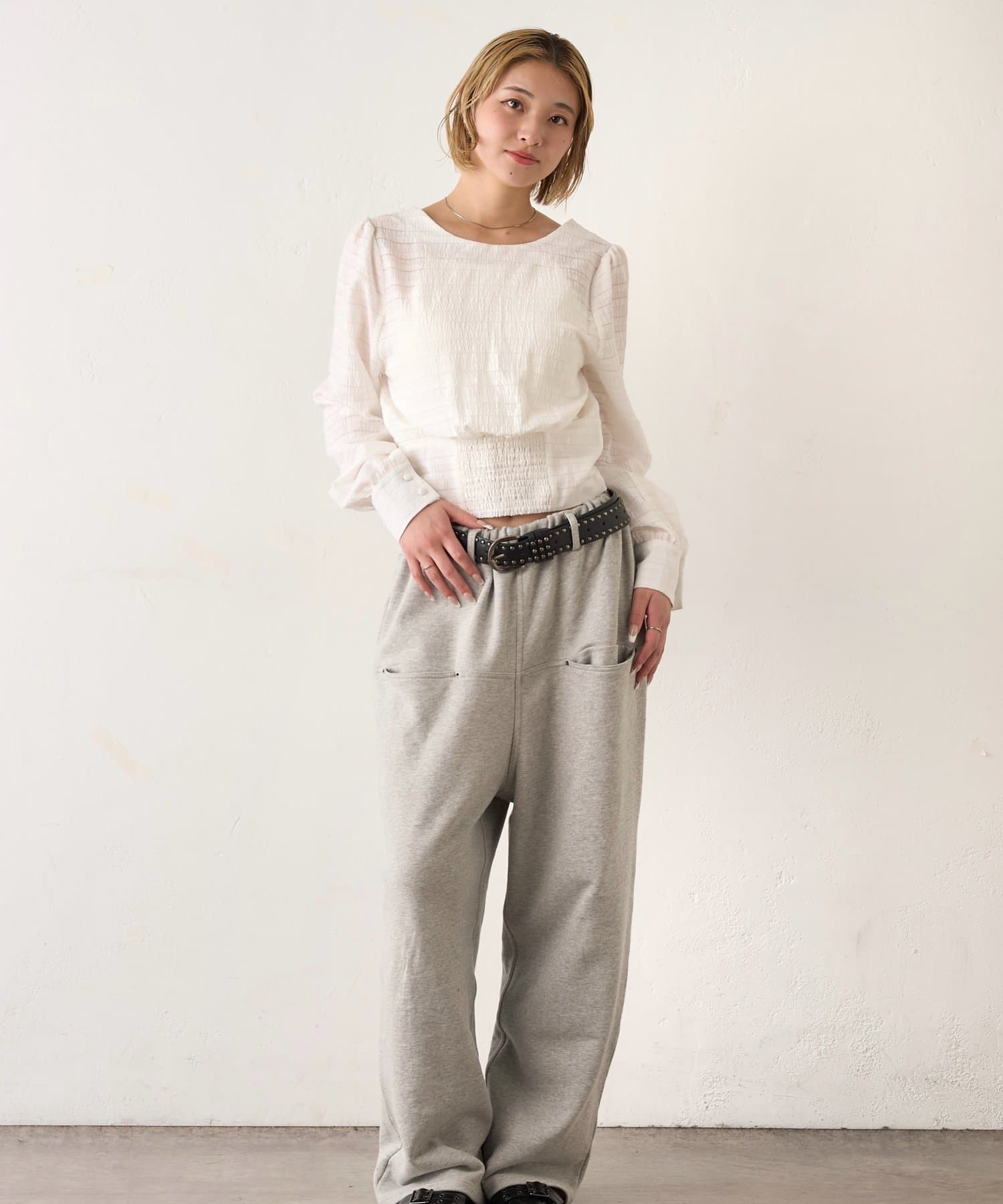 →あえてスウェット素材でバランスをとることで、こなれた印象になりオシャレなコーデに。