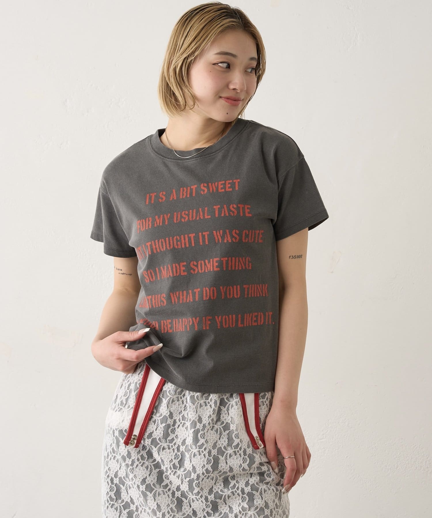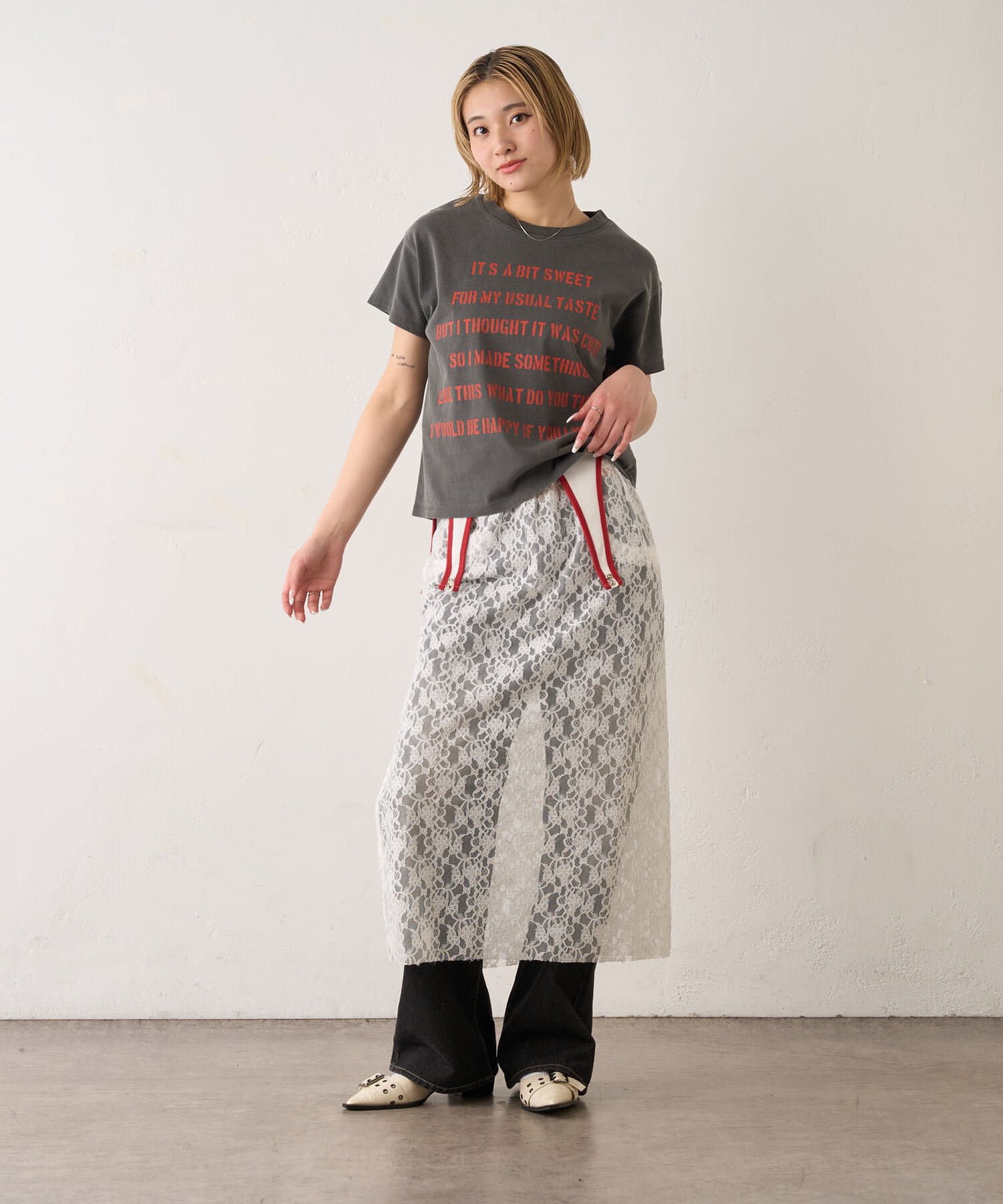 • 165cm/骨格ウェーブ/TOPS:ヴィンテージライクステンシルTEEPN/レースローライズワイドデニム/レイヤードレーススカート