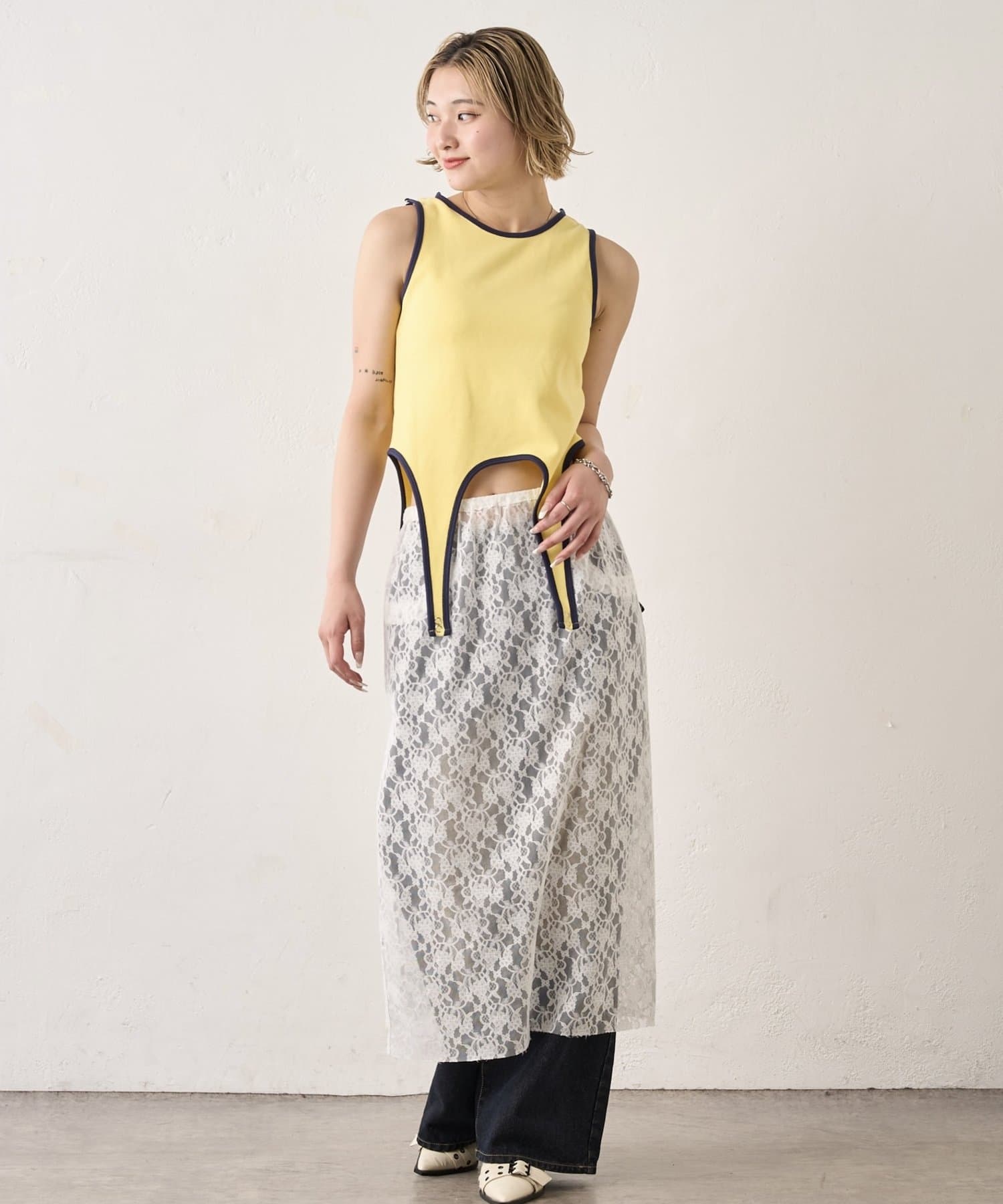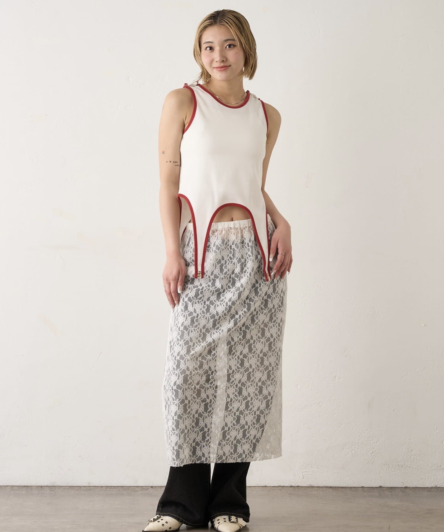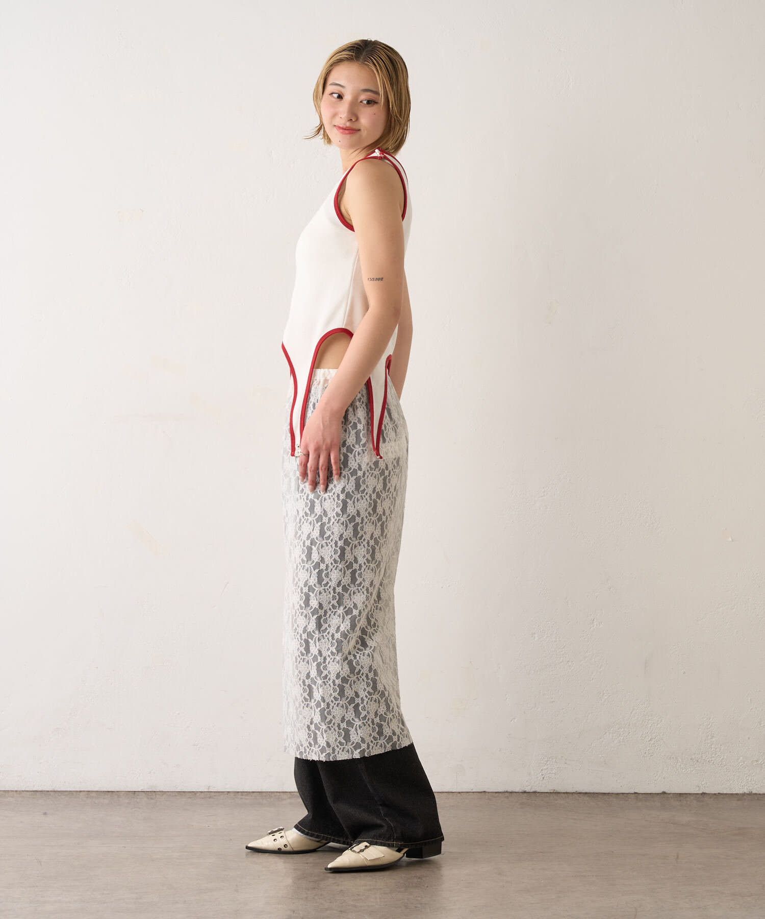 • 165cm/骨格ウェーブPN/レースローライズワイドデニム/レイヤードレーススカート