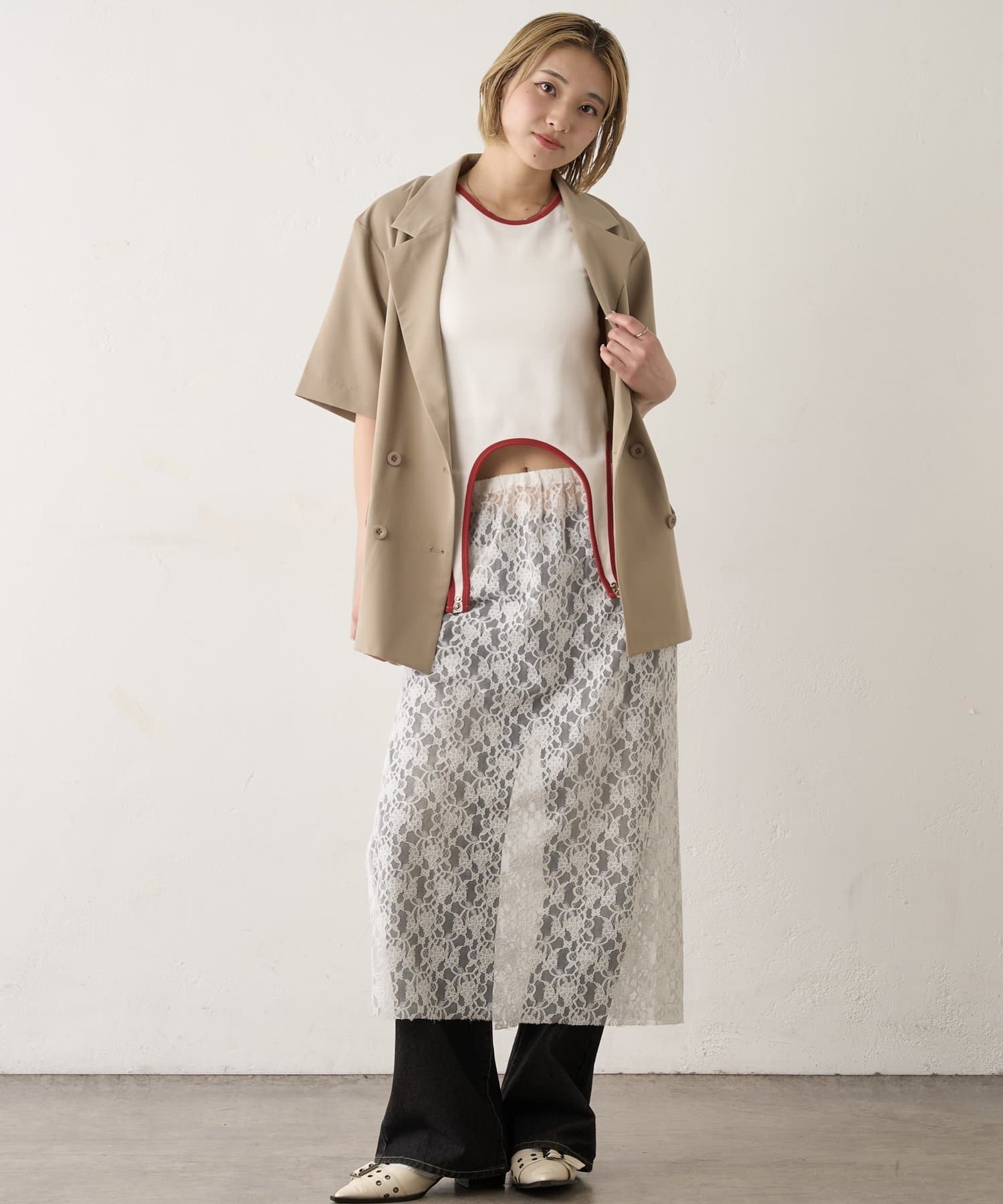 • 165cm/骨格ウェーブ/JK:テーラードダブルジャケットPN/レースローライズワイドデニム/レイヤードレーススカート