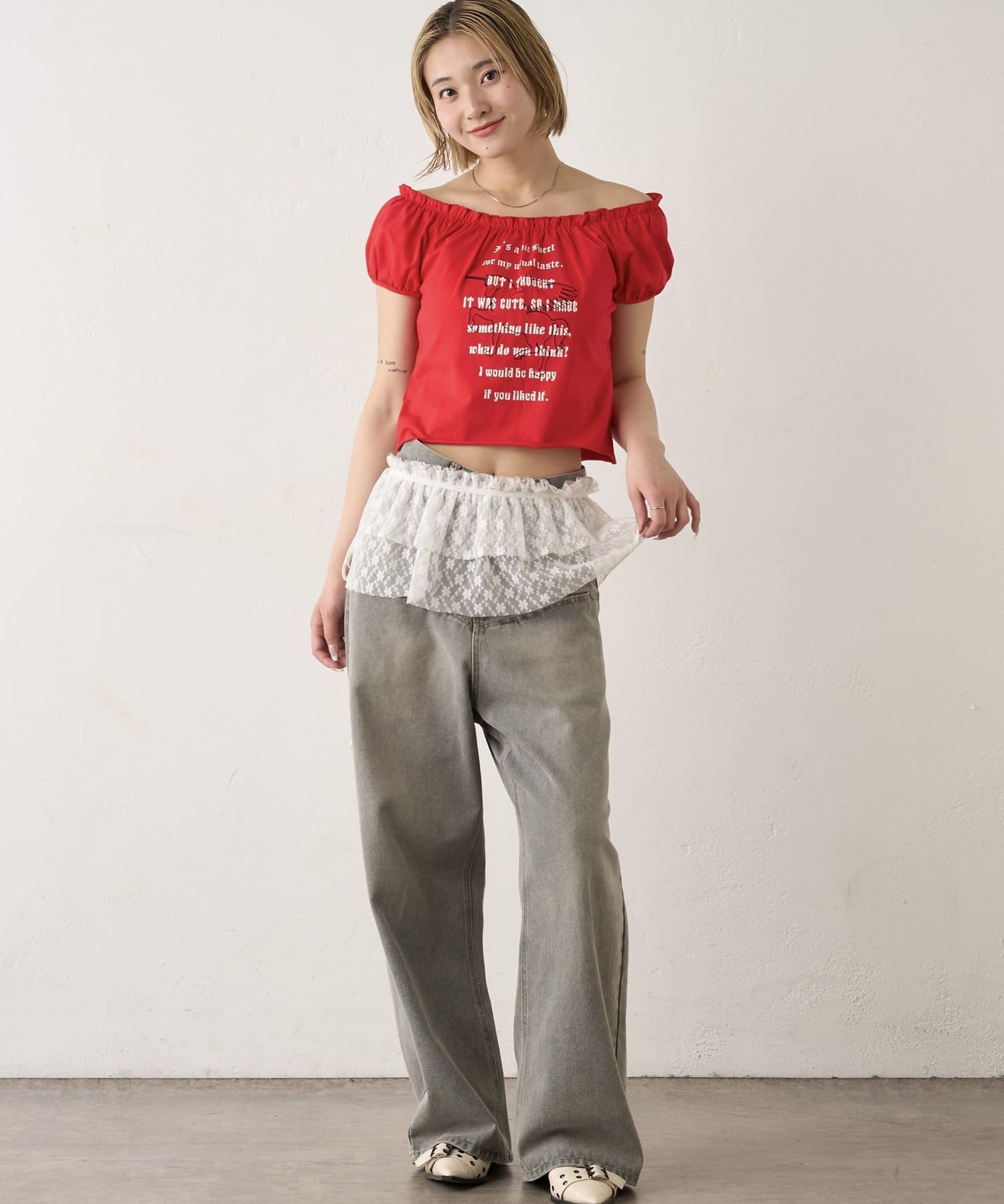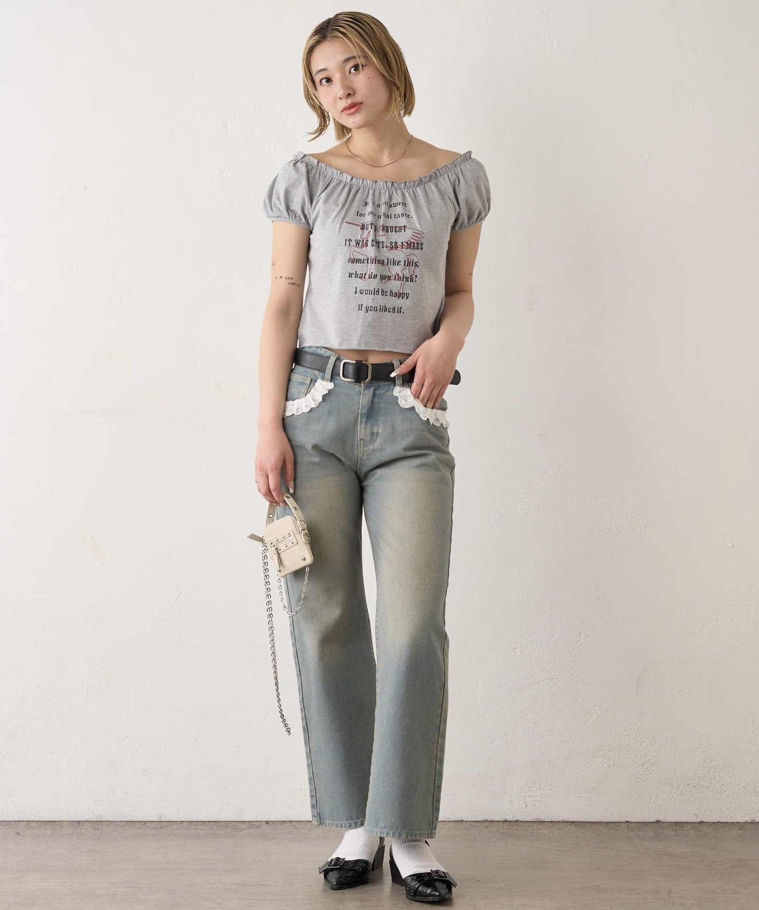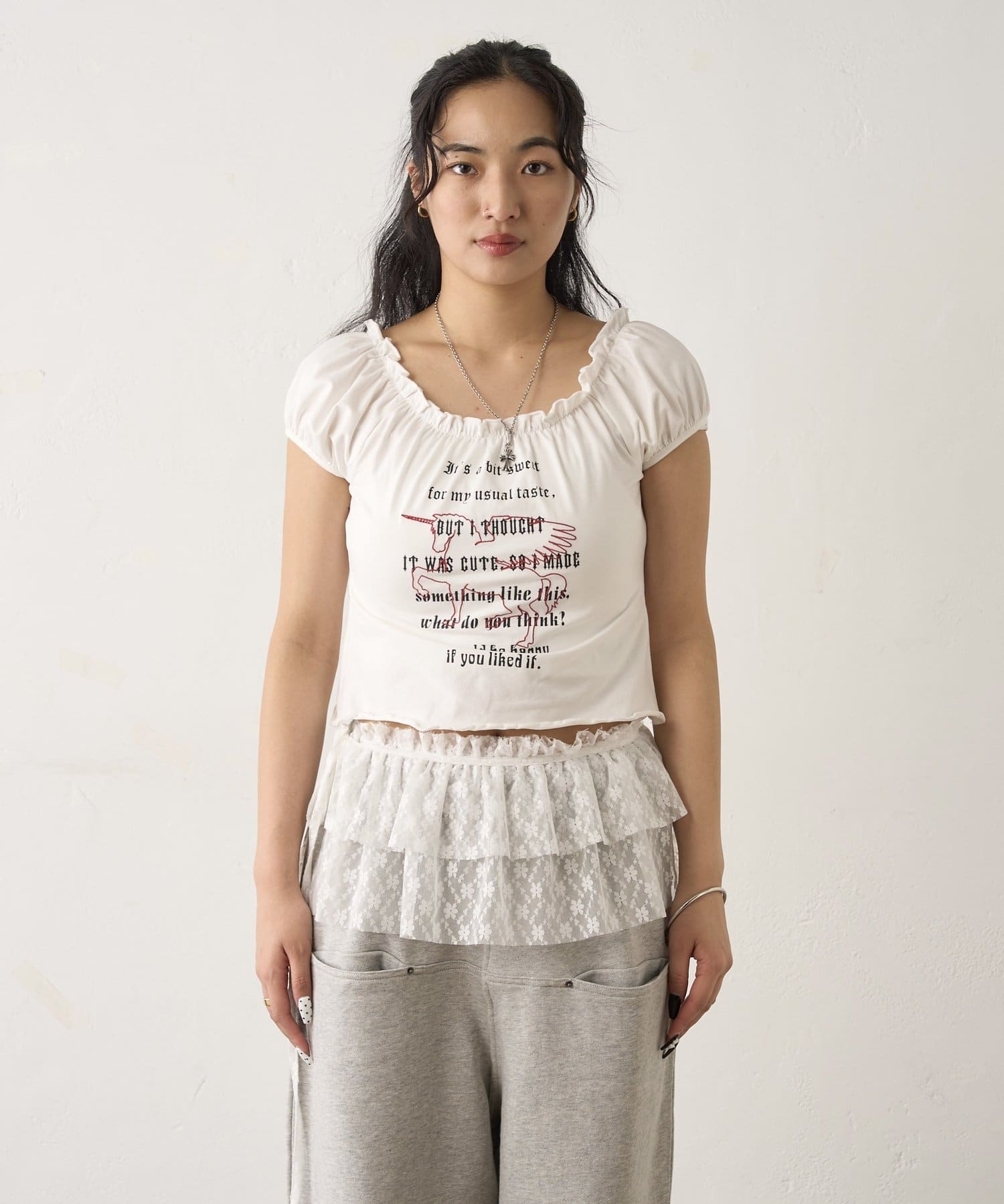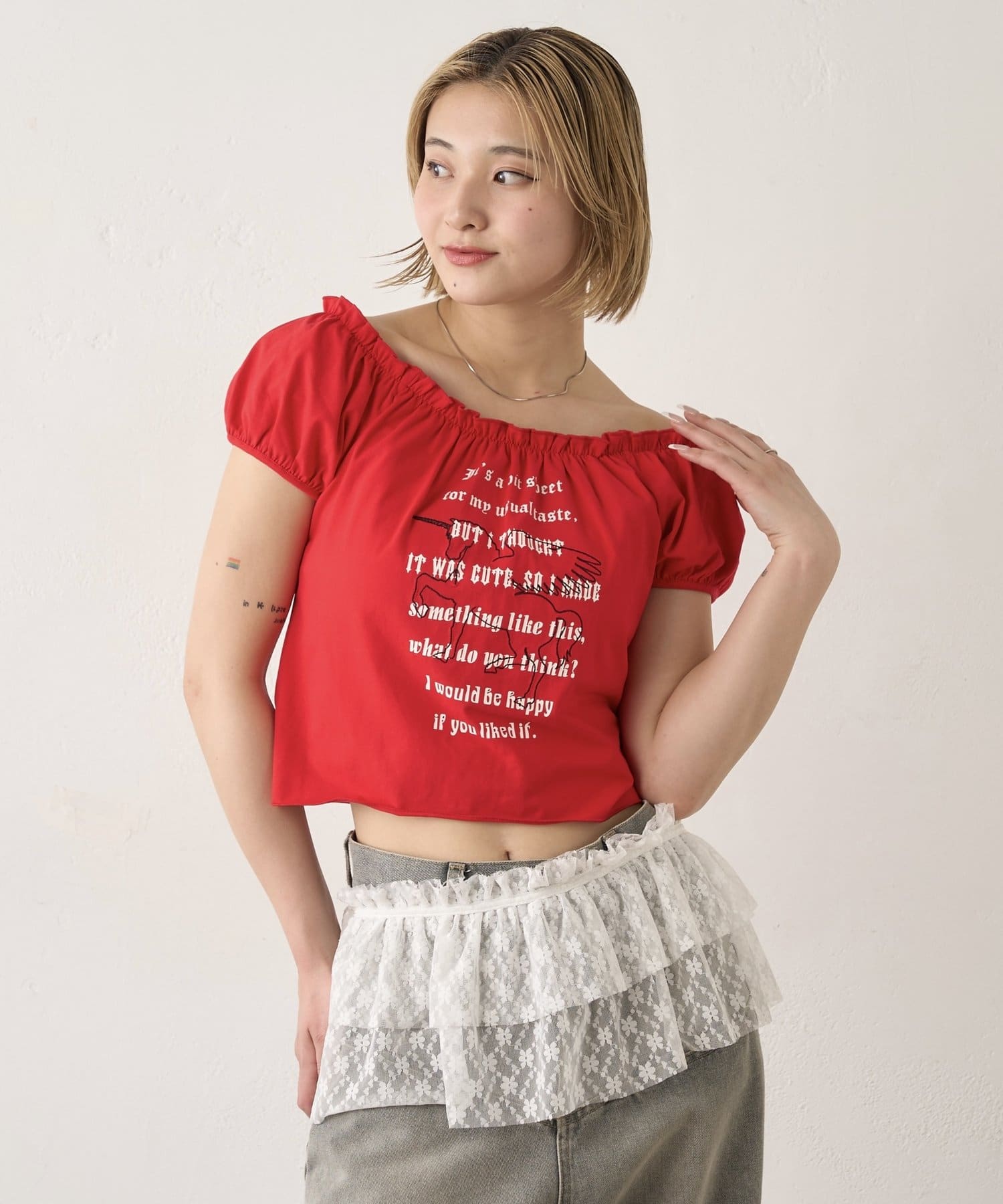 甘辛ミックスが叶う!ユニコーンデザインがポイントのオフショルトップス。