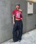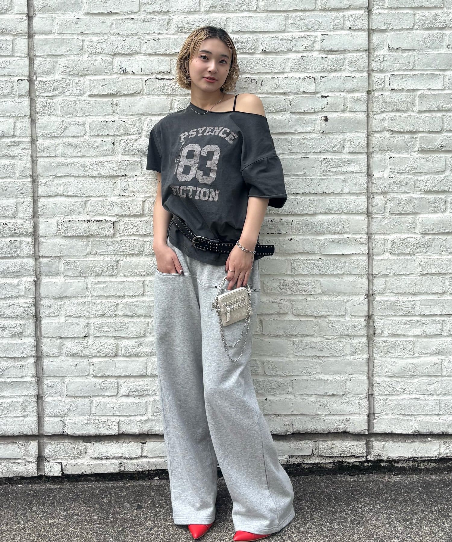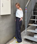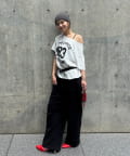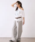 →今季トレンドのスウェットパンツに上からベルトを巻くと、ウエストマークにもなりスタイルアップ!