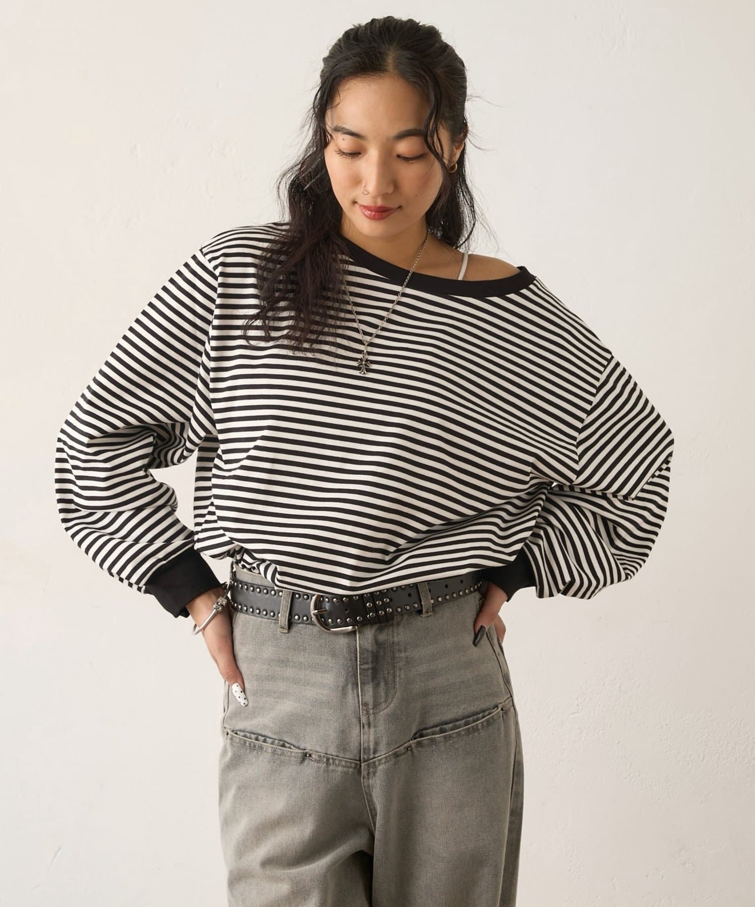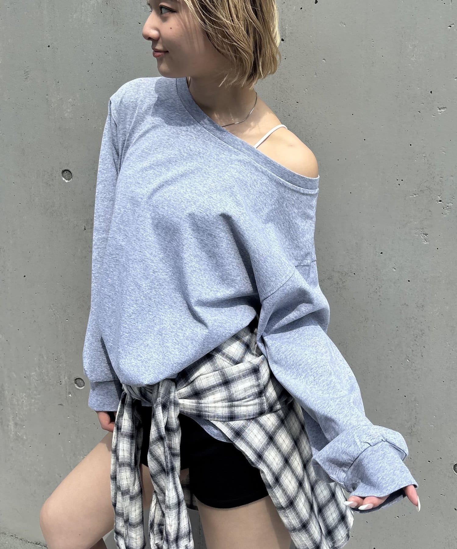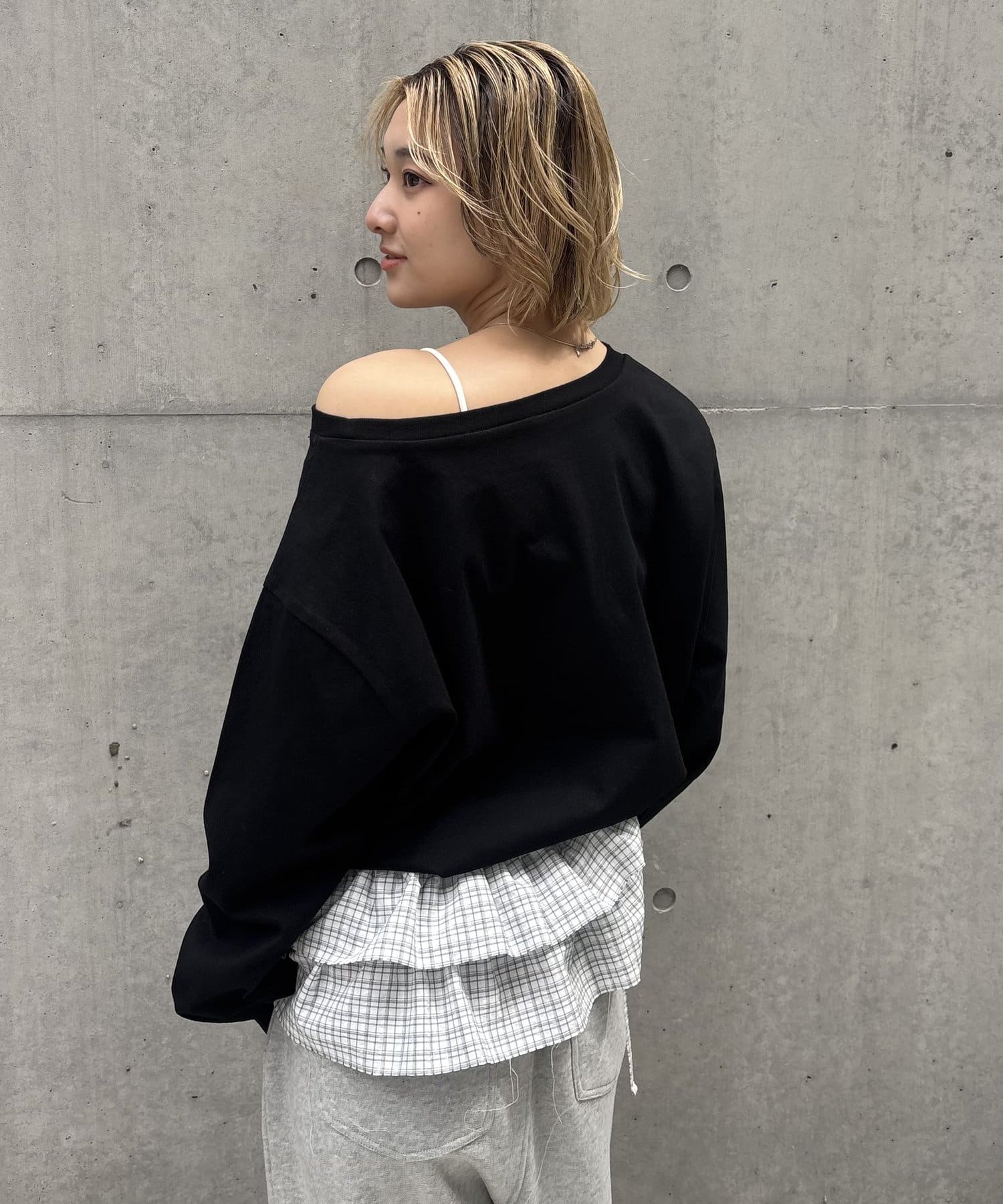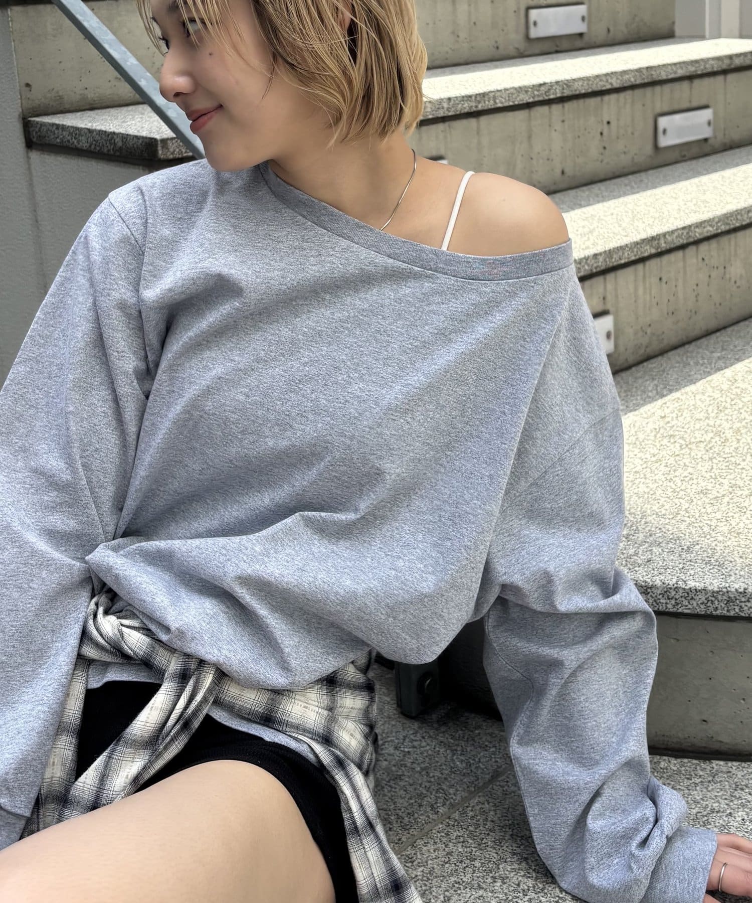 ・肩を出せるワンショルのシルエットでこなれ感が出せるロンT。もちろんそのままでも着用出来ます。