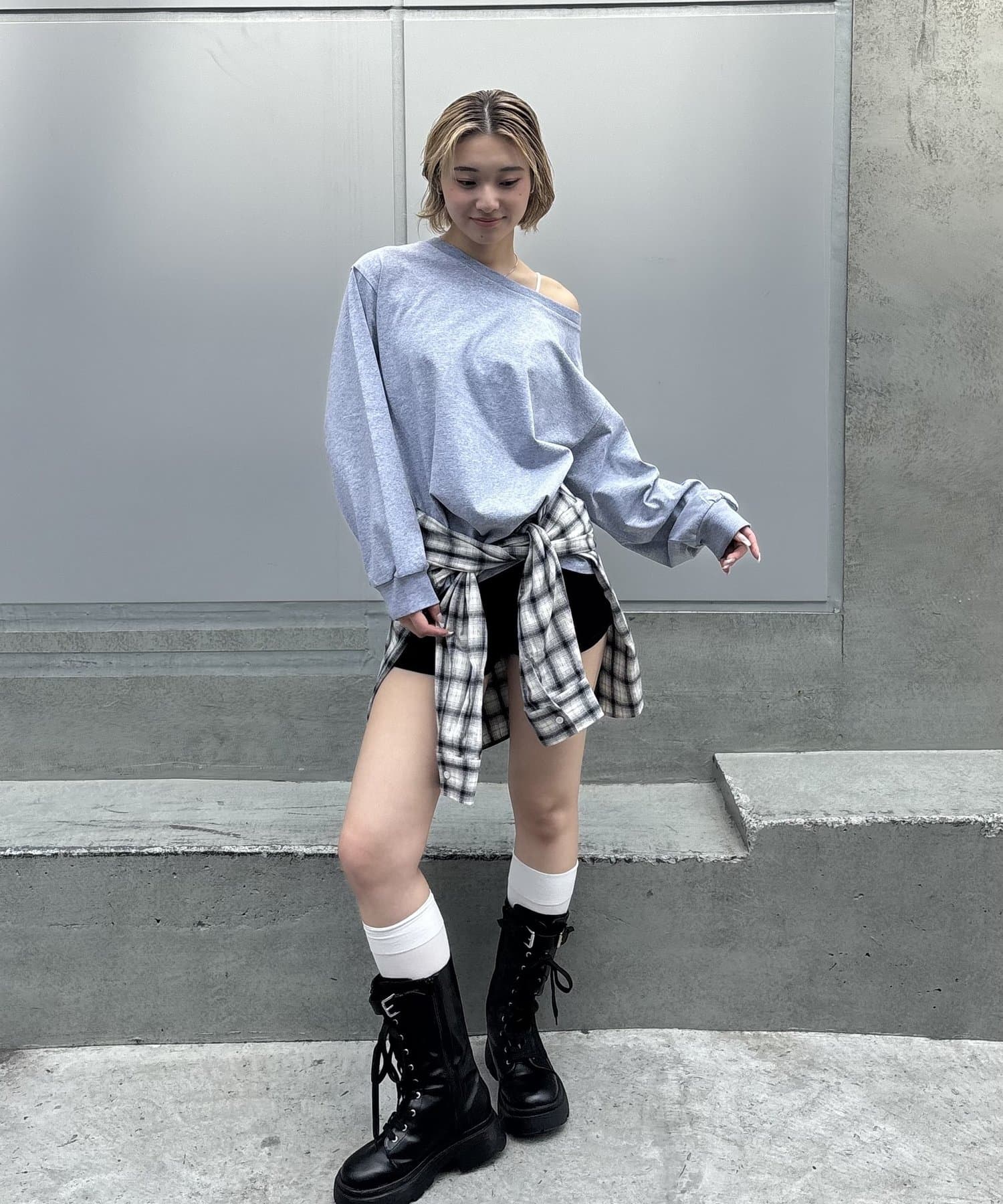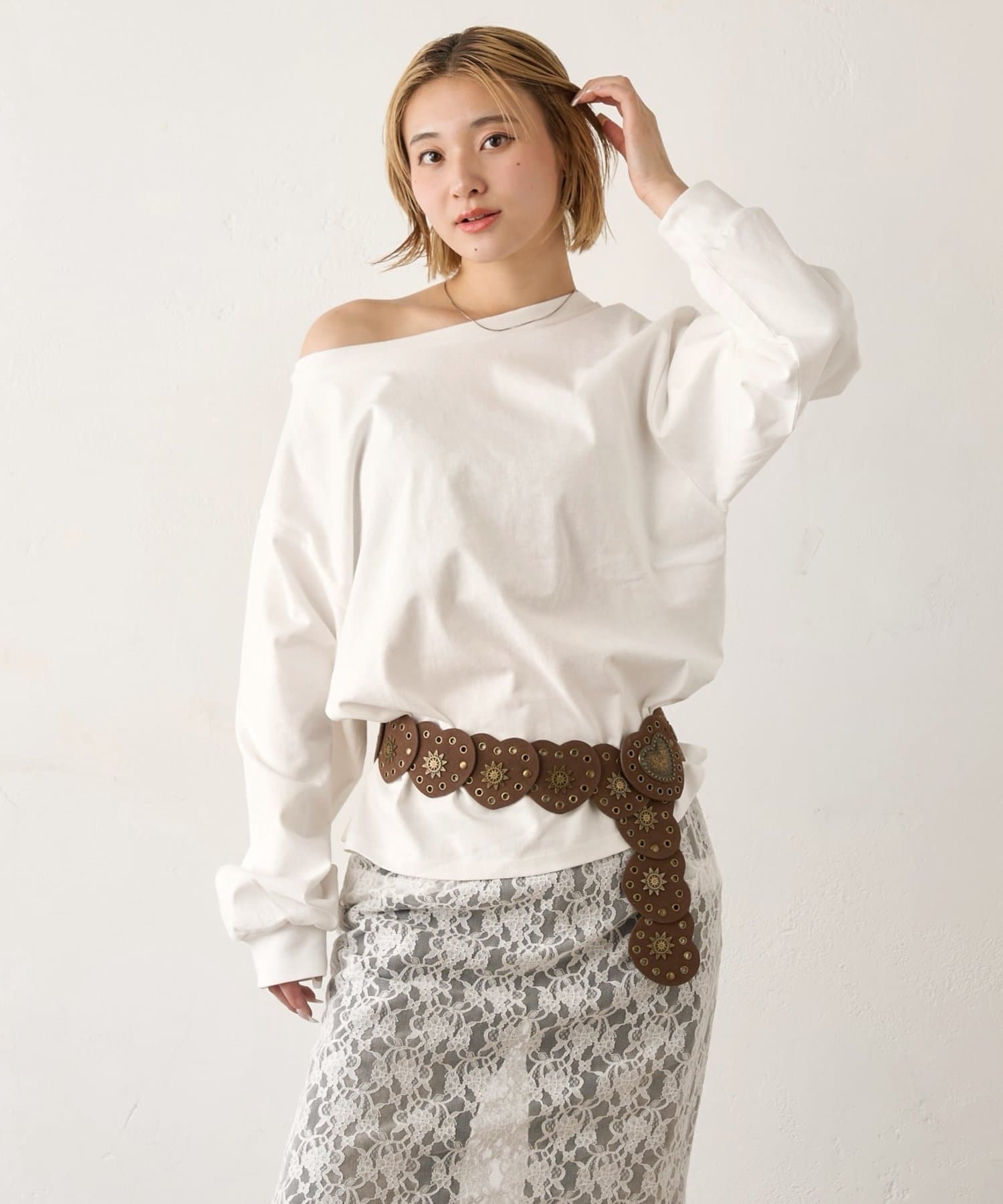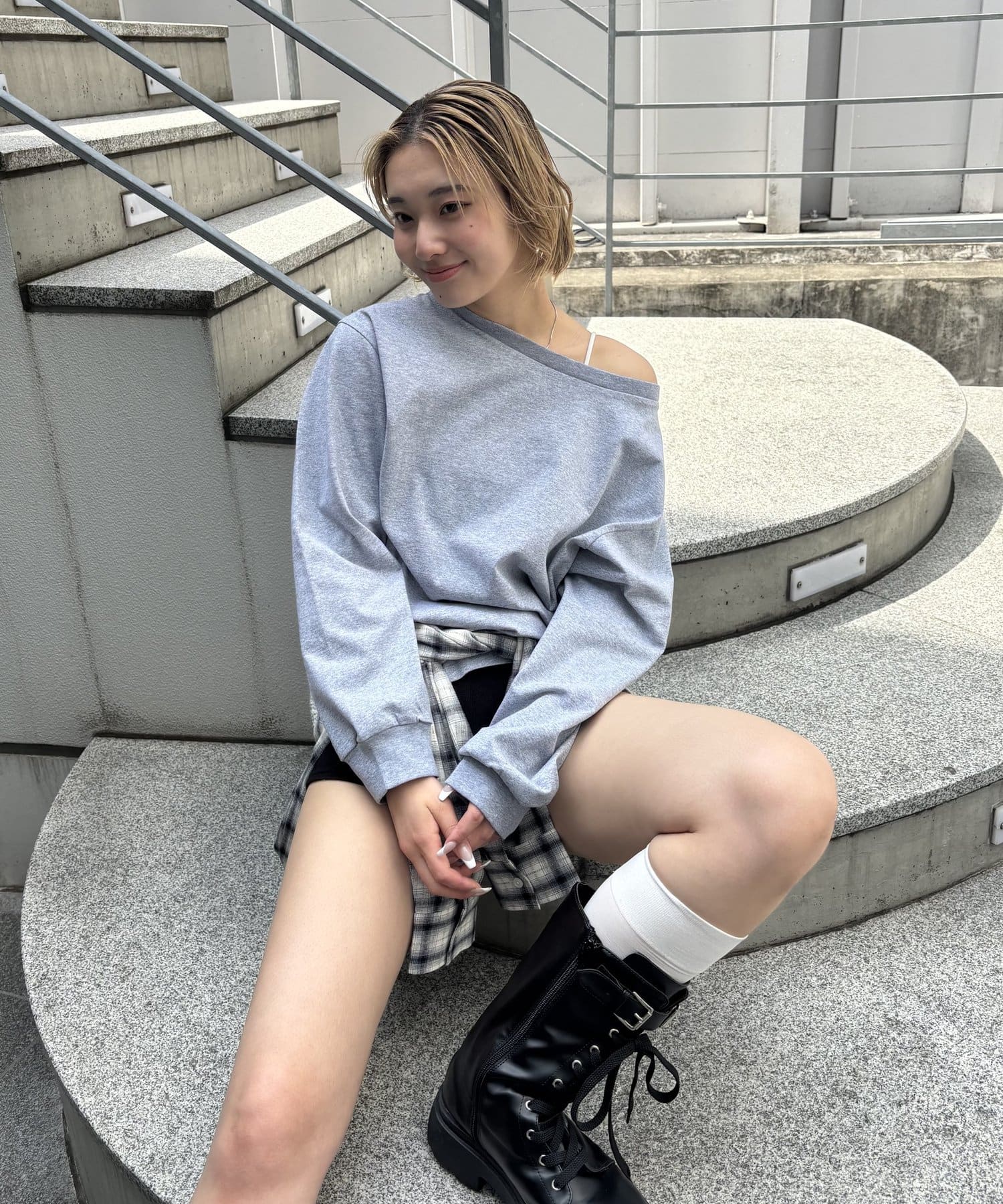 ・肩を出せるワンショルのシルエットでこなれ感が出せるロンT。もちろんそのままでも着用出来ます。