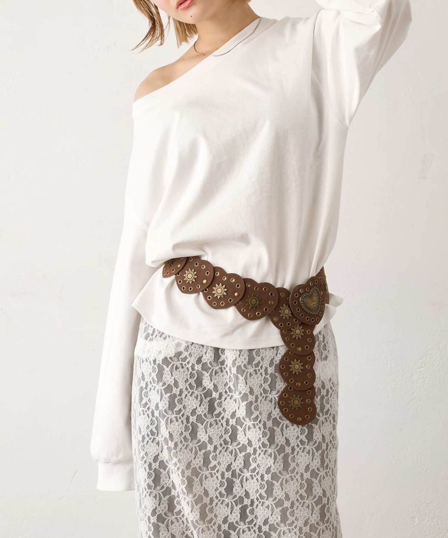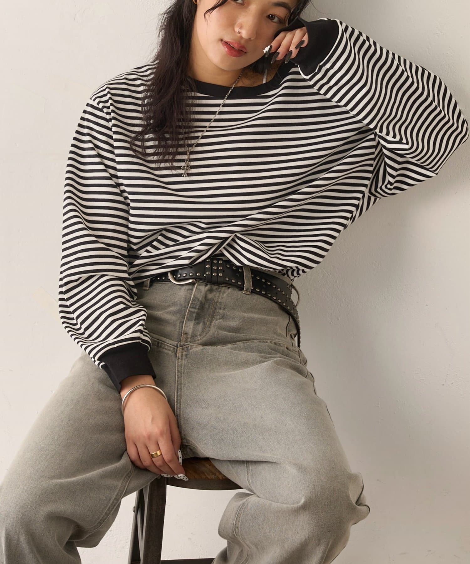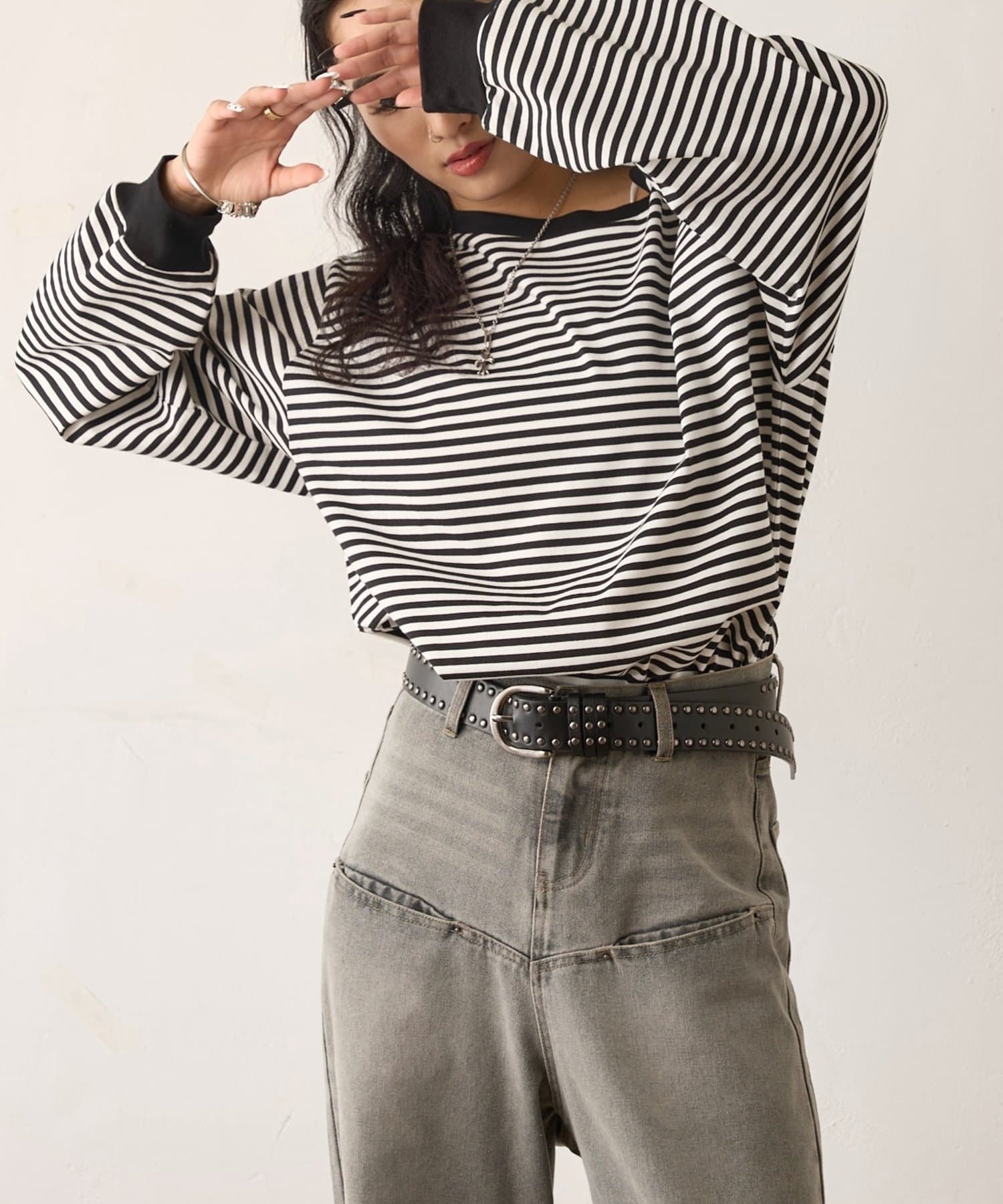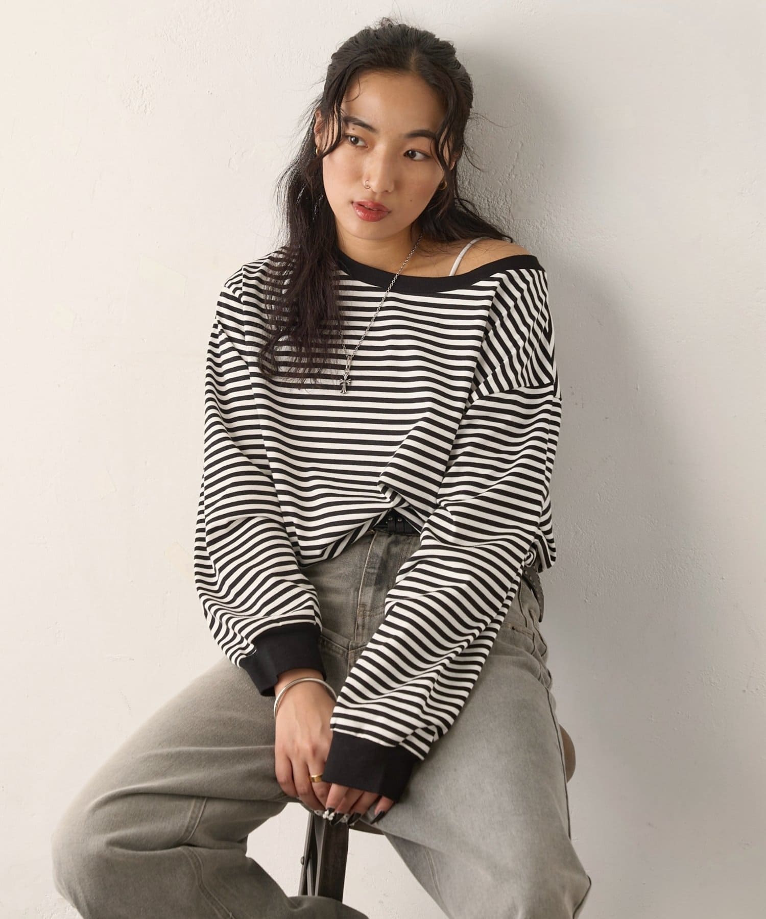 ・肩を出せるワンショルのシルエットでこなれ感が出せるロンT。もちろんそのままでも着用出来ます。