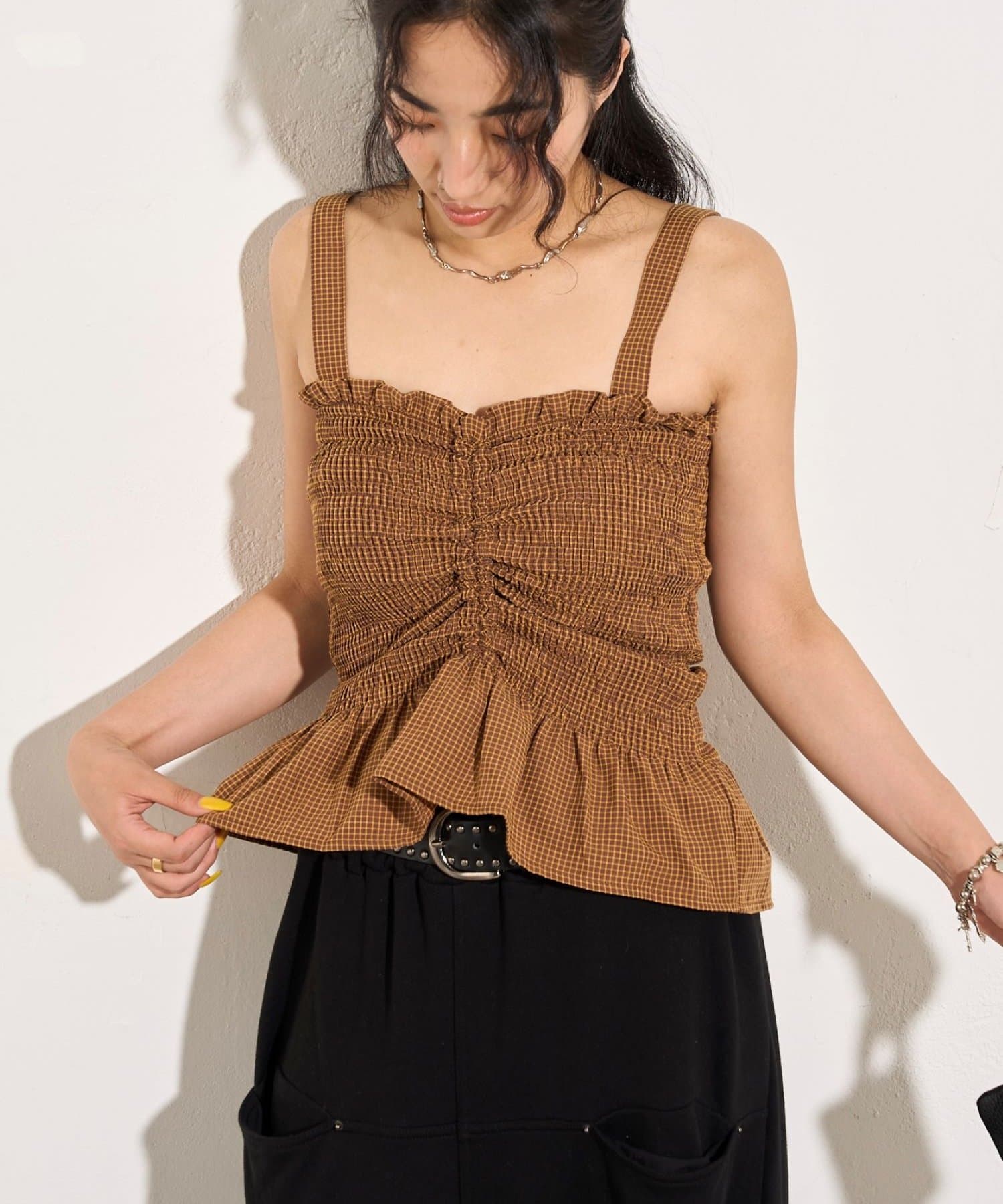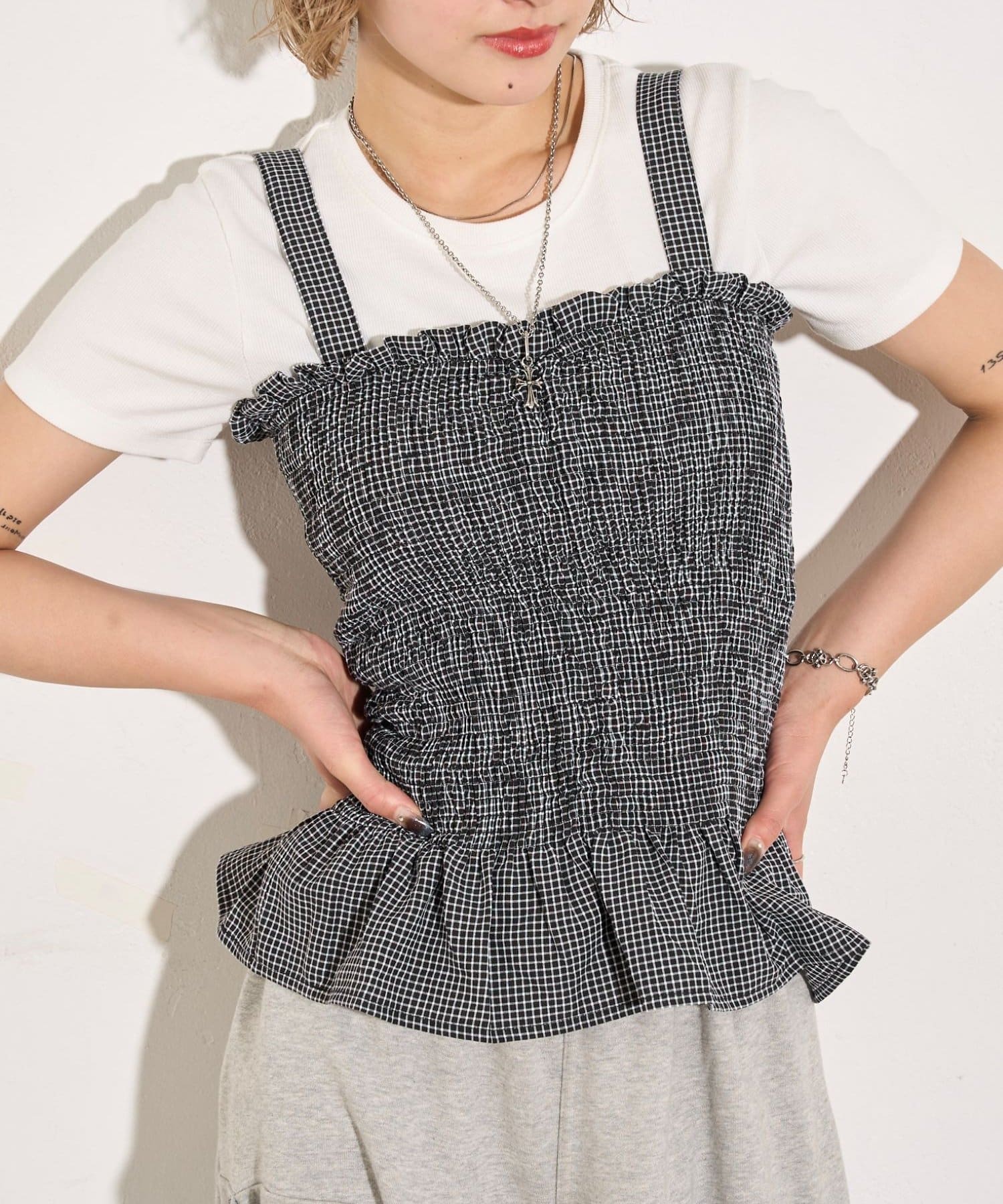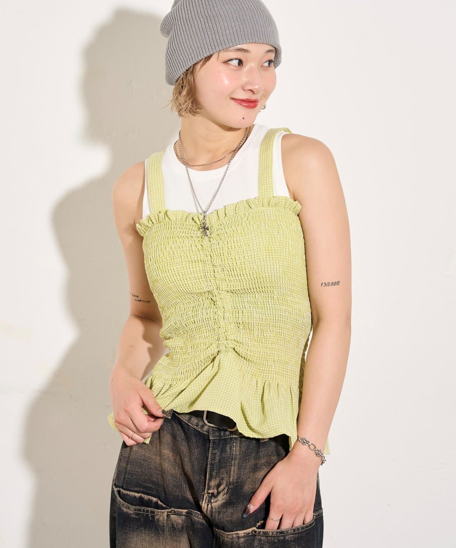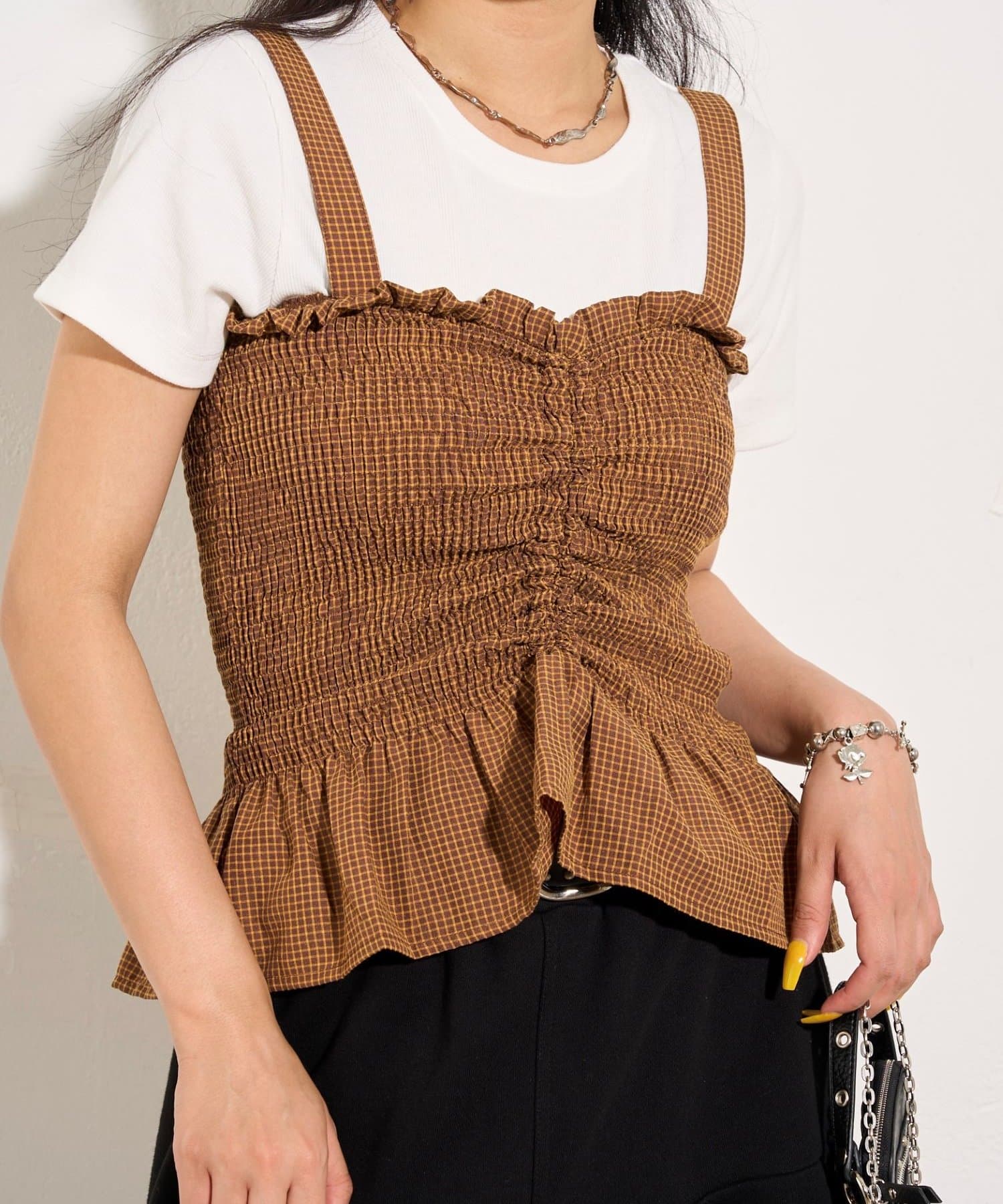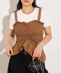 1枚でも重ね着しても着れる!シャーリングがポイントのビスチェ。