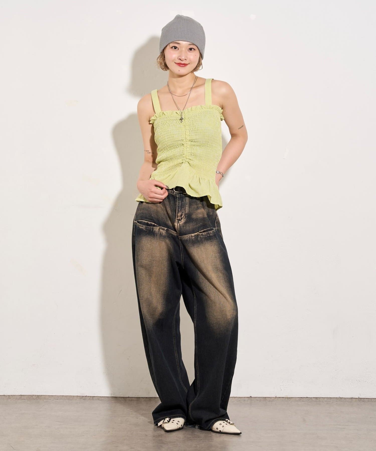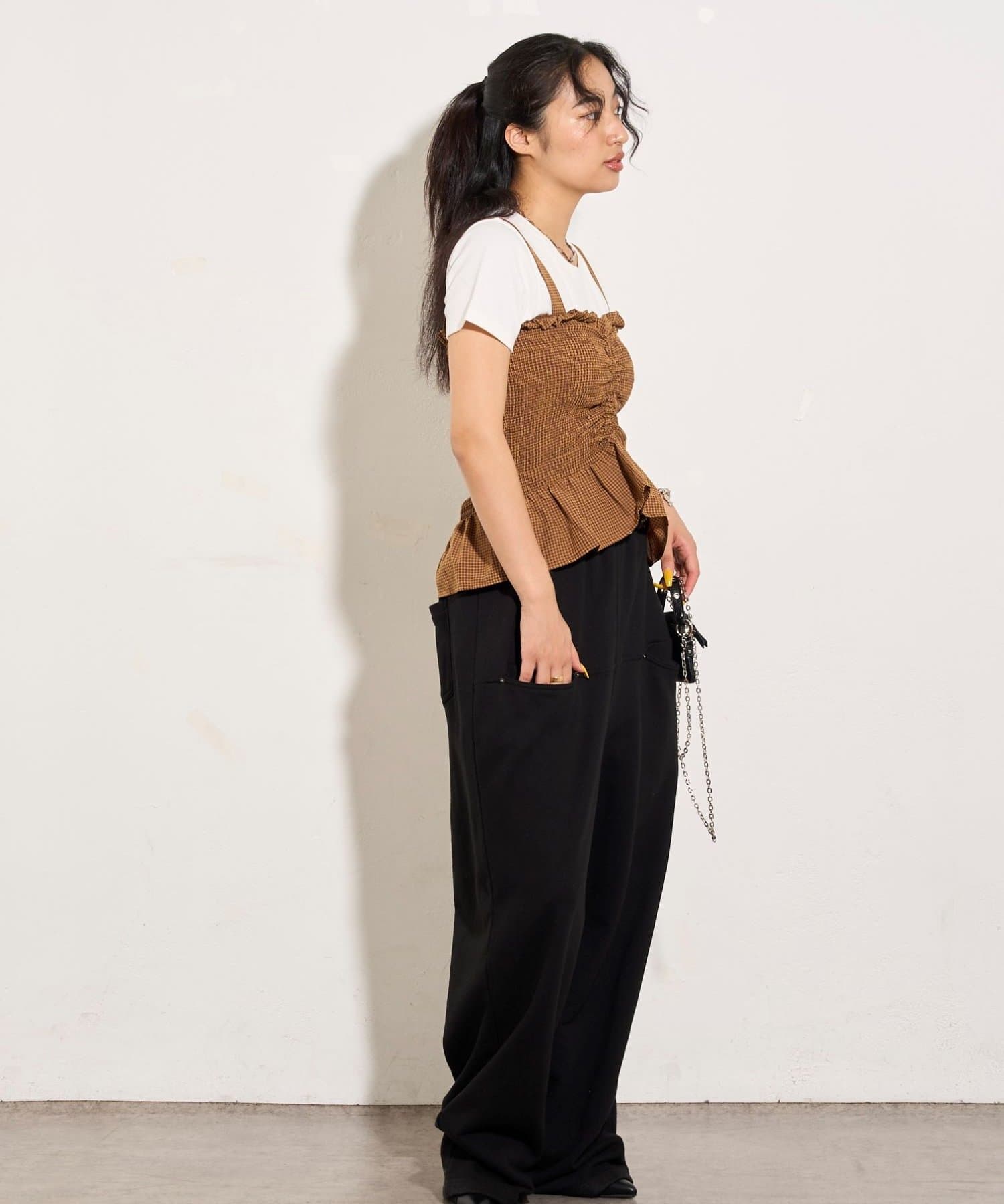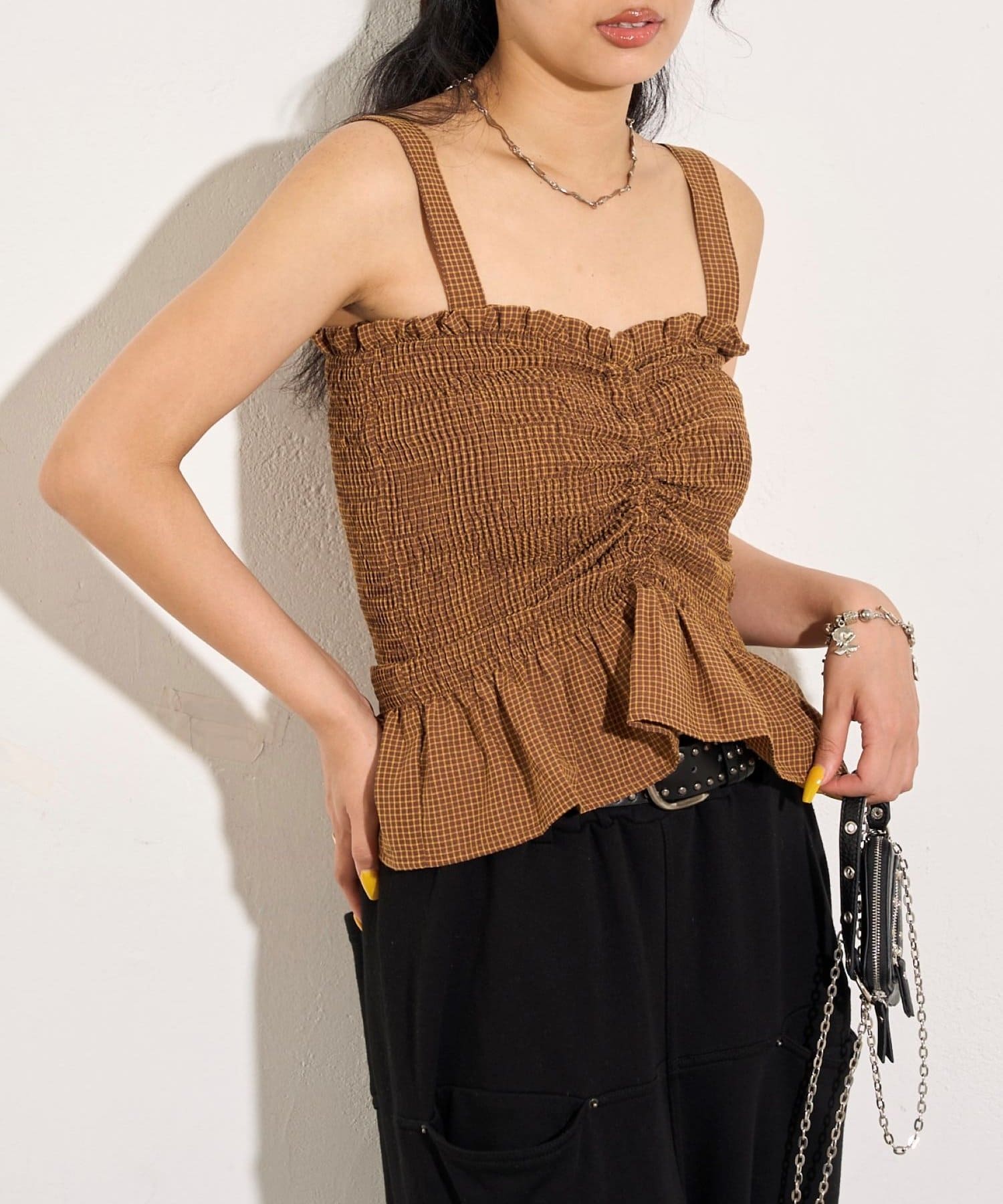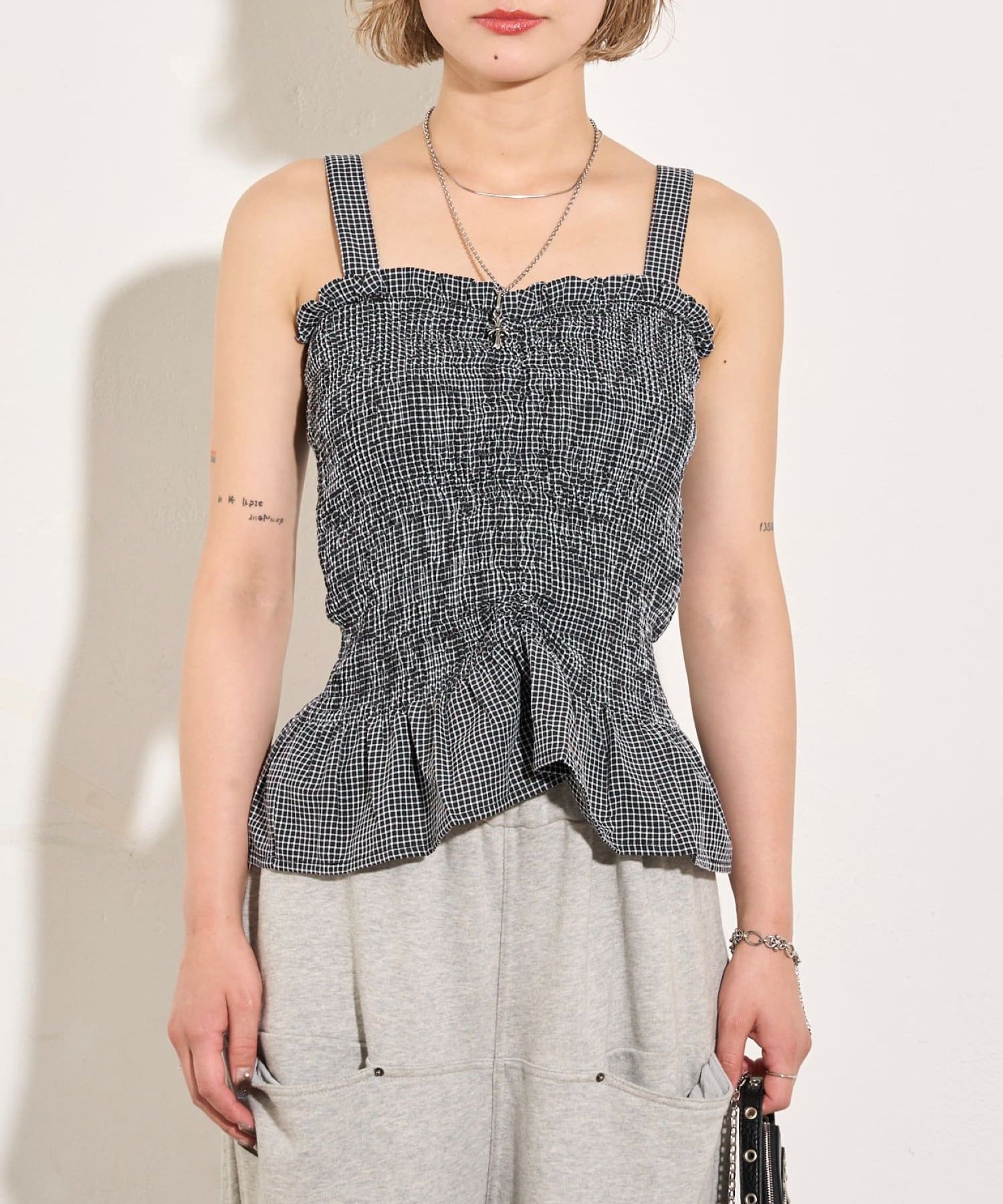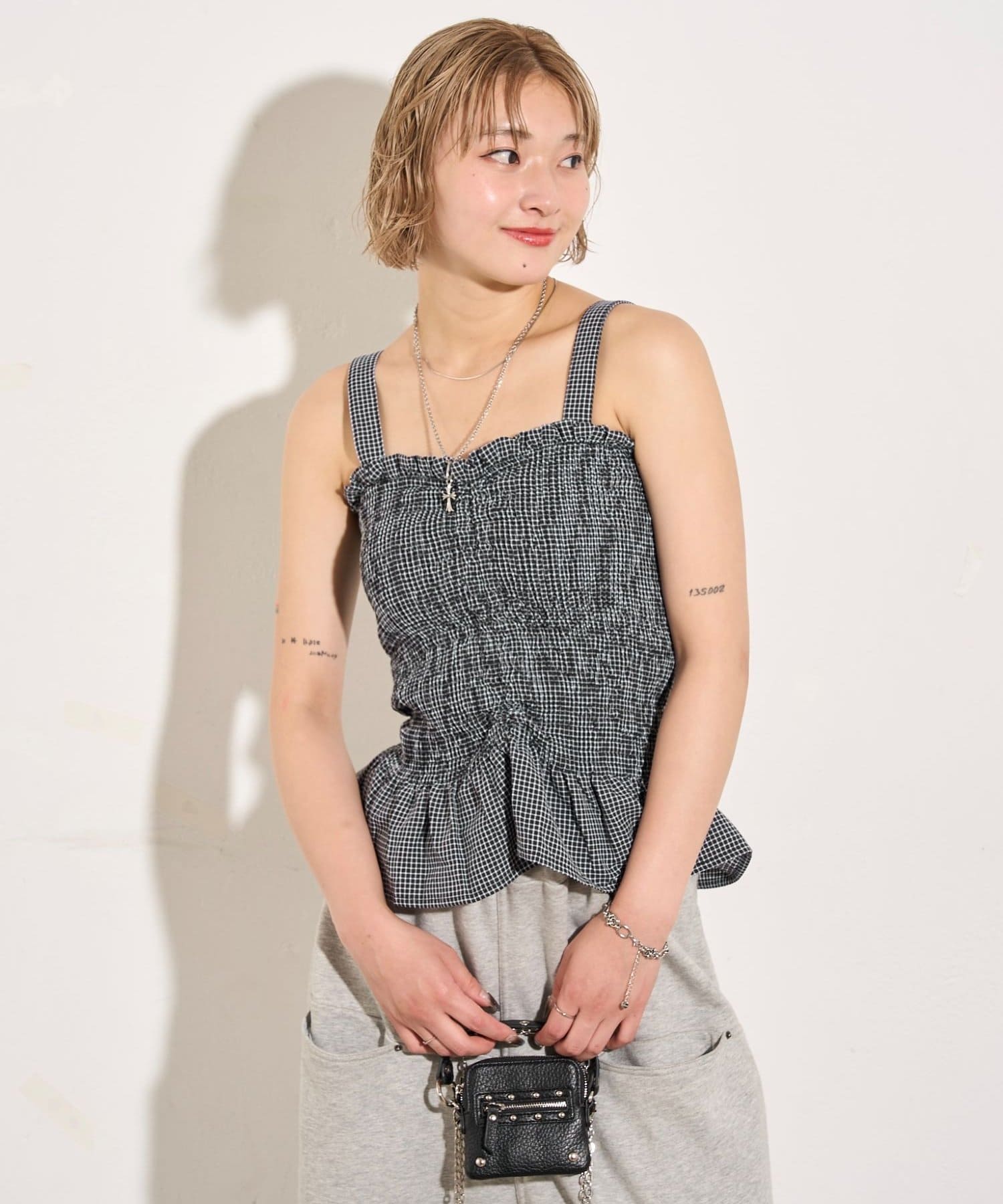 1枚でも重ね着しても着れる!シャーリングがポイントのビスチェ。