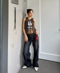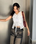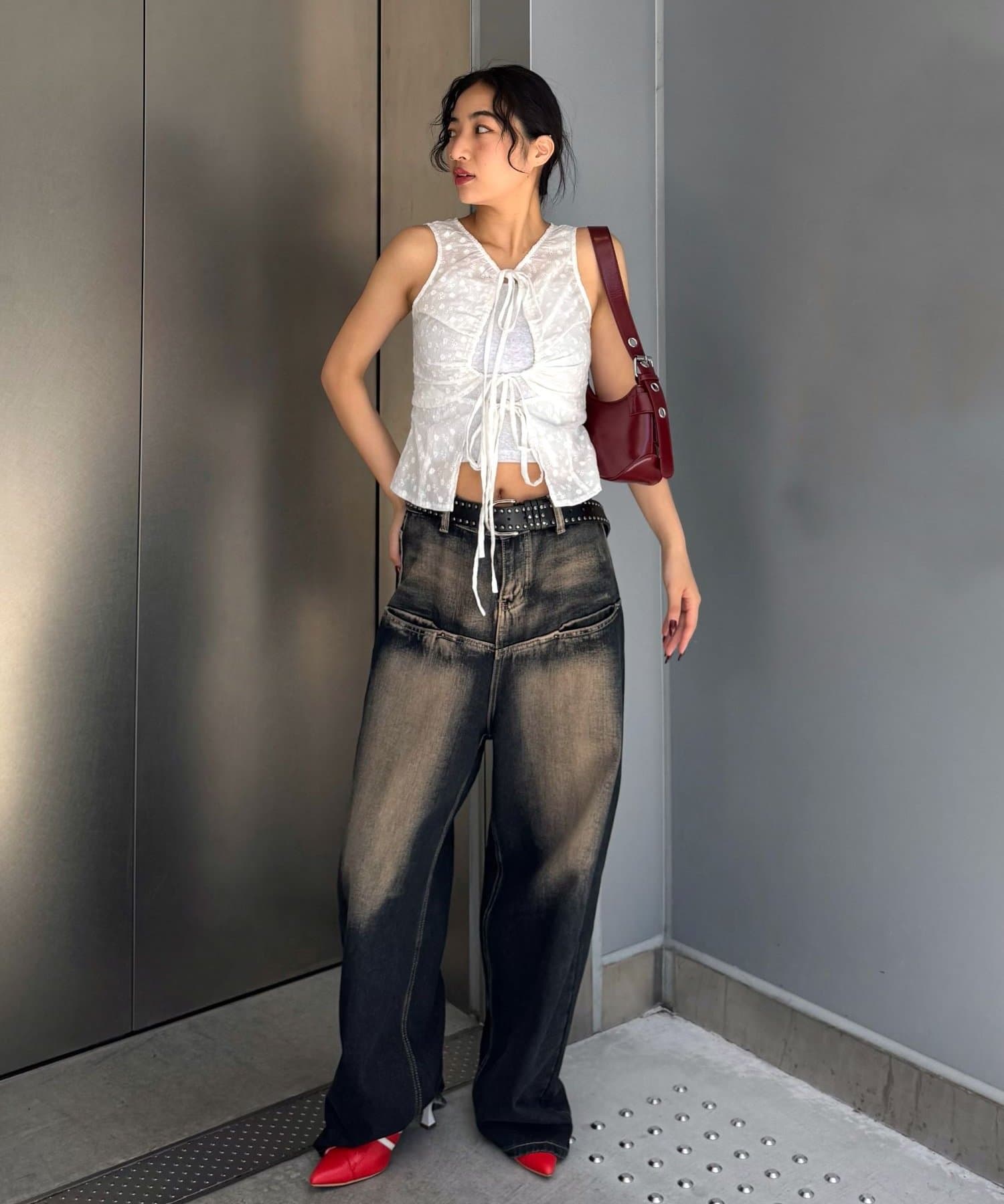 →トップスの素材感とデザインで少し甘さをだしながら、デニムパンツのカジュアルでバランスの取れたコーデになります。
