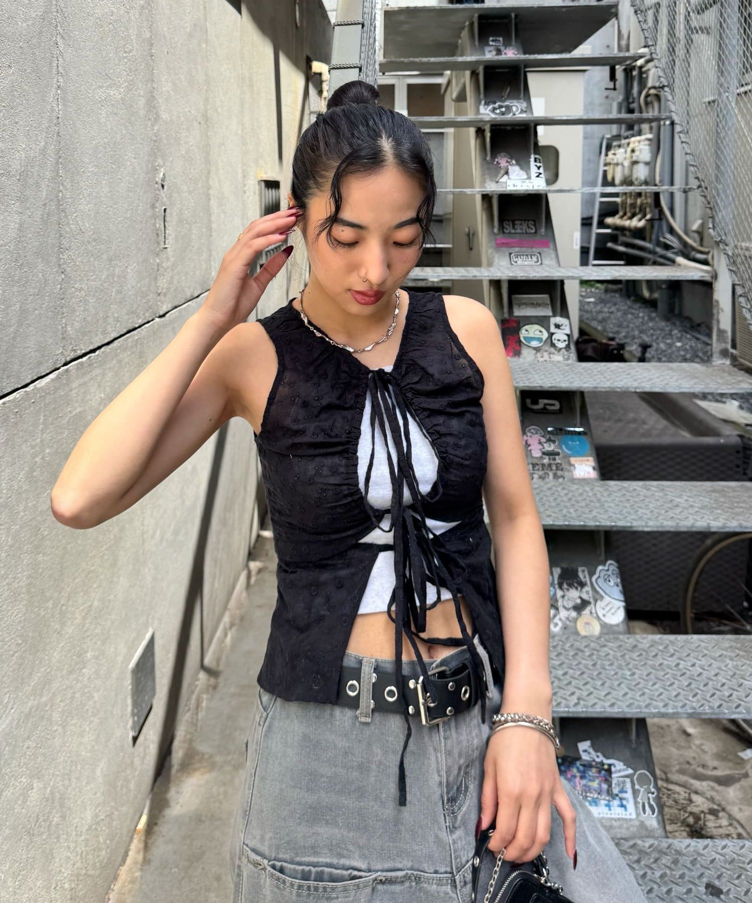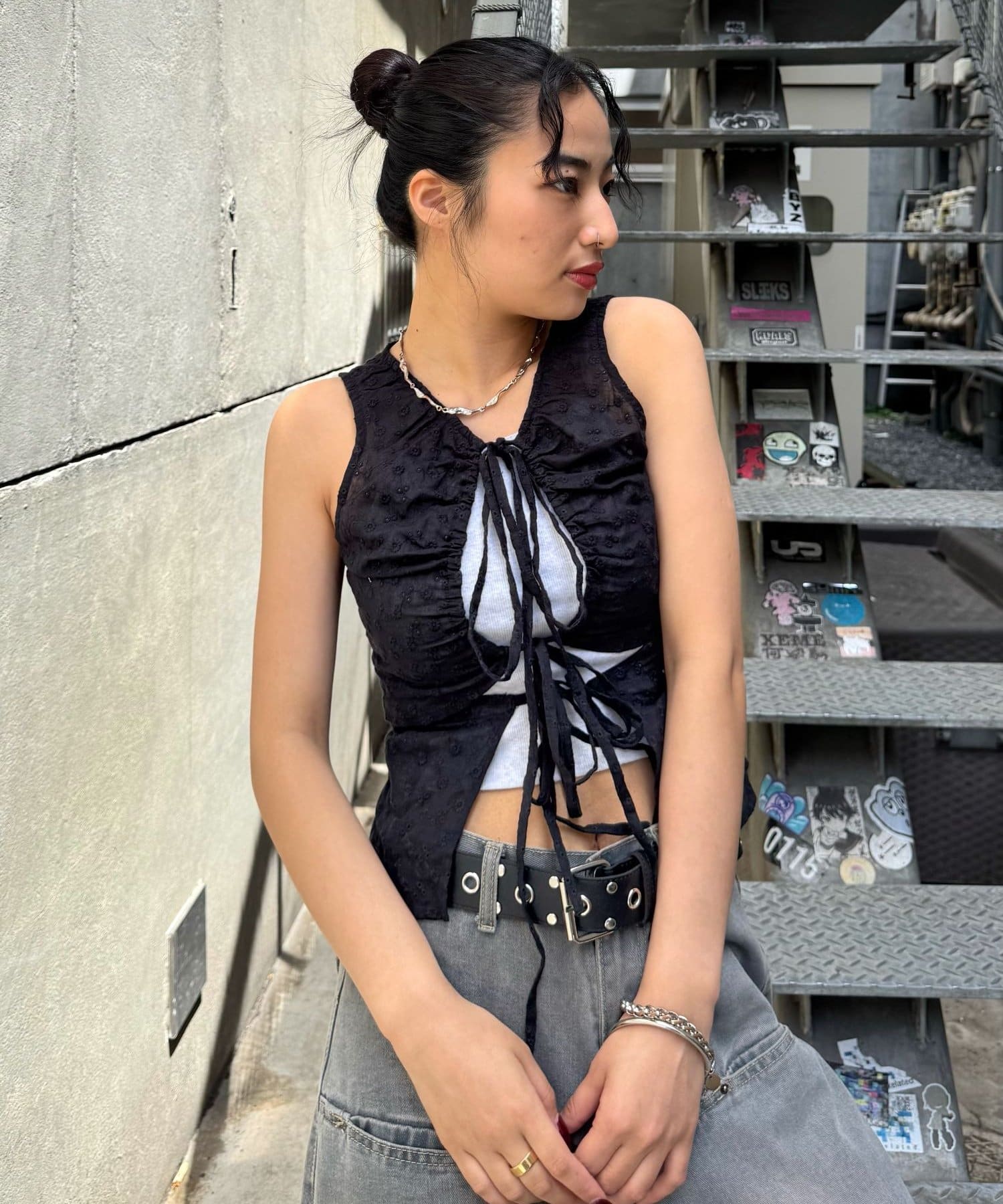 ・上の紐は首に巻いてチョーカー風にも出来るので、色んな着方を楽しめます。