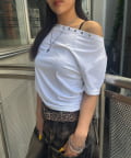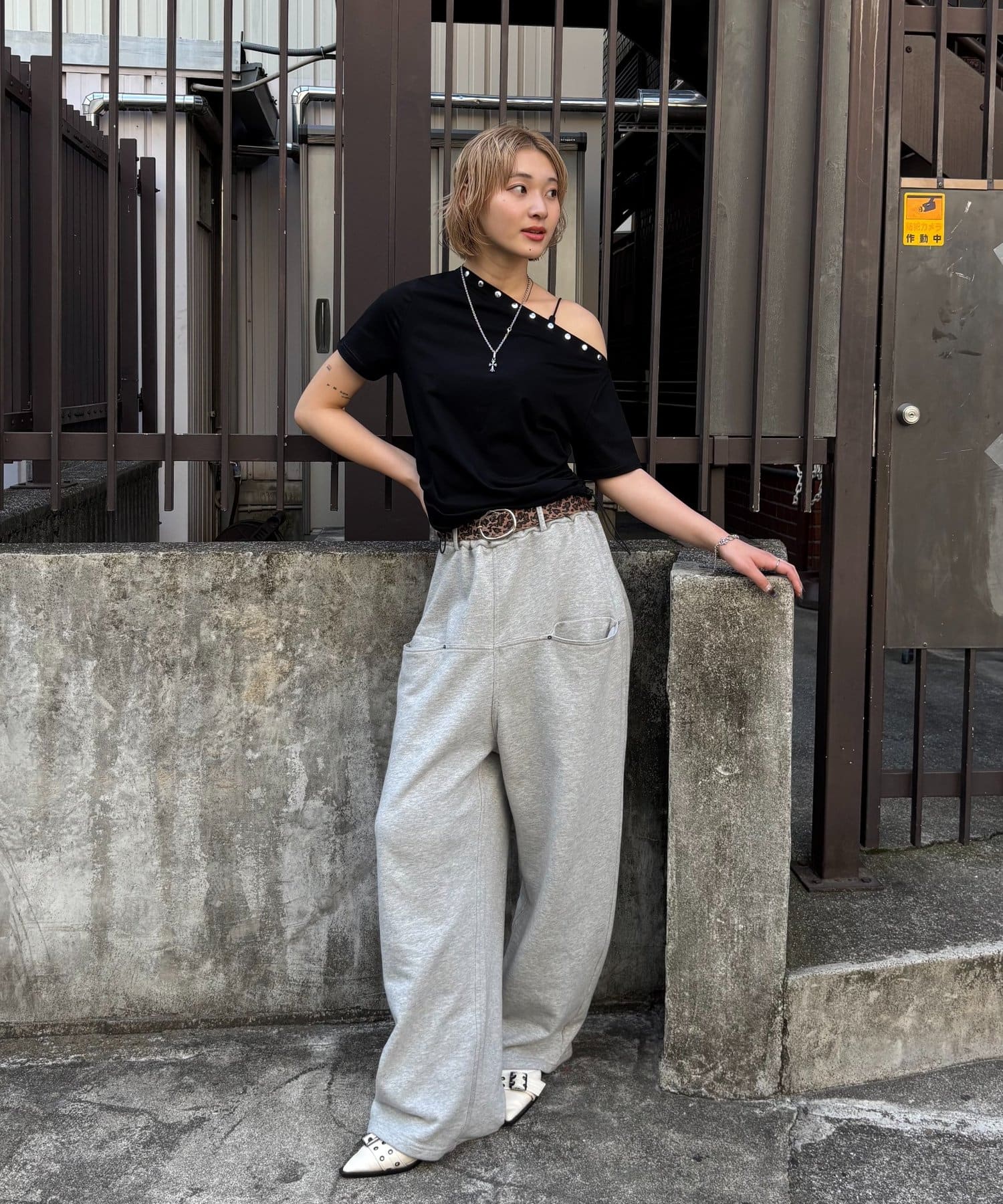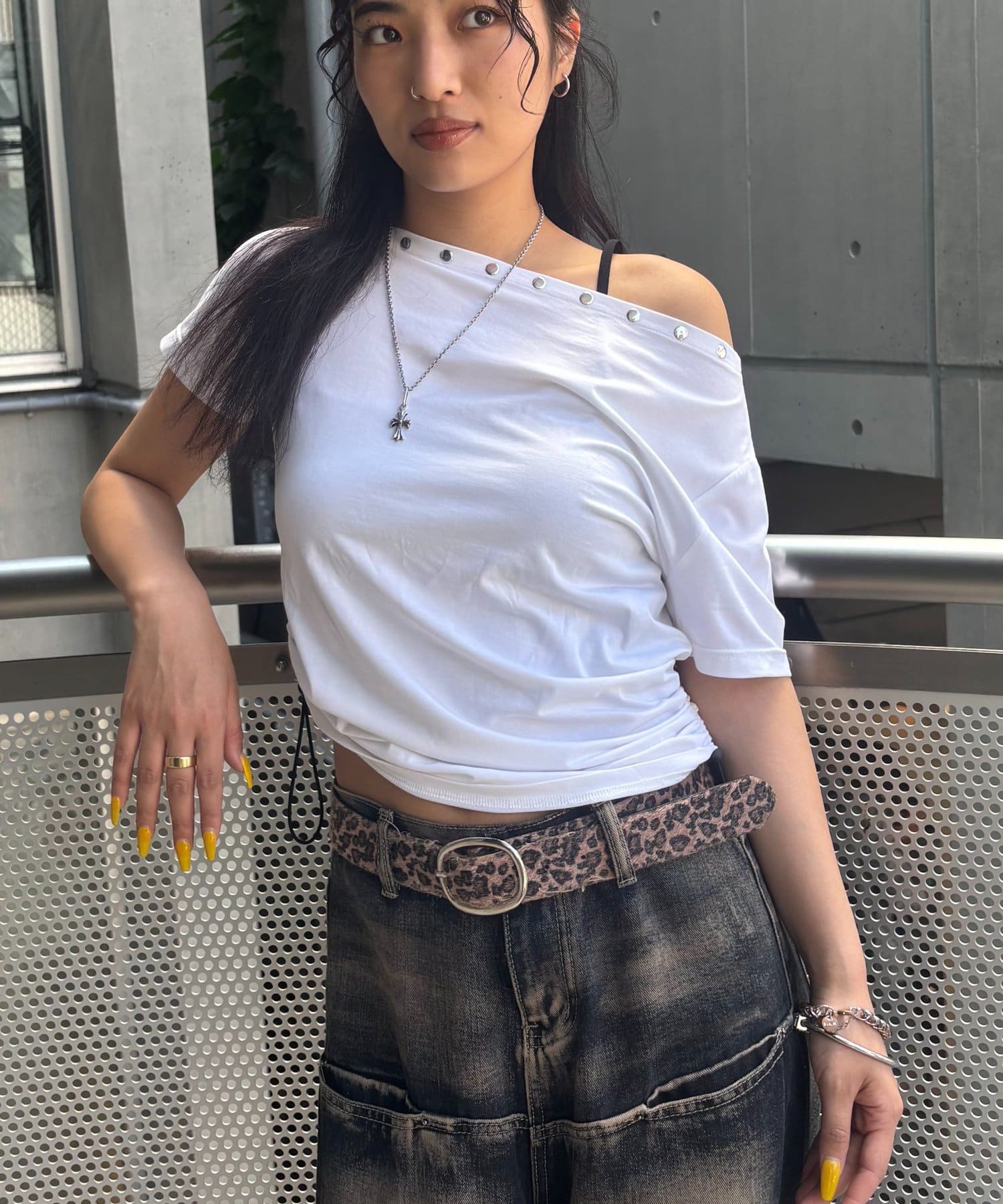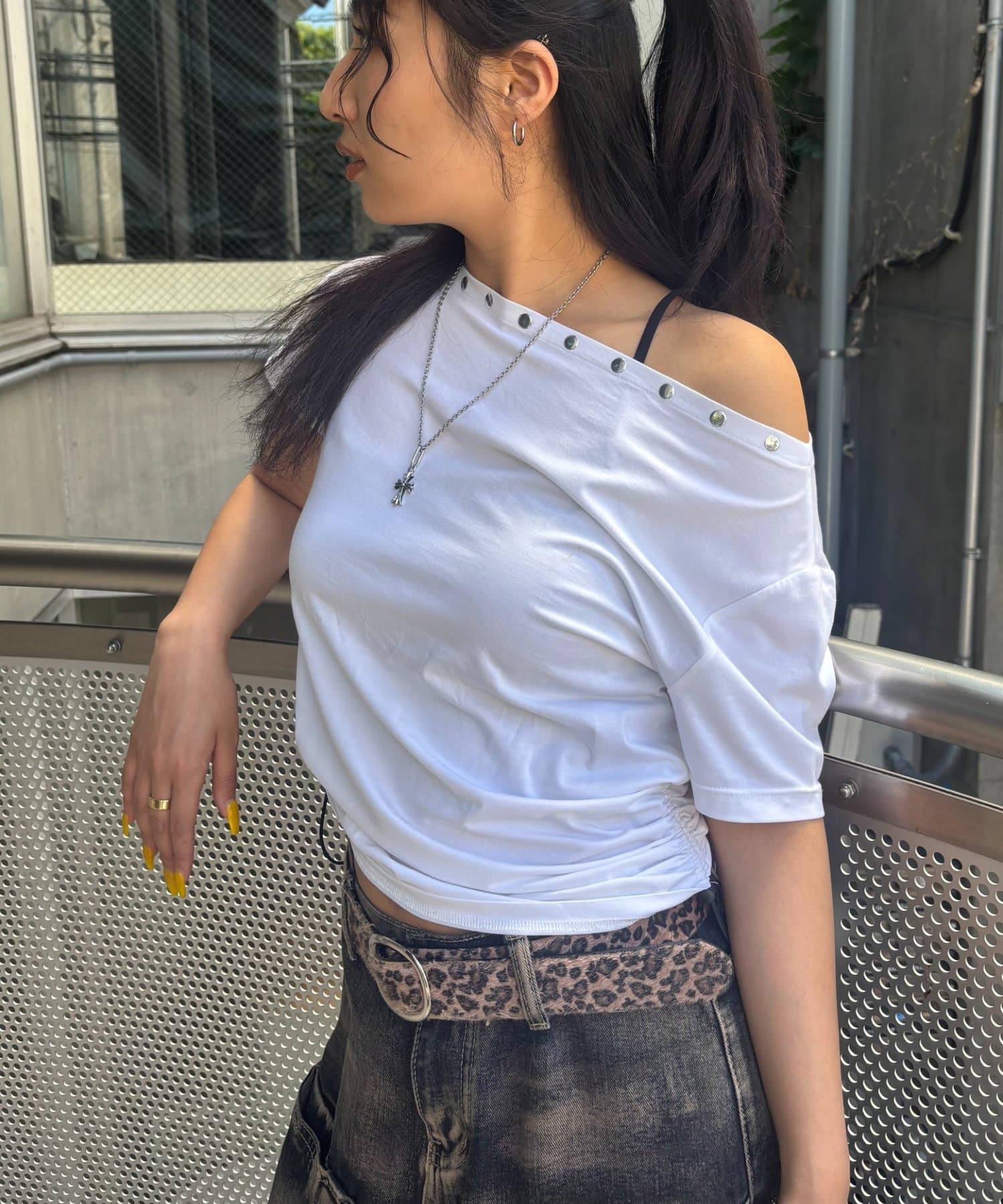 ・首元のスタッズのかっこ良さと、ワンショルダーの女性らしさ両方を兼ね備えたトップス。
